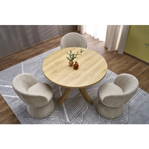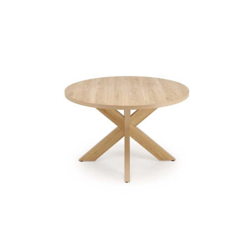 Stół Morus to elegancki i funkcjonalny mebel, który doskonale sprawdzi się w nowoczesnych oraz klasycznych wnętrzach. Jego okrągły blat wykonany jest z MDF-u okleinowanego melaminą, co zapewnia trwałość i odporność na codzienne użytkowanie. Naturalny kolor blatu podkreśla ciepły, minimalistyczny charakter stołu, nadając mu uniwersalny wygląd pasujący do różnych aranżacji.