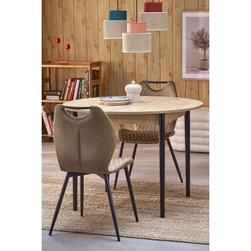 Stół Pivot to elegancki, okrągły stół rozkładany, który łączy funkcjonalność z nowoczesnym designem. Jego blat wykonany jest z płyty meblowej laminowanej, w odcieniu dębu artisan, co nadaje mu ciepły, naturalny wygląd, przypominający klasyczne drewno, ale z większą odpornością na uszkodzenia. Nogi stołu, w kontrastowym, głębokim czarnym kolorze, podkreślają nowoczesny charakter mebla. Stół Pivot doskonale sprawdza się zarówno w mniejszych przestrzeniach, jak i większych jadalniach, dzięki funkcji rozkładania, która pozwala na dostosowanie wielkości stołu do liczby gości. Solidna konstrukcja, wykonana z wysokiej jakości materiałów, zapewnia trwałość i stabilność, a stylowy wygląd pasuje do wielu nowoczesnych wnętrz.