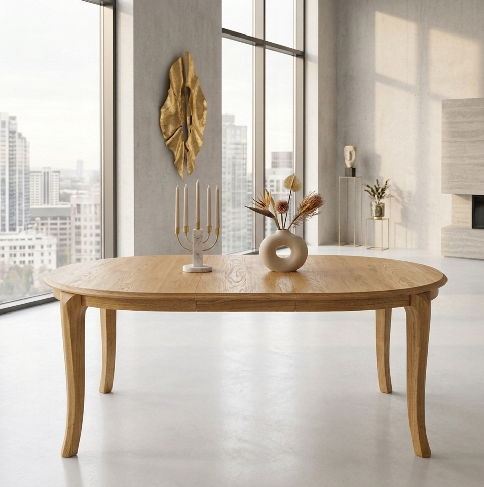 Konstrukcja stołu wykonana jest z drewna dębowego zaś blat pokryty jest wysokiej jakości fornirem dębowym .