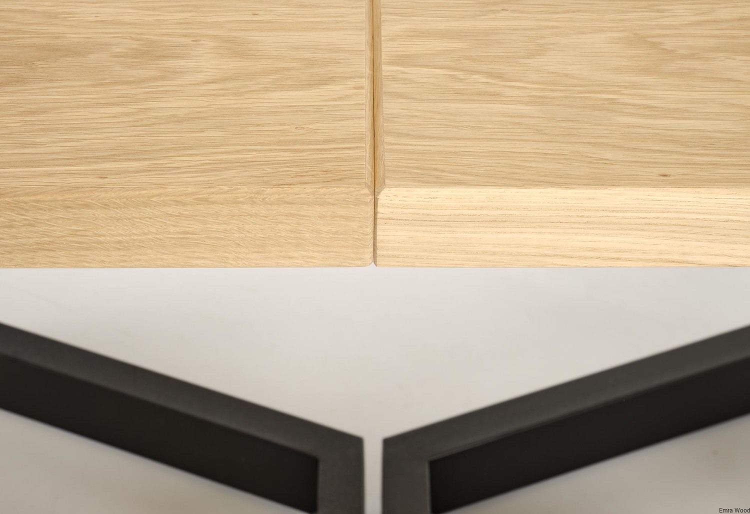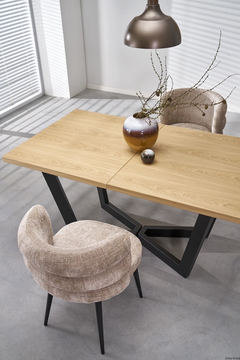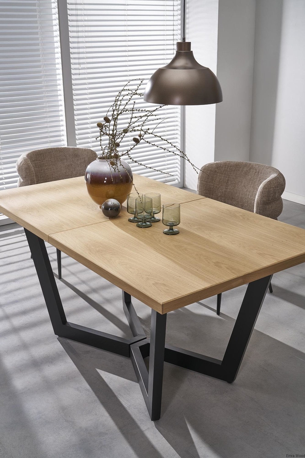 Stół Massive to nowa wersja istniejącego modelu, która wyróżnia się wyjątkową naturalną okleiną dębową na blacie. Charakteryzuje się solidną konstrukcją, typową dla stylu loftowego, co czyni go idealnym elementem nowoczesnych wnętrz. Blat wykonany jest z płyty fornirowanej, z obrzeżami z litego drewna, co dodaje mu elegancji i trwałości. Nogi stołu są zrobione z malowanej proszkowo stali w kolorze czarnym, co w połączeniu z dębowym blatem tworzy kontrast, podkreślając surowy, industrialny charakter mebla. Stół jest rozkładany, co sprawia, że jest praktyczny i funkcjonalny, idealny zarówno do mniejszych, jak i większych przestrzeni.