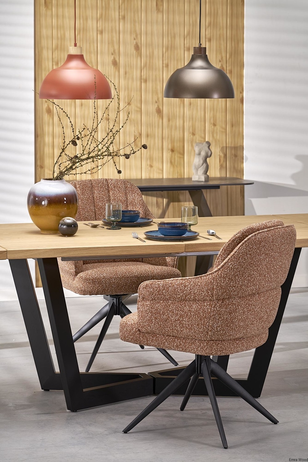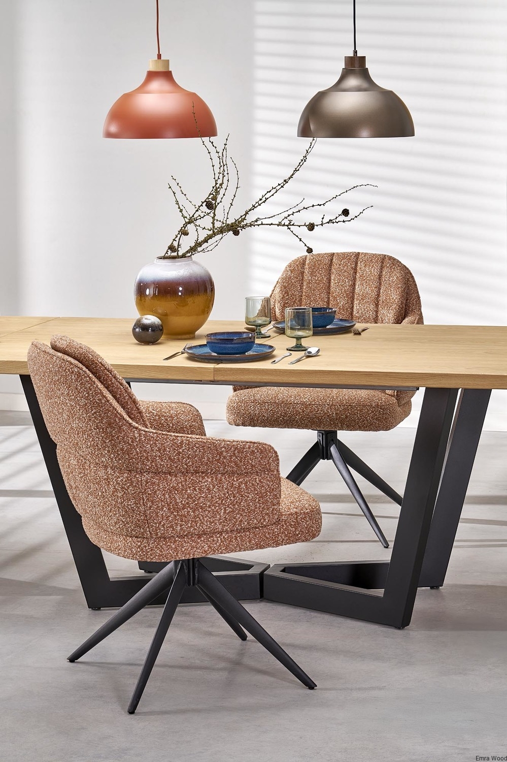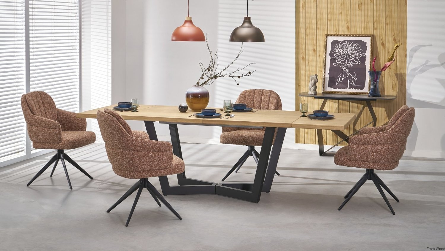 Stół Massive to nowa wersja istniejącego modelu, która wyróżnia się wyjątkową naturalną okleiną dębową na blacie. Charakteryzuje się solidną konstrukcją, typową dla stylu loftowego, co czyni go idealnym elementem nowoczesnych wnętrz. Blat wykonany jest z płyty fornirowanej, z obrzeżami z litego drewna, co dodaje mu elegancji i trwałości. Nogi stołu są zrobione z malowanej proszkowo stali w kolorze czarnym, co w połączeniu z dębowym blatem tworzy kontrast, podkreślając surowy, industrialny charakter mebla. Stół jest rozkładany, co sprawia, że jest praktyczny i funkcjonalny, idealny zarówno do mniejszych, jak i większych przestrzeni.