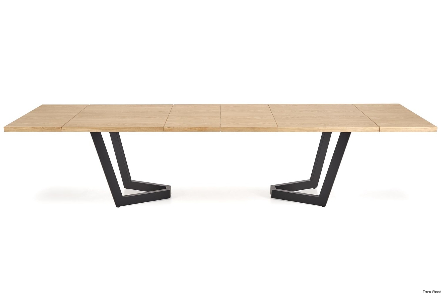 stół rozkładany, wymiary: 160-250(340)/90/77 cm, materiał: blat - płyta fornirowana, na obrzeżach drewno lite, nogi - stal malowana proszkowo, kolor: blat – dąb naturalny, nogi - czarny, * w opcji przedłużki do blatów MASSIVE 2 (wymiary: 45x90 cm - 2 szt.