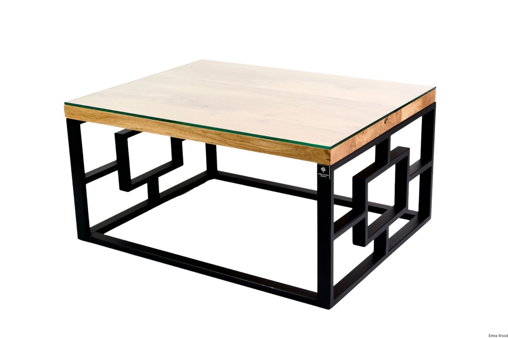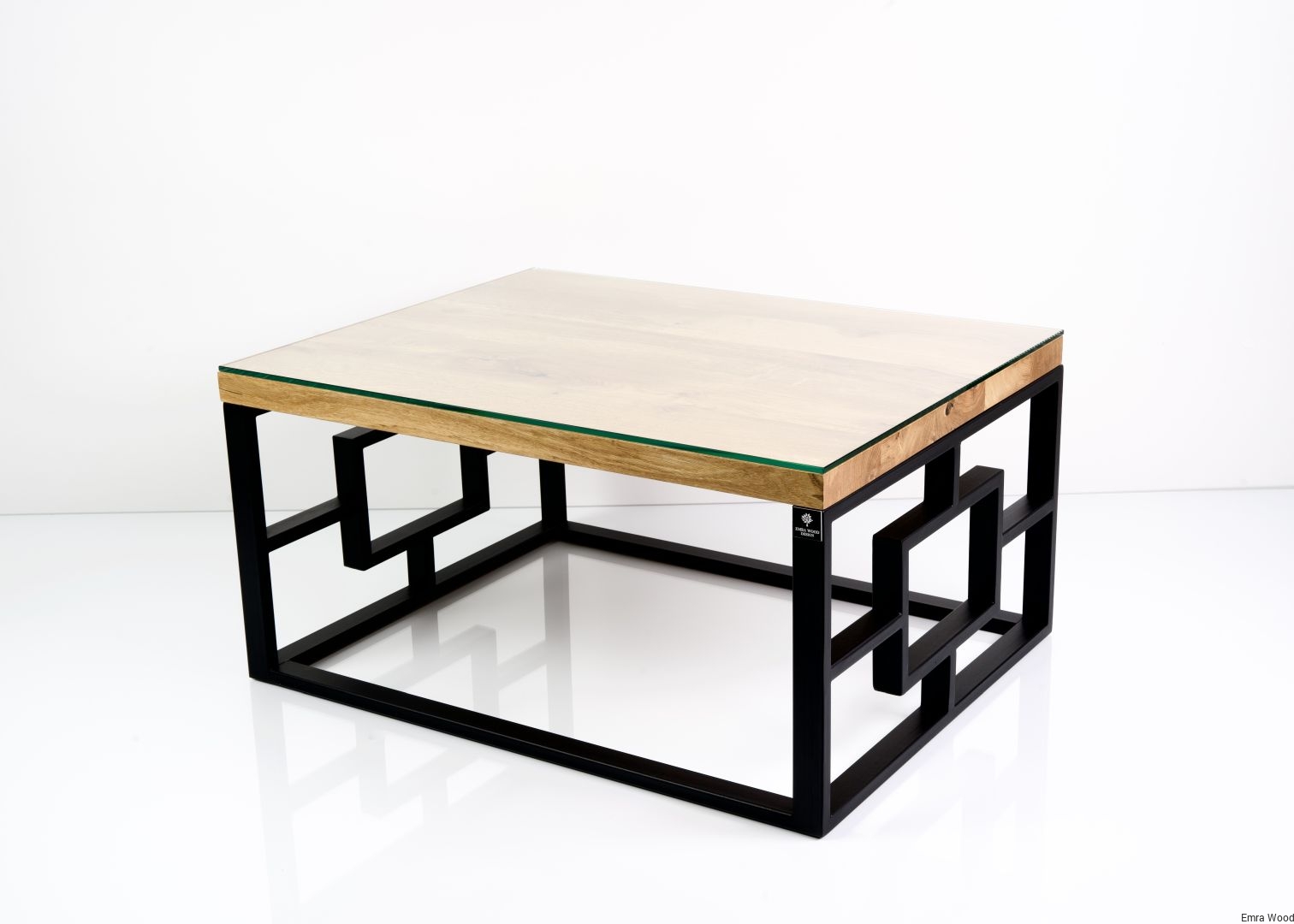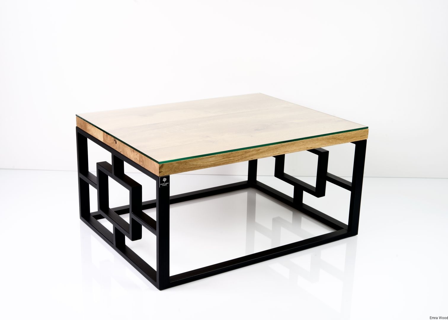 STOLIK KAWOWY / Stelaż Stal Czarna Malowana Proszkowo / Blat Lite Drewno DĄB z Szybą model STK-104