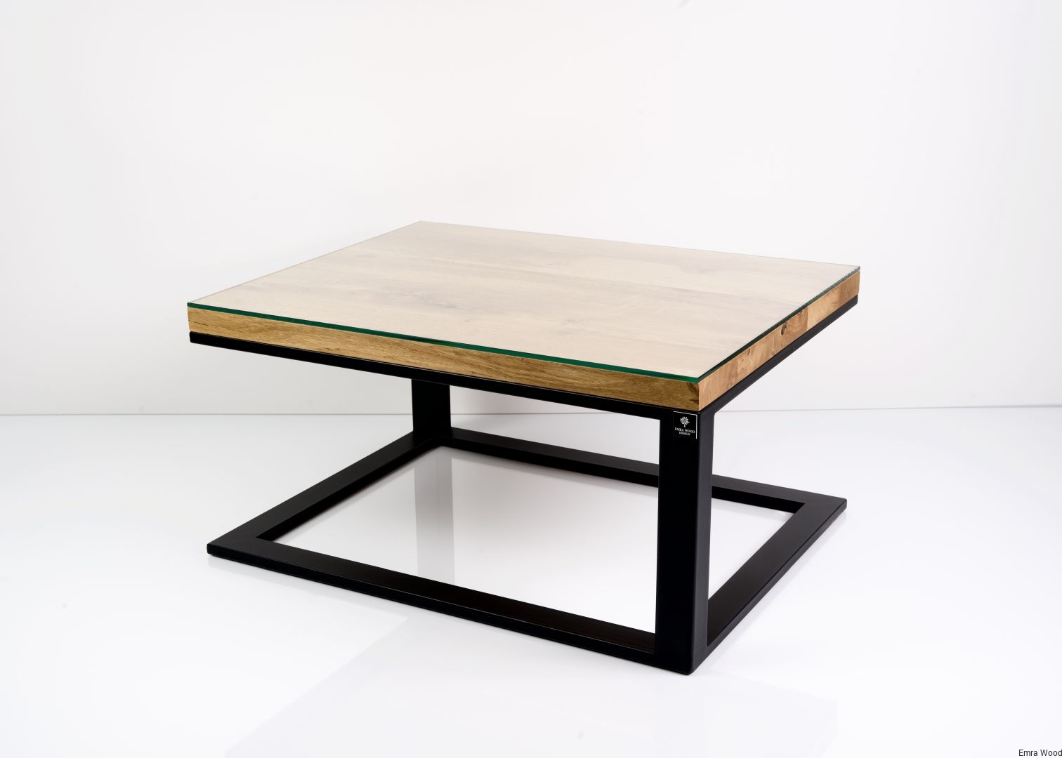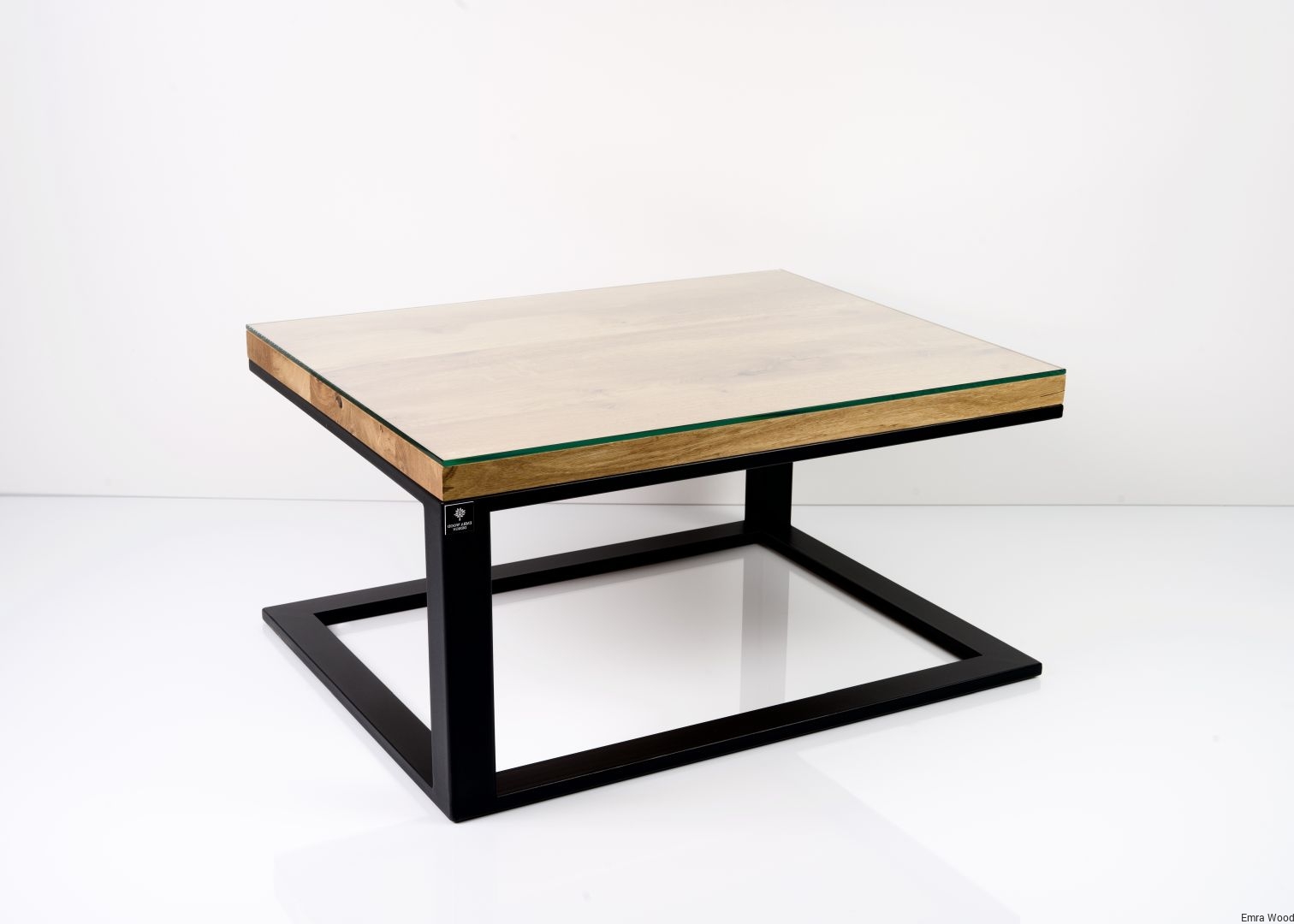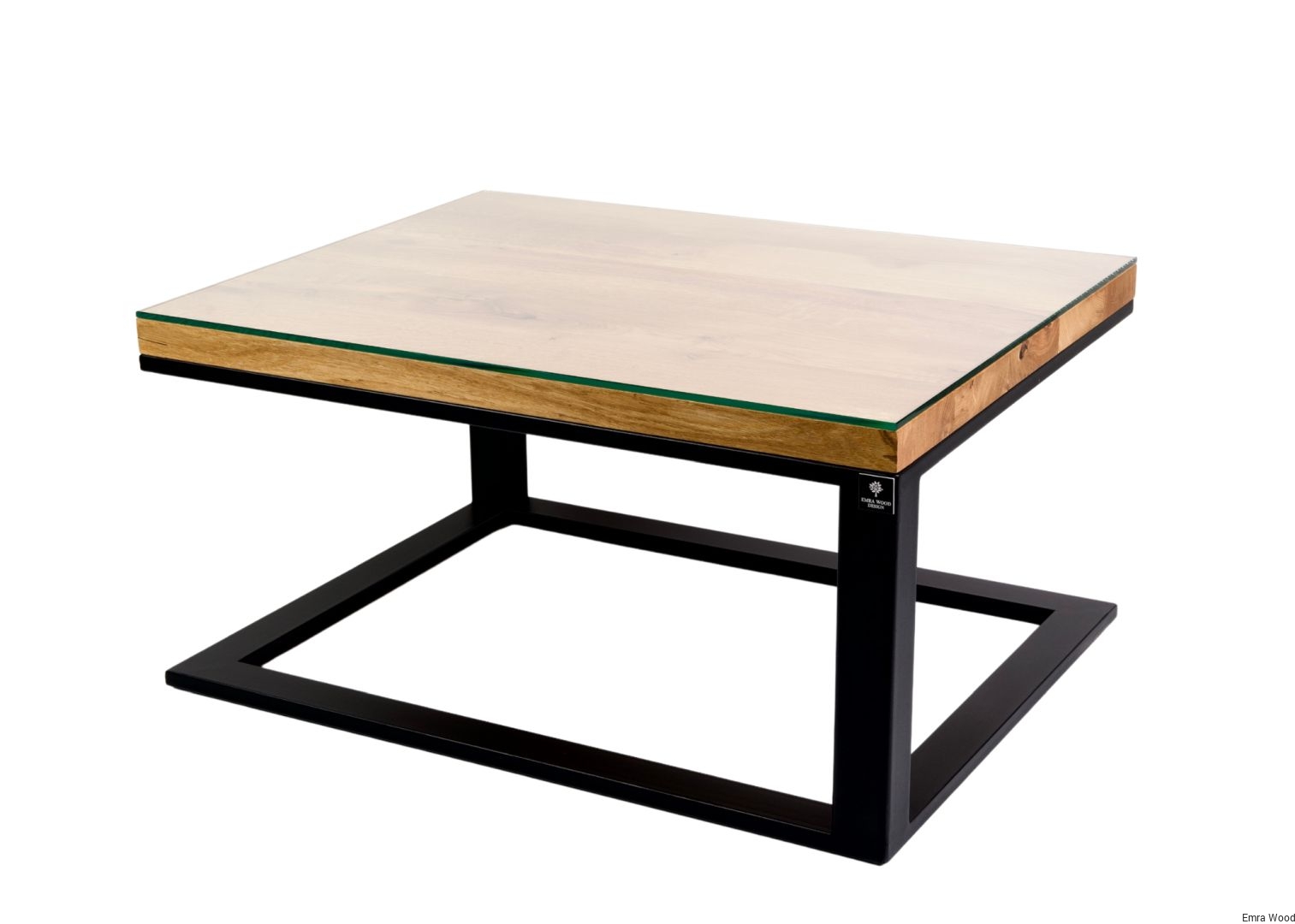 STOLIK KAWOWY / Stelaż Stal Czarna Malowana Proszkowo / Blat Lite Drewno DĄB z Szybą model STK-134