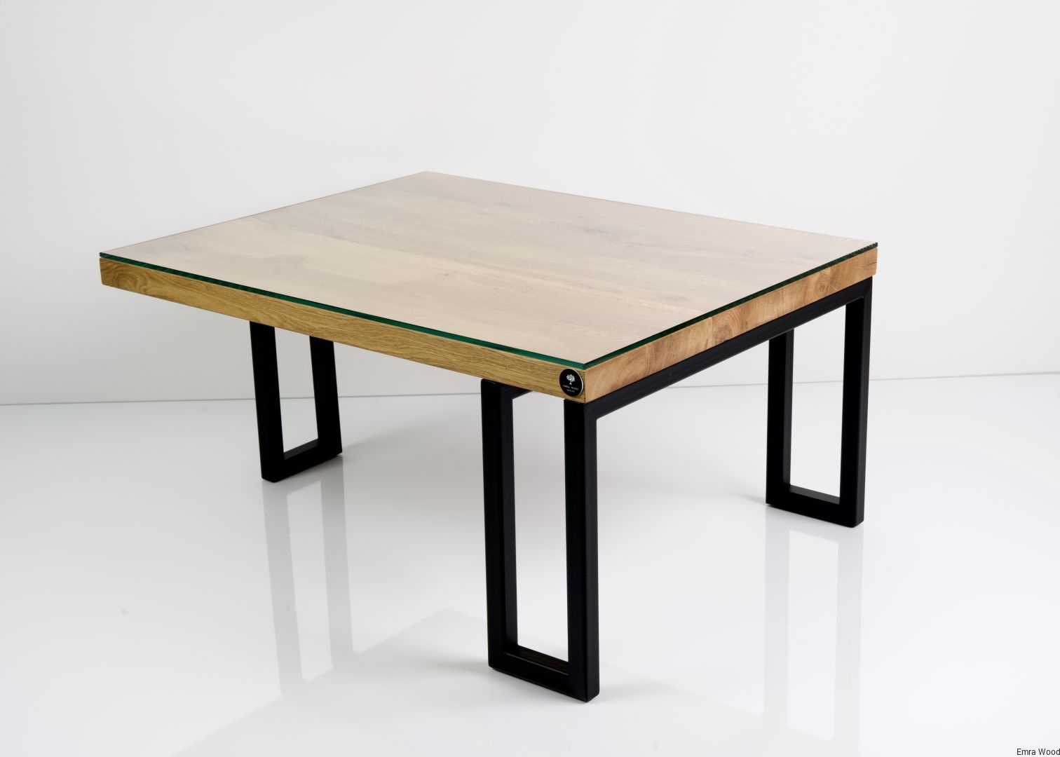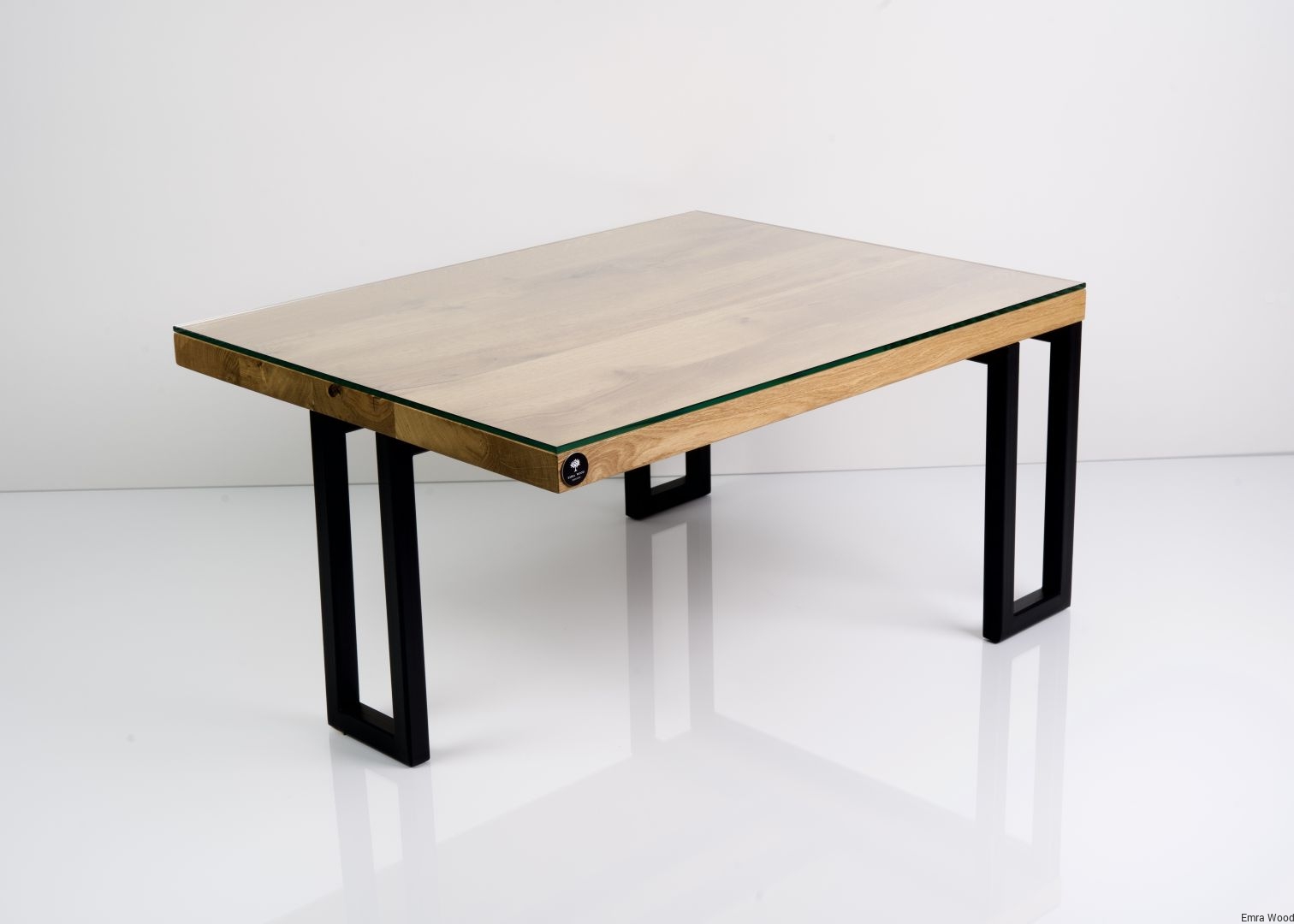 STOLIK KAWOWY / Stelaż Stal Czarna Malowana Proszkowo / Blat Lite Drewno DĄB z Szybą model STK-138