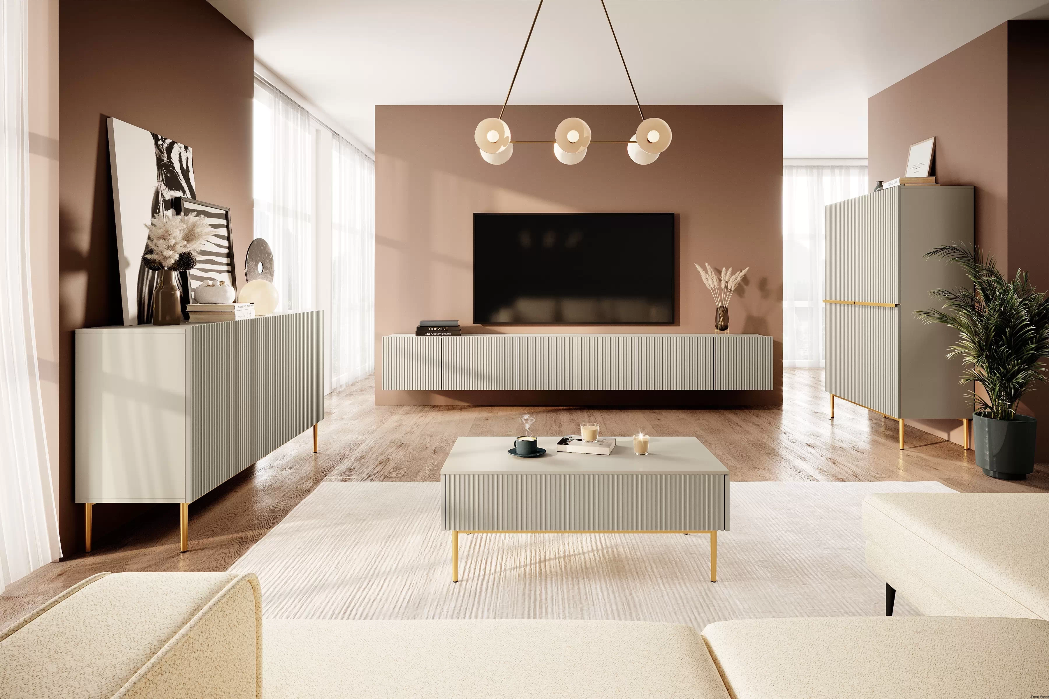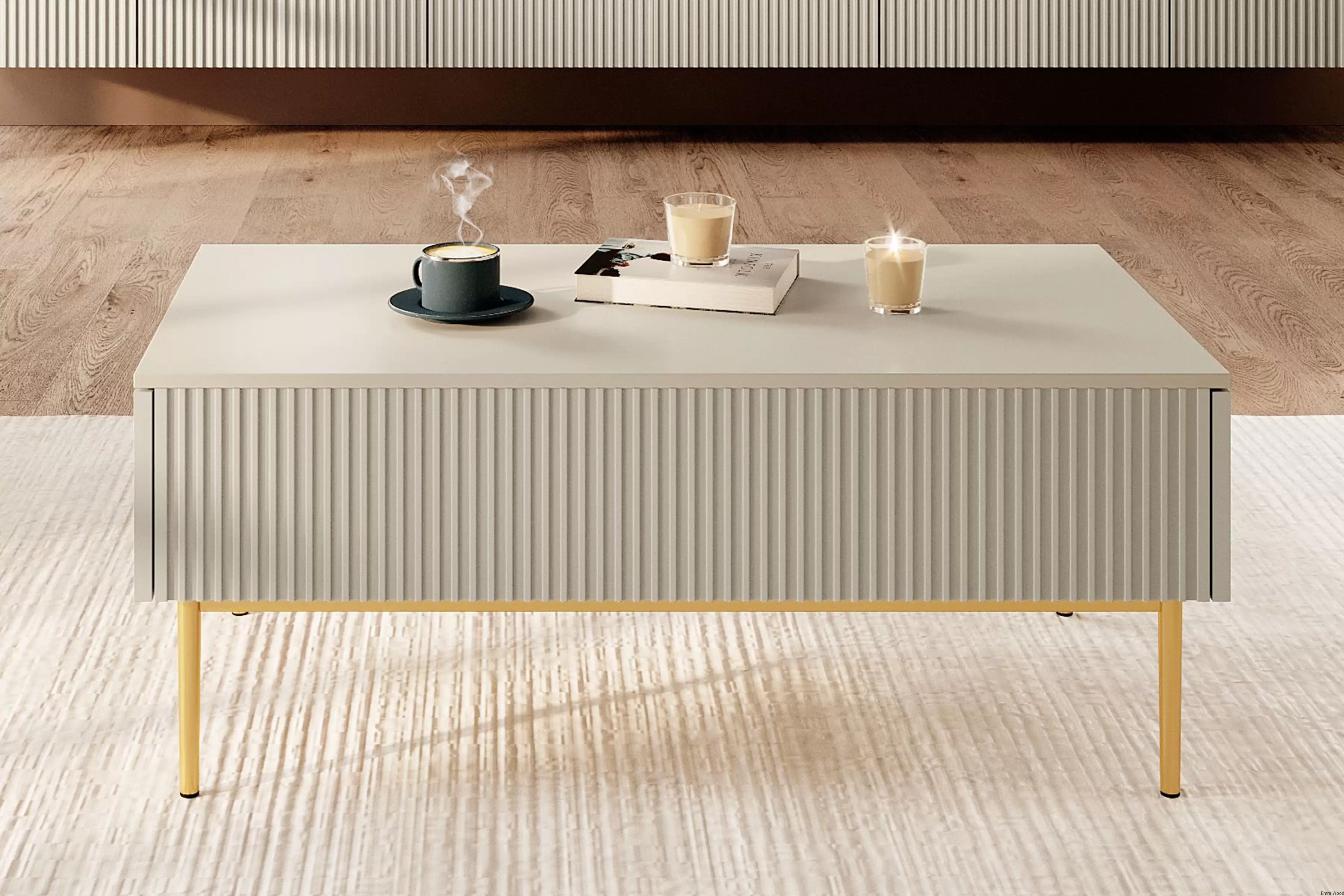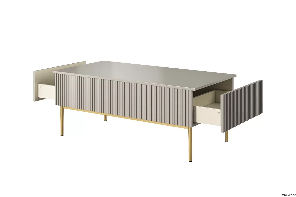 Neutralna kolorystyka kaszmiru sprawia, że ten stolik kawowy będzie doskonałym uzupełnieniem każdego wnętrza. Złote metalowe nóżki dodają mu elegancji, a ryflowane fronty szuflad dodają charakteru i osobowości. Tworzą one interesujący wizualny efekt, który sprawi, że dopasujesz mebel do wielu aranżacji.