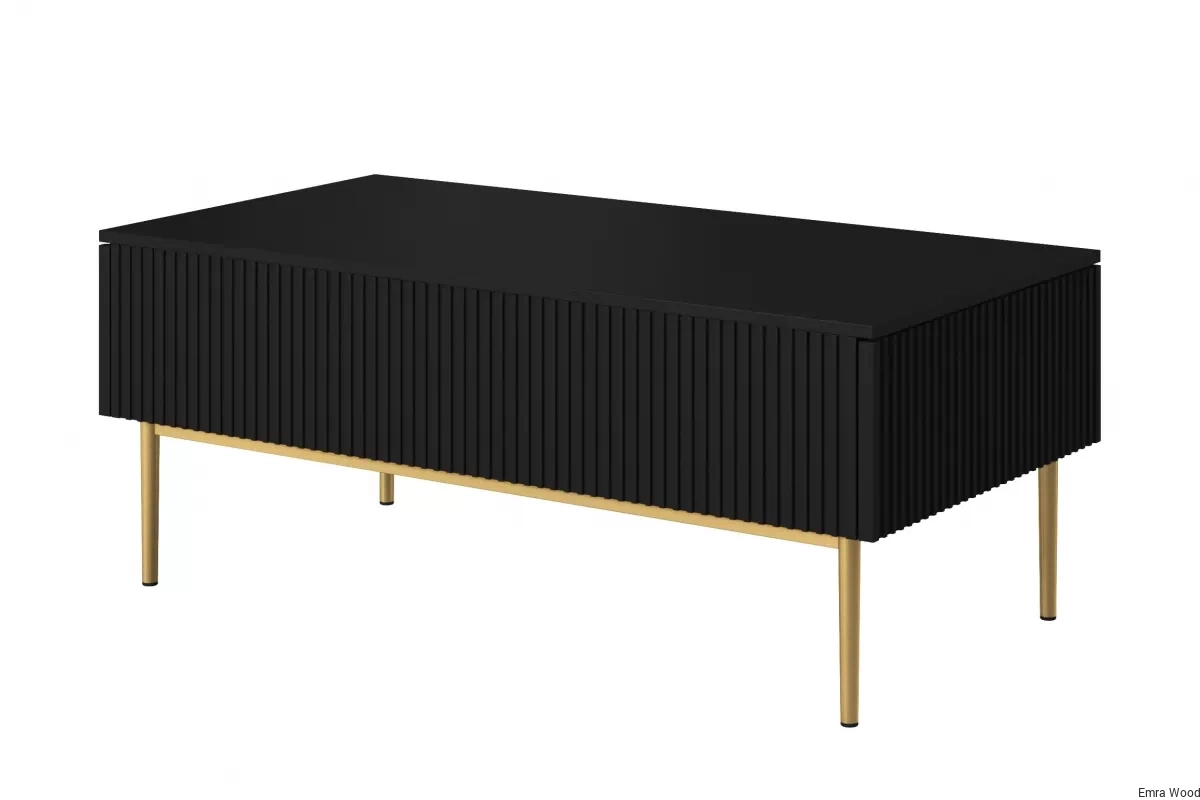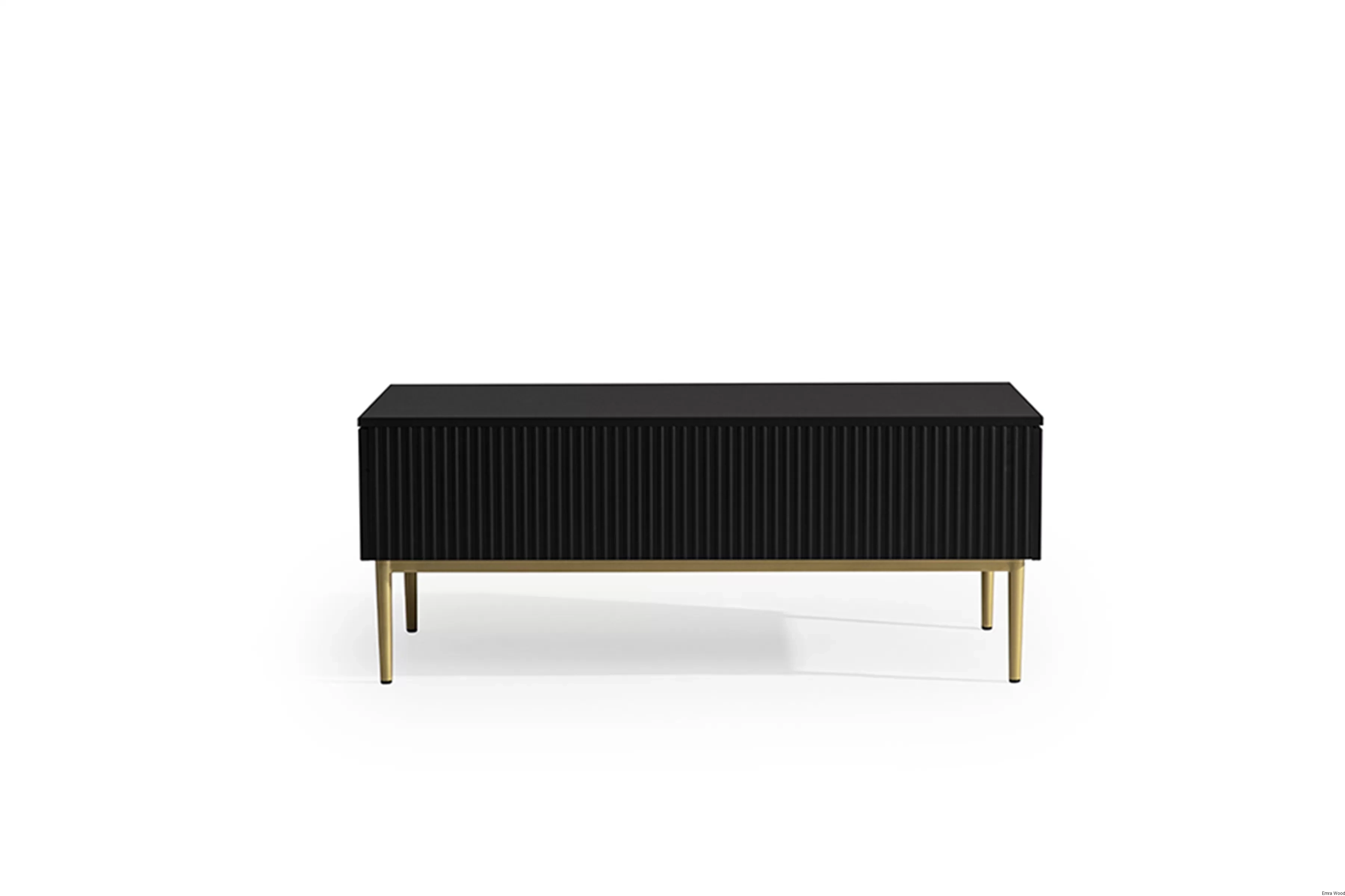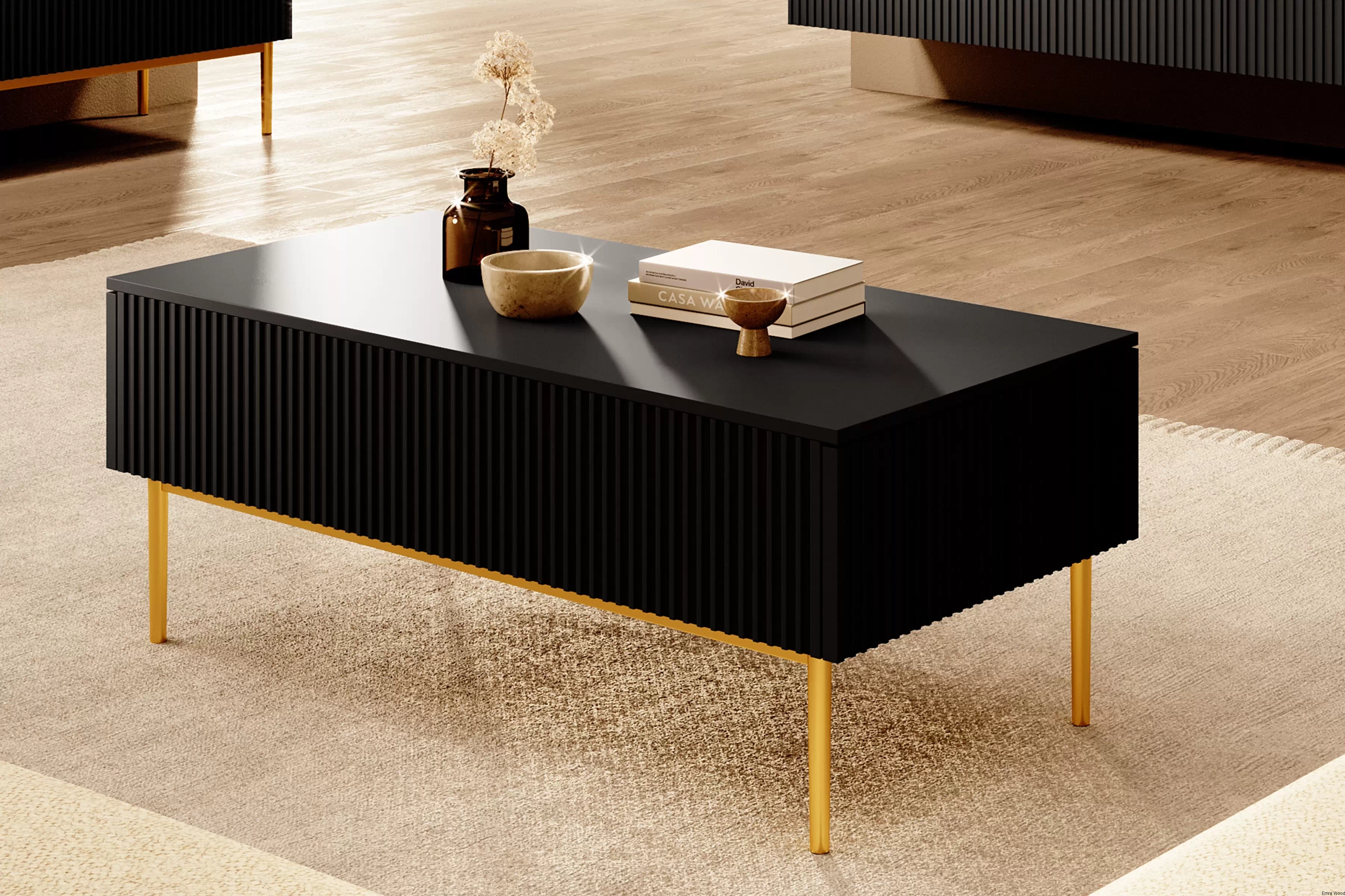 Stolik kawowy Nicole zaskakuje swoją zdecydowaną, ciemną kolorystyką. Czarny mat na froncie i korpusie wprowadza do pomieszczenia niepowtarzalny, elegancki charakter. Złote metalowe nóżki stanowią eleganckie dopełnienie konstrukcji, dodając meblowi niebanalnego wyglądu.