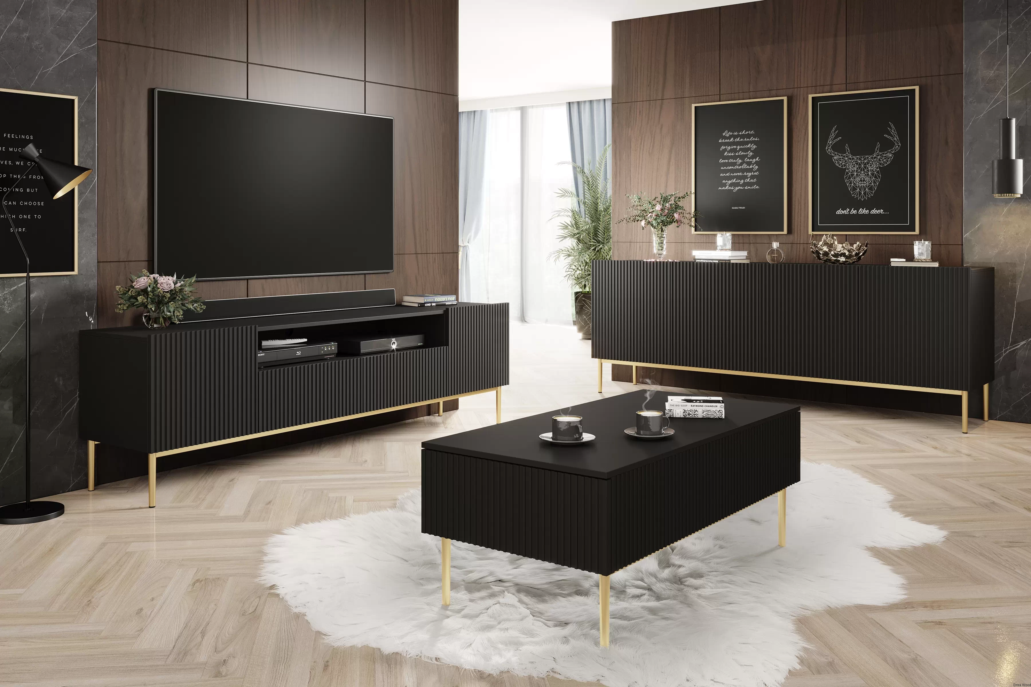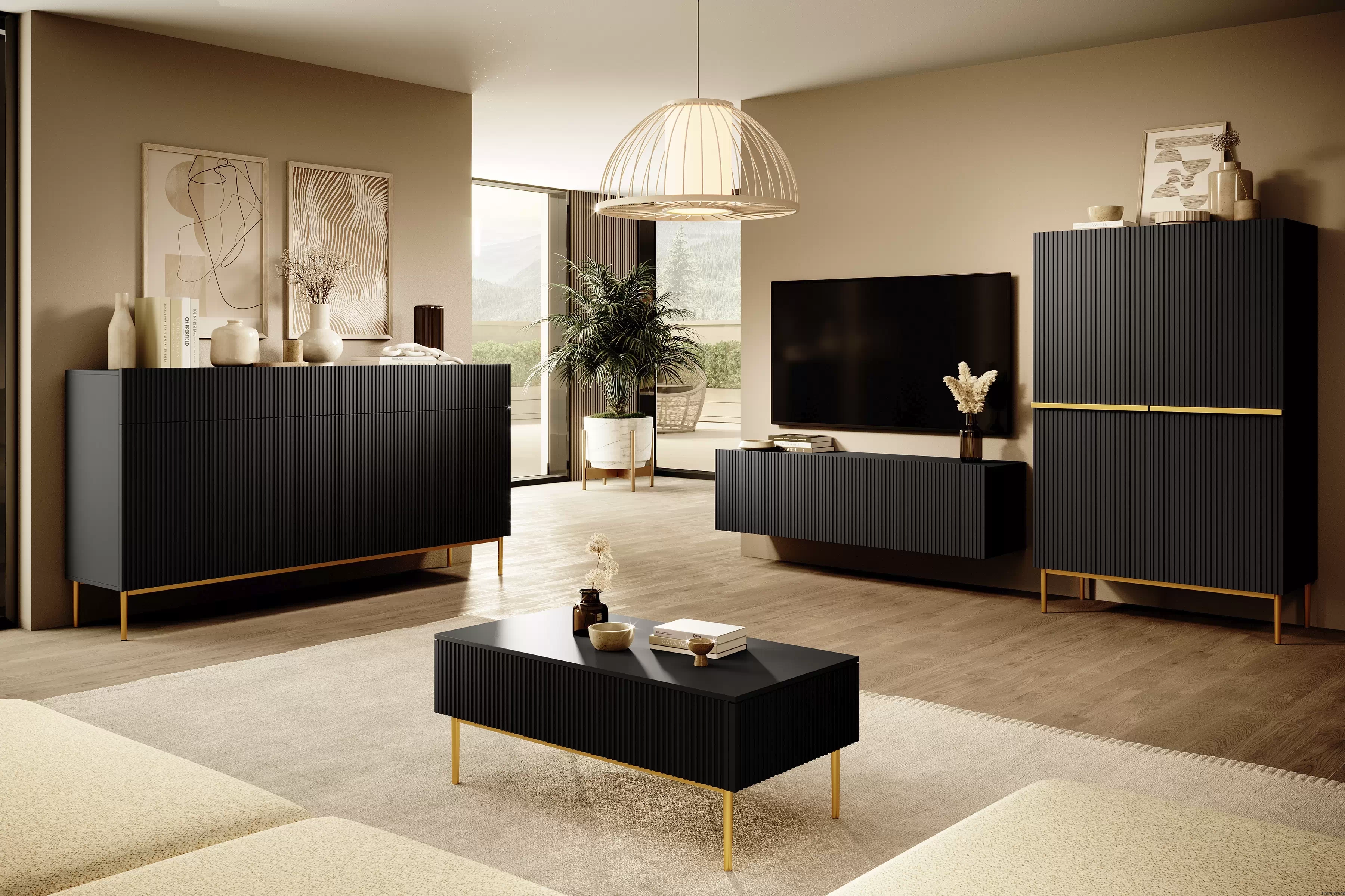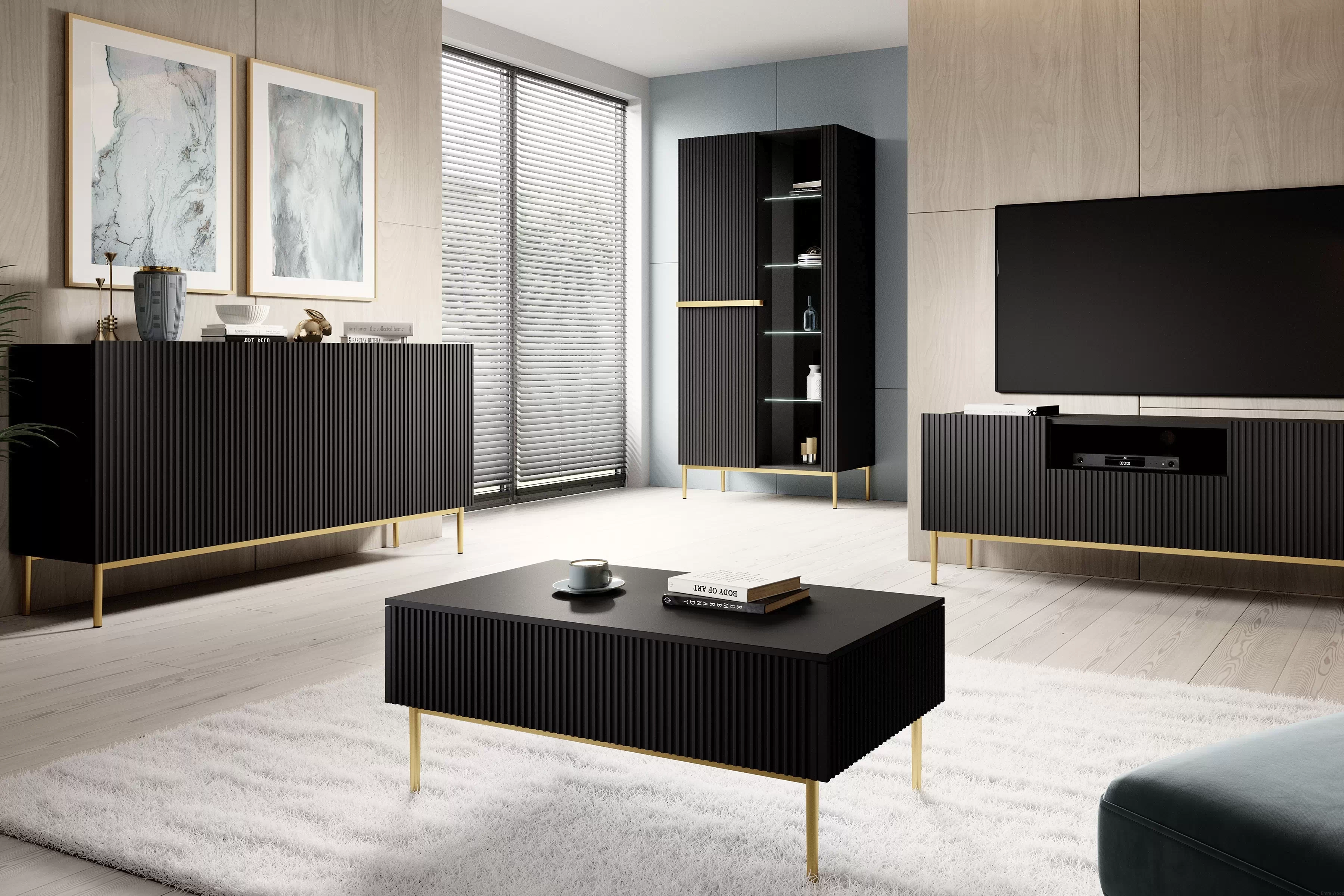 Idealnie wpisze się w nowoczesne, loftowe wnętrza, ale także w te o bardziej klasycznym charakterze. Czarny mat na froncie i korpusie harmonijnie skomponuje się z innymi meblami, a złote metalowe nóżki stanowią eleganckie dopełnienie konstrukcji.