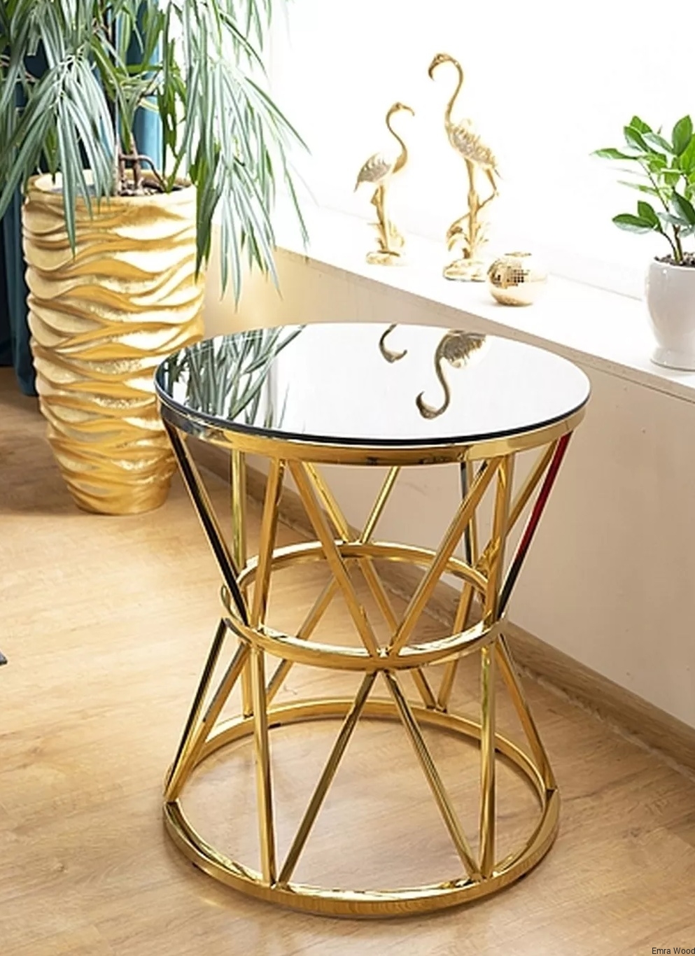 Ława, blat: szkło hartowane dymione, stelaż: stal nierdzewna, kolor: złoty.