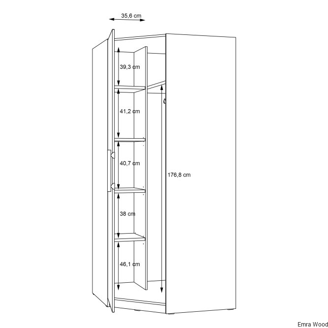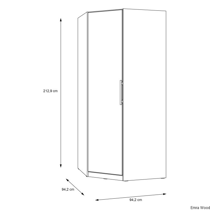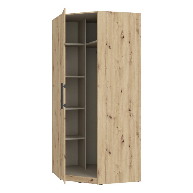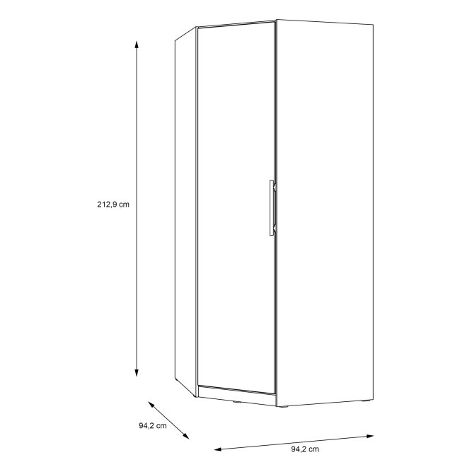 Szafa narożna z kolekcji CADIXO doskonale sprawdzi się we wnętrzach urządzonych w stylu nowoczesnym, w szczególności w takich pomieszczeniach, jak sypialnia. Ma dobrze zorganizowaną przestrzeń: drążek ubraniowy i 5 półek. Dzięki takiemu układowi, w szafie możesz przechowywać różnorodne rzeczy - nie tylko odzież, lecz także sprzęt sportowy i hobbistyczny.