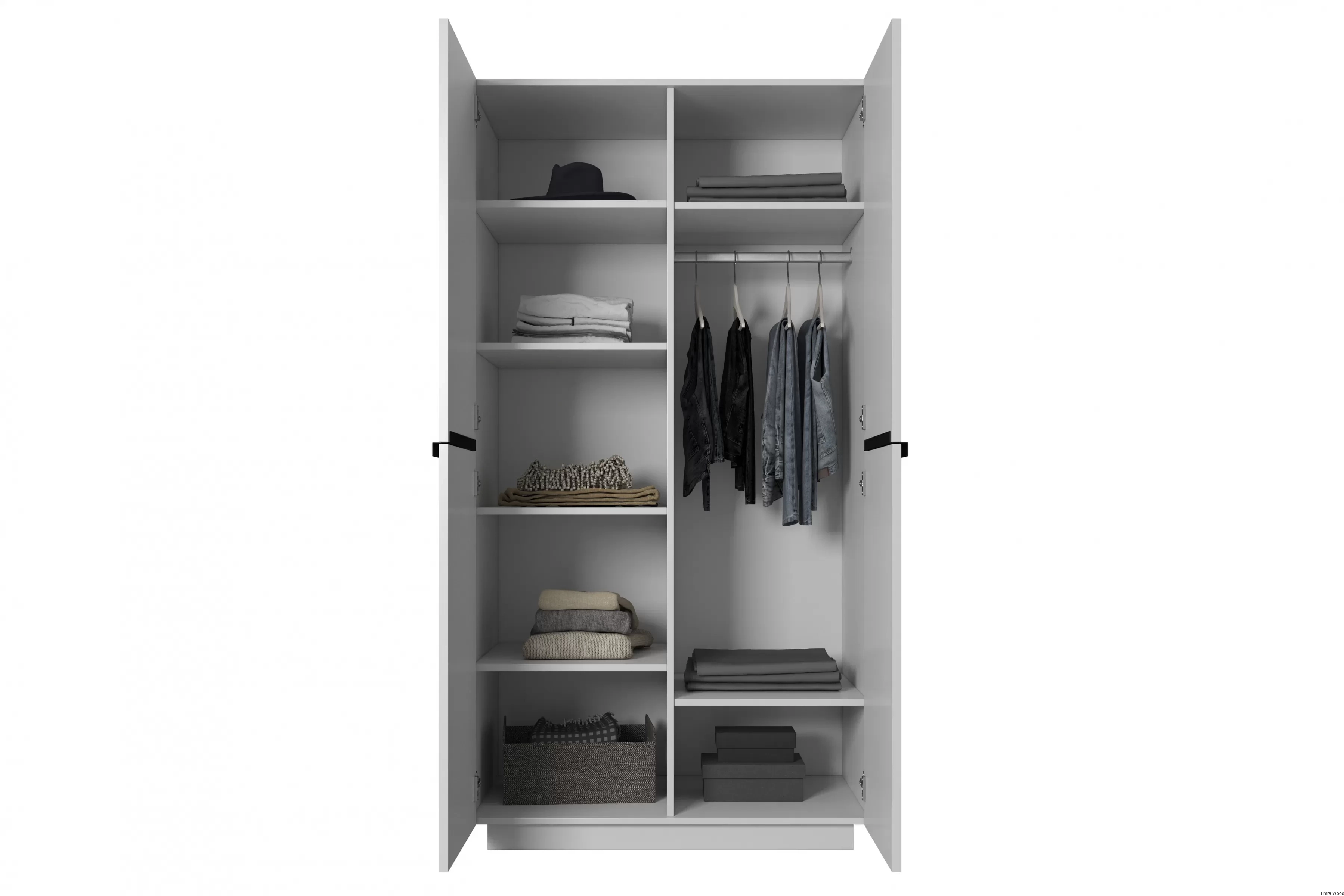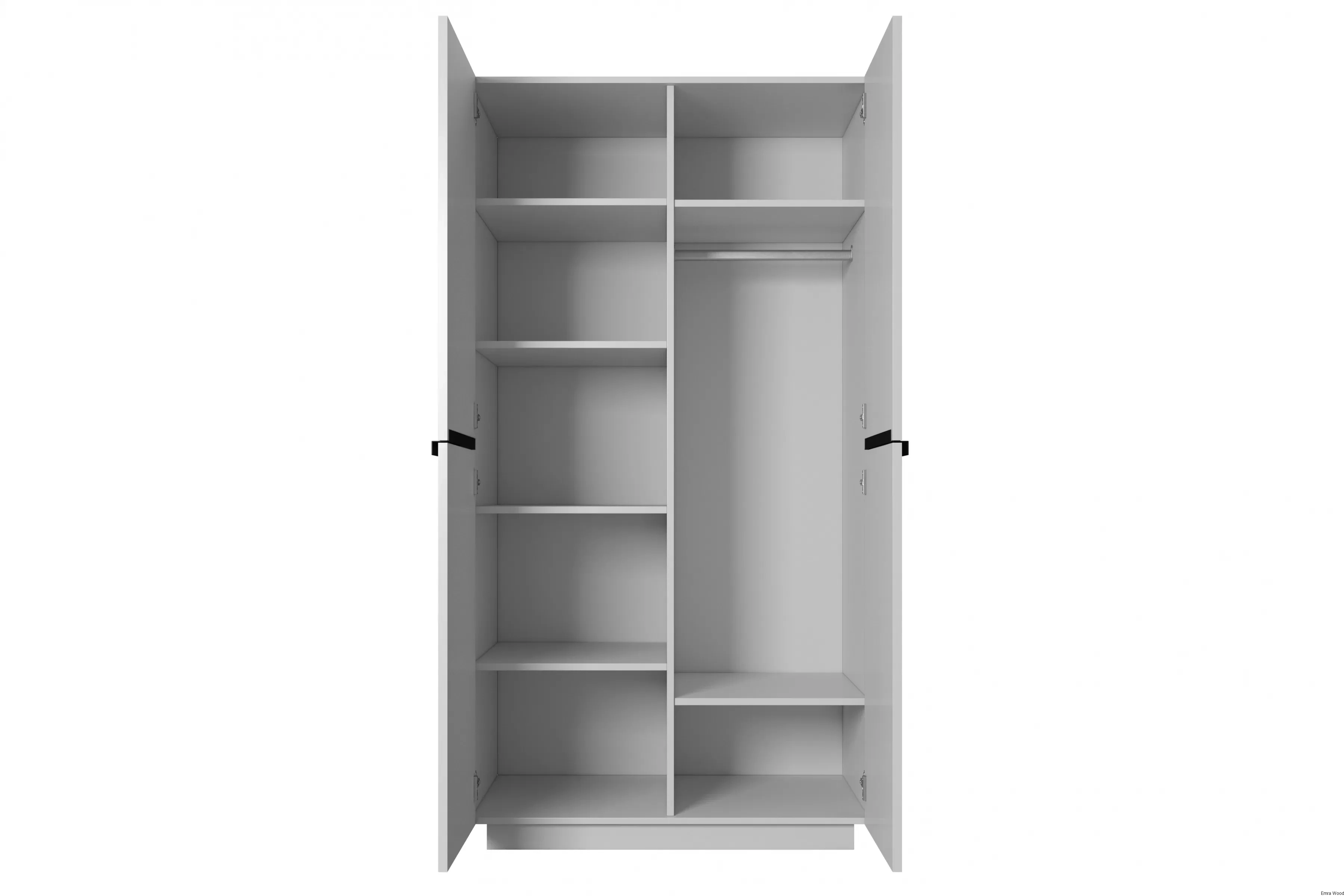 Wykonana z wysokiej jakości płyty laminowanej i MDF, ta szafa jest niezwykle trwała i stabilna. Jej stalowe zawiasy z cichym domykiem oraz system otwierania drzwi zapewniają komfort i wygodę użytkowania. Szafa oferuje dużo miejsca do przechowywania dzięki sześciu półkom i drążkowi na ubrania.