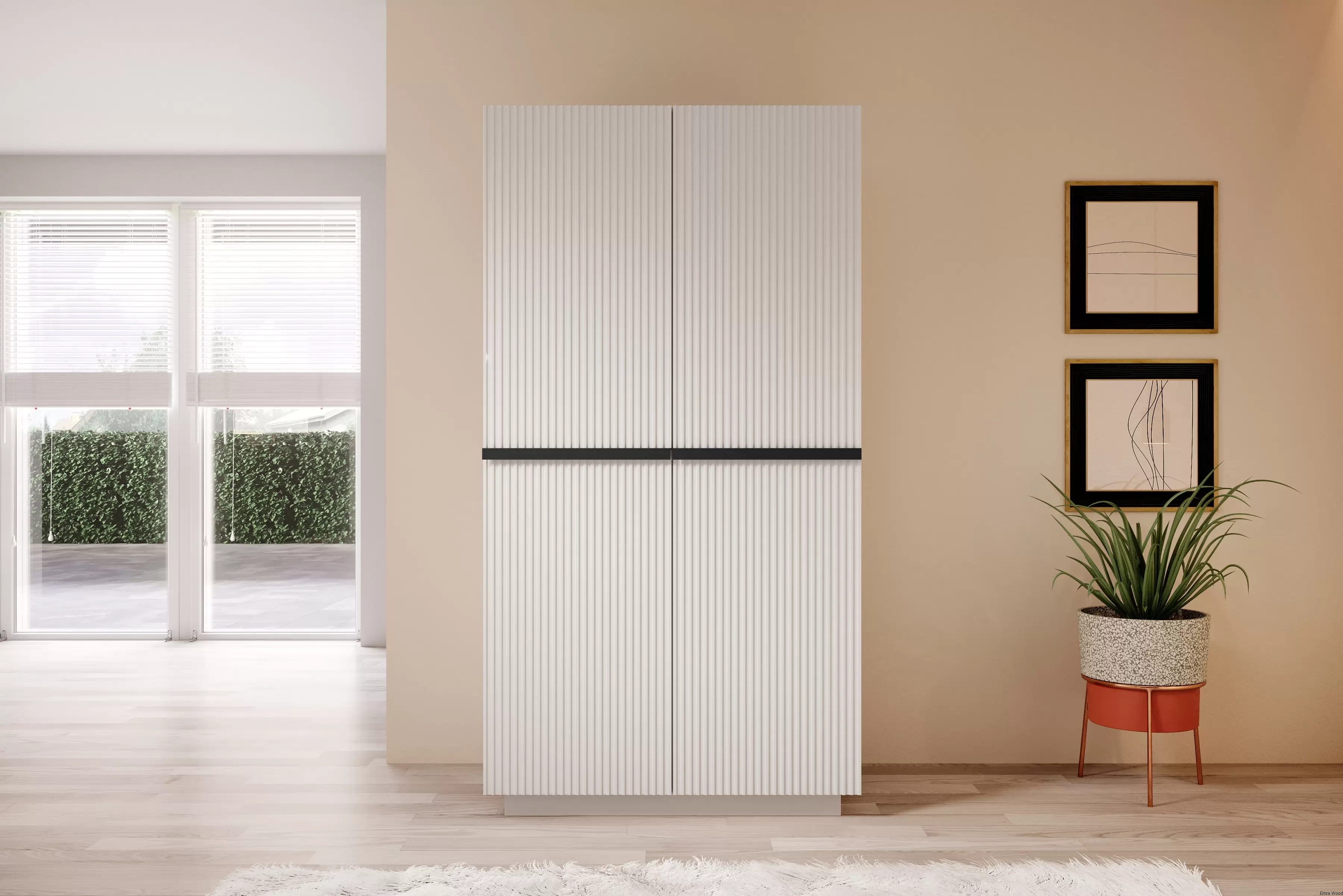 Stylowy i nowoczesny design tej szafy z pewnością przyciągnie Twoje spojrzenie. Matowy biały kolor dodaje jej elegancji, a ryflowane fronty i czarne metalowe uchwyty nadają jej charakteru.