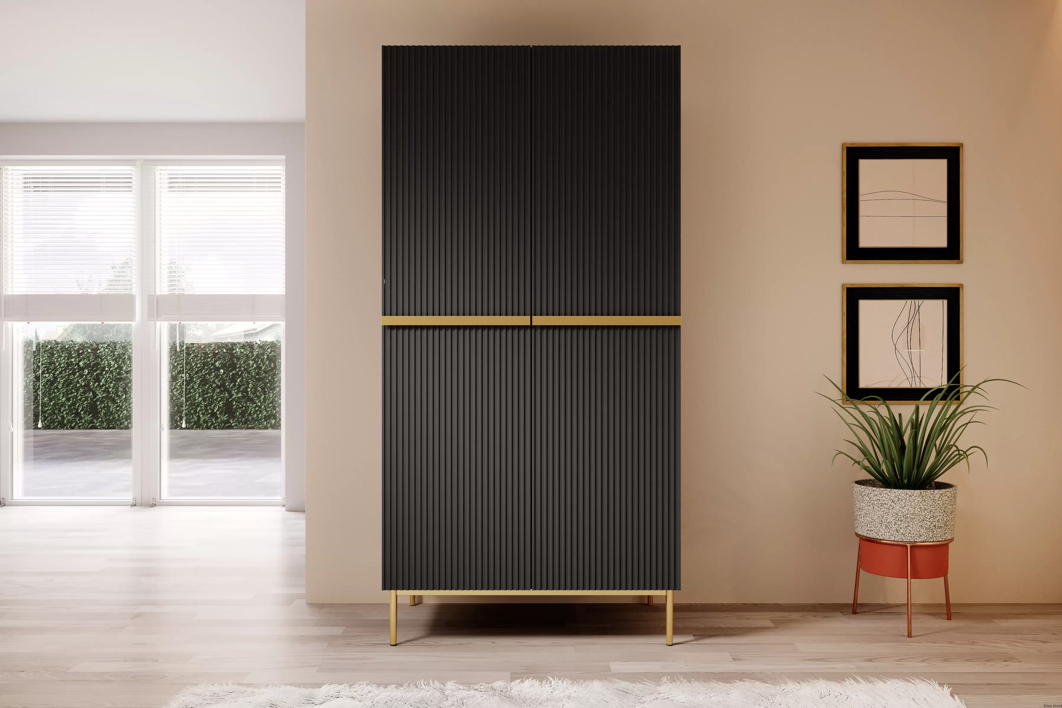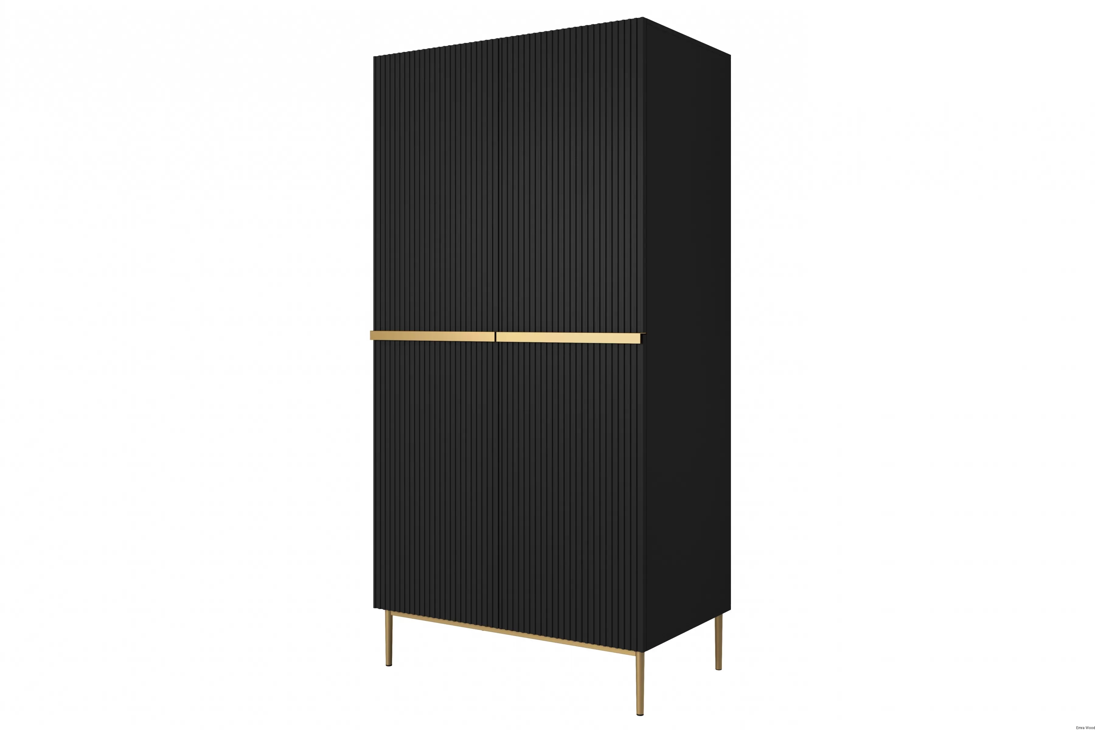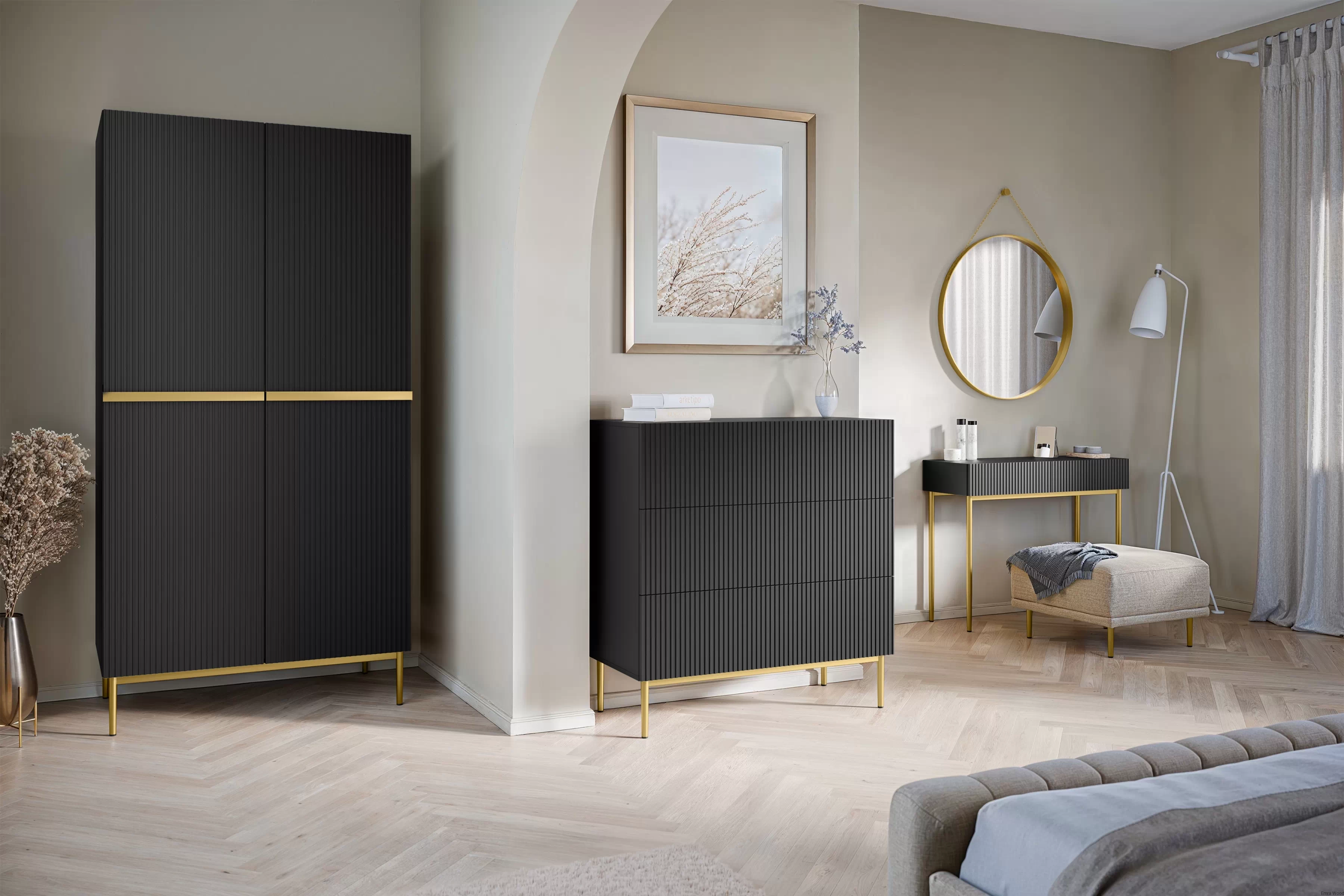 Szafa Nicole przyciąga wzrok swoim nowoczesnym designem. Czarny matowy front w połączeniu ze złotymi nóżkami tworzy wyjątkowo stylowy duet, który wprowadza do wnętrza nutę luksusu. Ryflowane wykończenie frontu dodaje jej charakteru, sprawiając, że staje się nie tylko praktycznym, ale i dekoracyjnym elementem przestrzeni.
