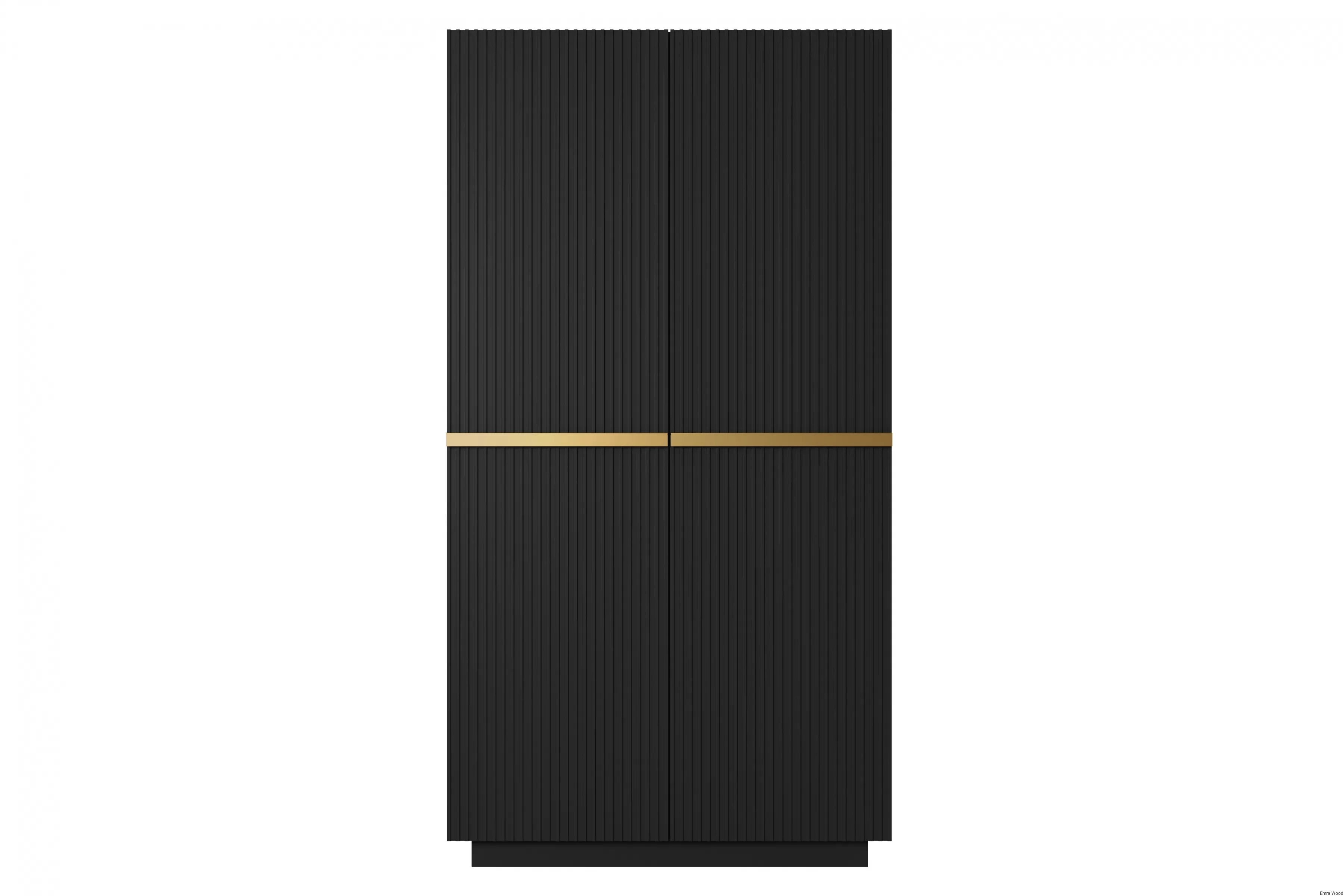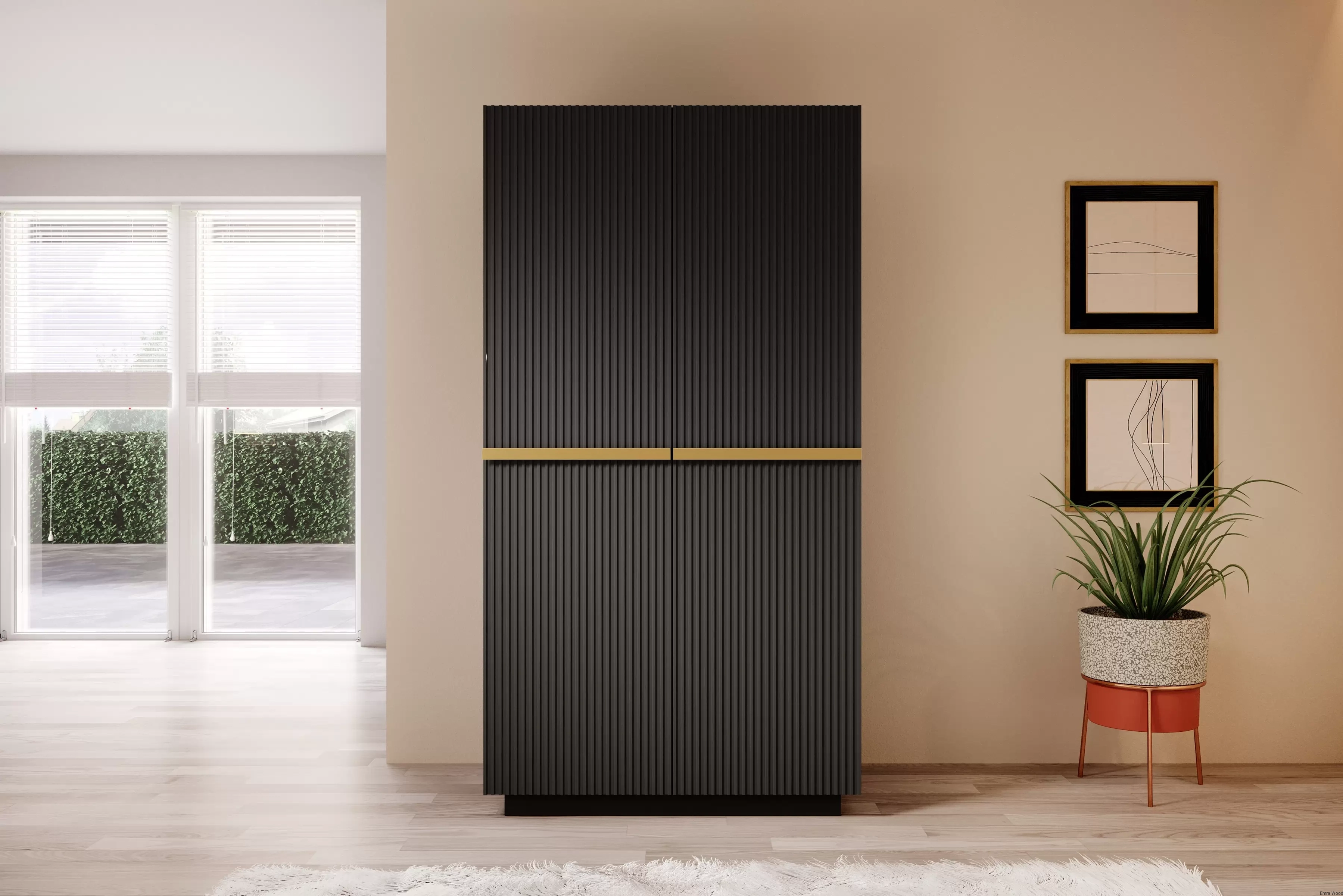 Niezwykła estetyka tej szafy, z jej matowym czarnym wykończeniem i złotymi detalami, dodaje elegancji i wyrafinowania każdemu pomieszczeniu. Jej ryflowany front przyciąga wzrok, a metalowe uchwyty dodają nowoczesnego, industrialnego charakteru.