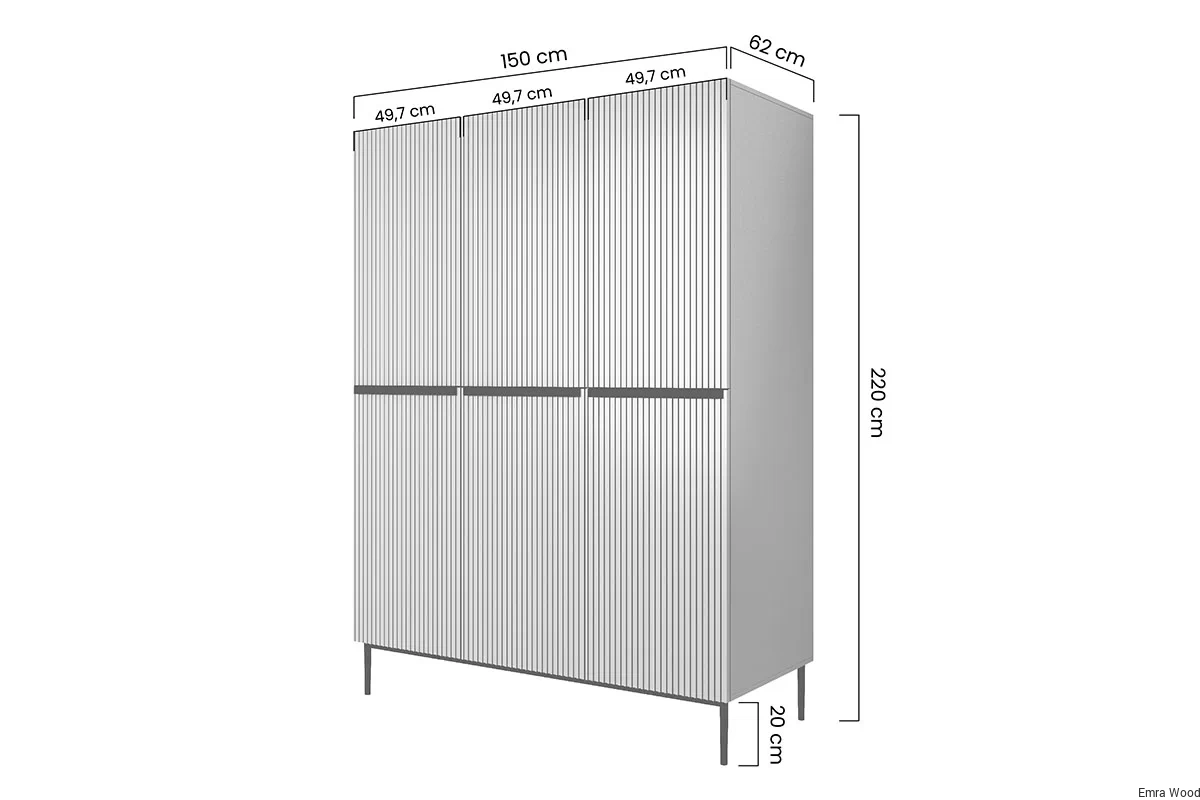 Korpus szafy wykonany jest z płyty laminowanej 16 mm, a front z płyty MDF 18 mm. Metalowe nóżki z podkładką gumową zapewniają stabilność, a malowanie proszkowe gwarantuje trwałość koloru. Jest wyposażona w 3 drzwi z cichym domykiem, 5 półek i drążek na ubrania, co zapewnia mnóstwo miejsca do przechowywania.