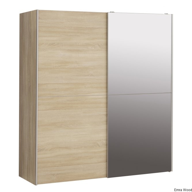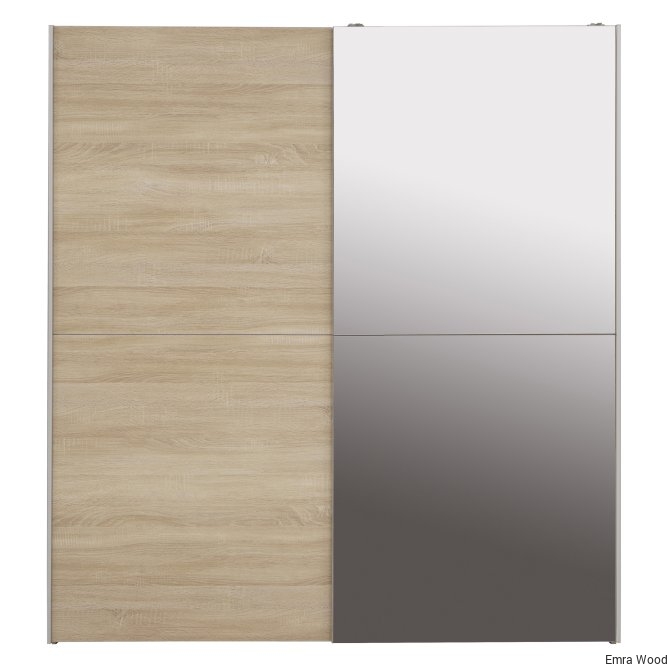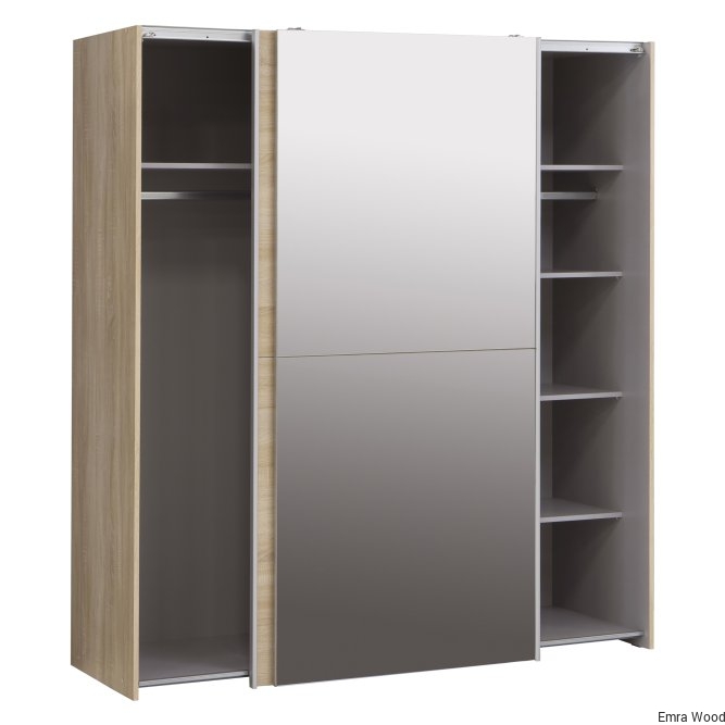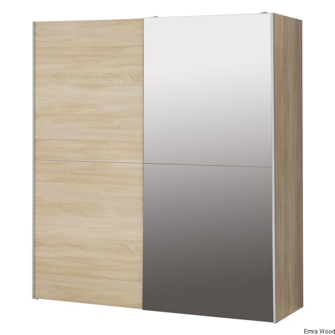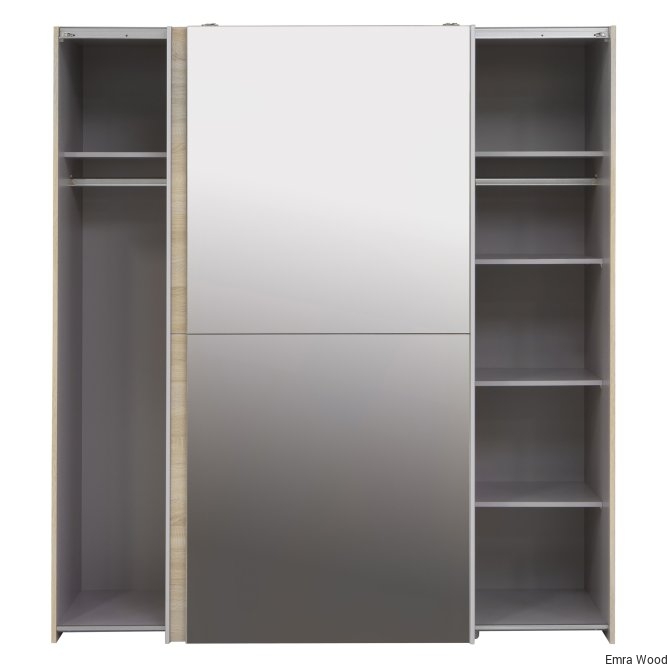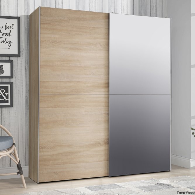 Lustrzane drzwi przesuwane, drążek na ubrania i dużo miejsca do przechowywania sprawiają, że ta szafa to jeden krok do przodu, do rozwiązania problemów z ubraniem się. Wyraźny, współczesny design sprawia, że jest idealnym dodatkiem do każdej sypialni, a nawet przedpokoju. Szafa ma wykończenie z dębu Sonoma, dwa drążki na ubrania i pięć wewnętrznych półek.