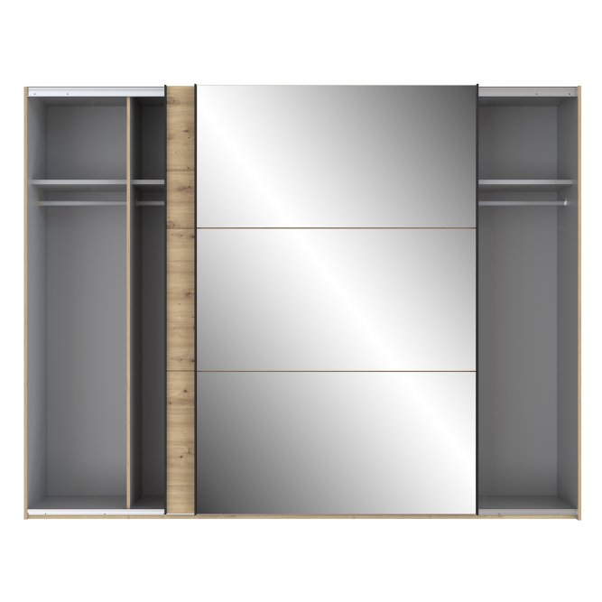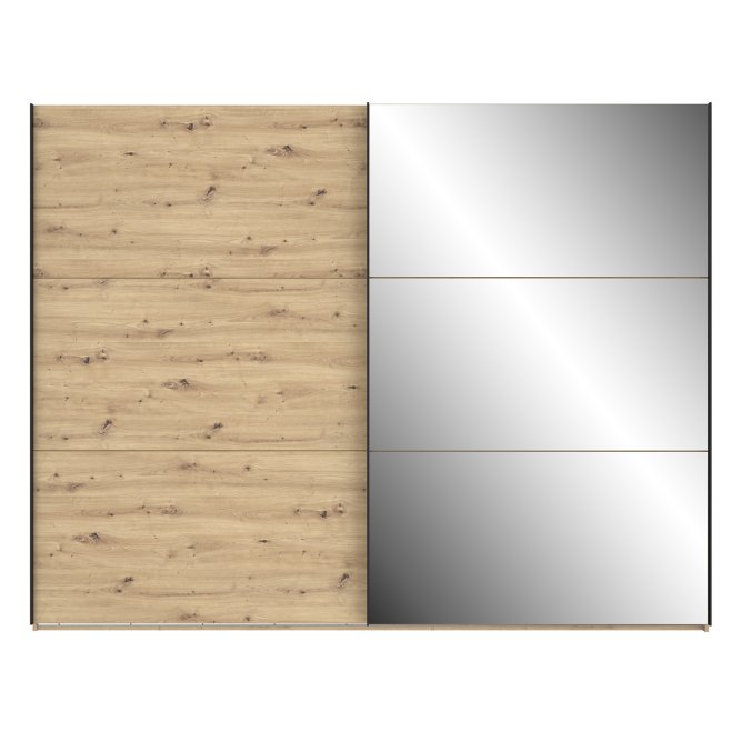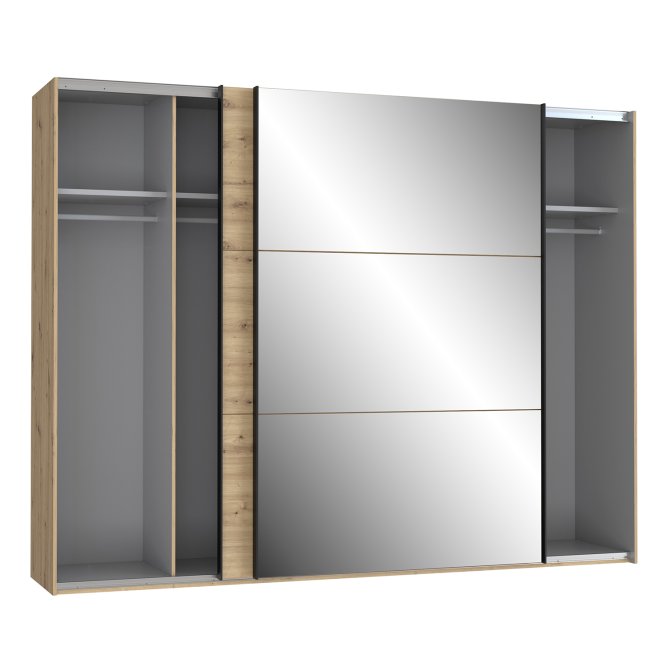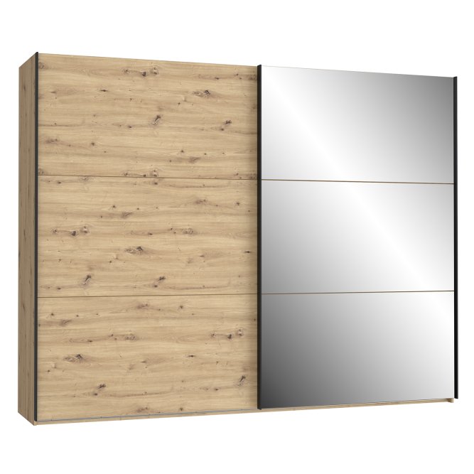 Szafa w stylu nowoczesnym z tej kolekcji będzie idealnie pasować do każdej sypialni, garderoby czy przestronnego korytarza. Wykonana w połączeniu dekoru Dąb Artisan i Dębu Czarnego doskonale odzwierciedla naturalne usłojenie drewna. Posiada bardzo duże lustro oraz dużo miejsca do przechowywania