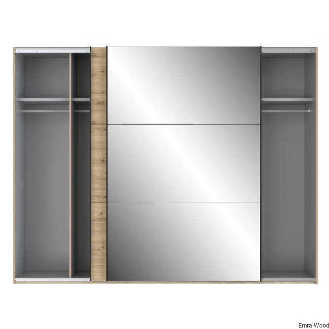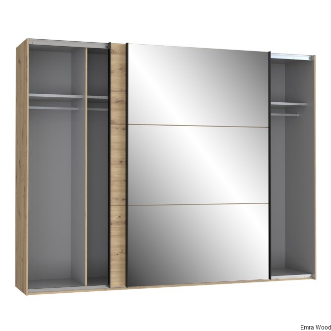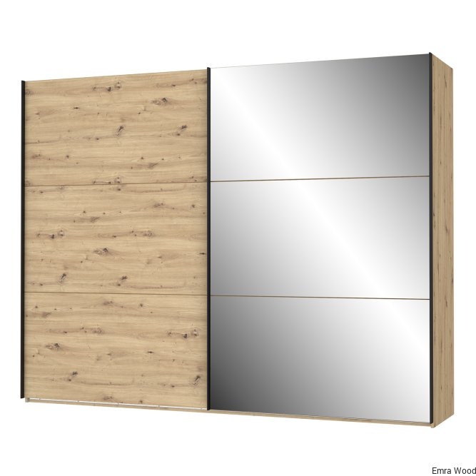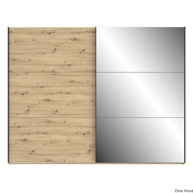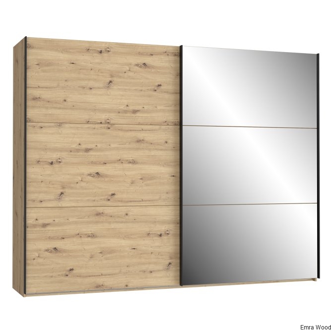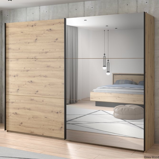 Szafa w stylu nowoczesnym z tej kolekcji będzie idealnie pasować do każdej sypialni, garderoby czy przestronnego korytarza. Wykonana w połączeniu dekoru Dąb Artisan i Dębu Czarnego doskonale odzwierciedla naturalne usłojenie drewna. Posiada bardzo duże lustro oraz dużo miejsca do przechowywania