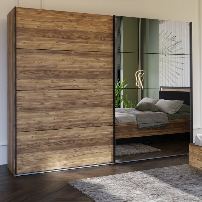 Szafa HAYATO dopełni loftową aranżację sypialni lub tę w stylu modern loft. Przemyślany podział wnętrza, 3 półki i 2 drążki zapewniają miejsce do przechowywania ubrań i dodatków. Możesz uzupełnić szafę o dodatkowe półki, oświetlenie, listwy okalające i komodę wewnętrzną, dopasowując ją do swoich potrzeb. Tę 2-drzwiową szafę możesz ustawić w loftowej sypialni, ale też przedpokoju lub wydzielonej garderobie. Lustrzany front optycznie rozjaśni pomieszczenie i zapewni możliwość przejrzenia się w wybranej kreacji.