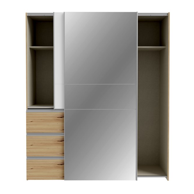 Szafa przesuwna z lustrem 170 cm z kolekcji WINN 2 będzie świetnie wyglądać zwłaszcza w sypialni lub przedpokoju urządzonym w stylu skandynawskim. Mebel jest niezwykle pojemny i wygodny w użytkowaniu za sprawą połaczenia różnych opcji organizacji ubrań: drążków, półek oraz szuflad. Lustro na froncie szafy optycznie powiększy pomieszczenie, a także idealnie sprawdzi się podczas doboru codziennej stylizacji.
