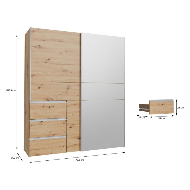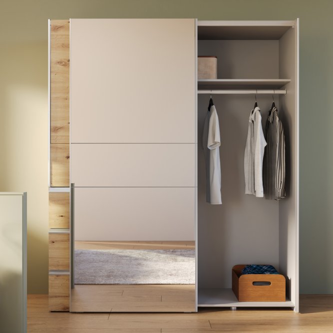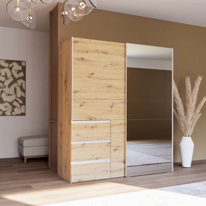2-drzwiowa szafa doskonale sprawdzi się we wnętrzach urządzonych w stylu MODERN, w szczególności w takich pomieszczeniach, jak Sypialnia. Ma dobrze zorganizowaną przestrzeń: szuflady (3), drążek ubraniowy i półki (2). Dzięki takiemu układowi, w szafie możesz przechowywać różnorodne rzeczy - nie tylko odzież, lecz także sprzęt sportowy i hobbistyczny, dokumenty czy zdjęcia.