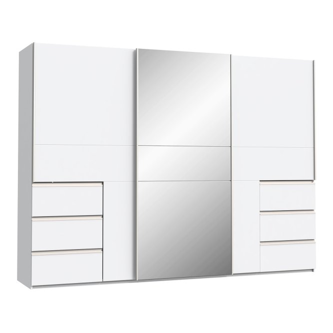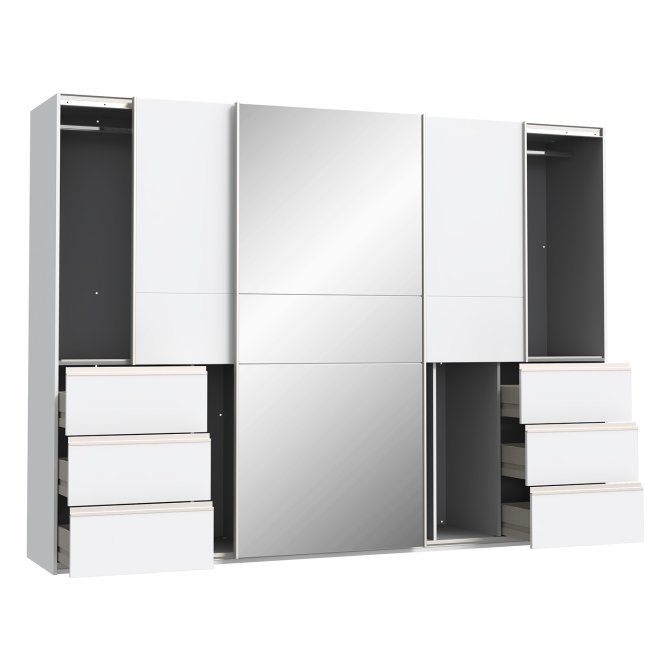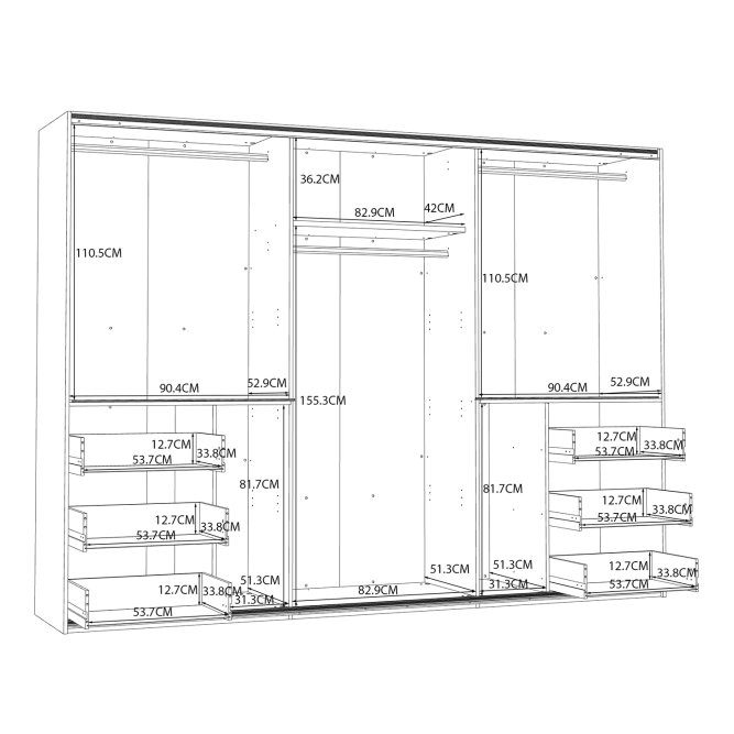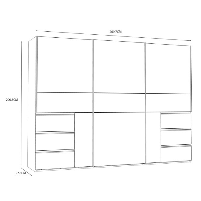 Przestronna szafa o wymiarach: szerokość 269,7 cm x wysokość 200,5 cm x głębokość 57,6 cm