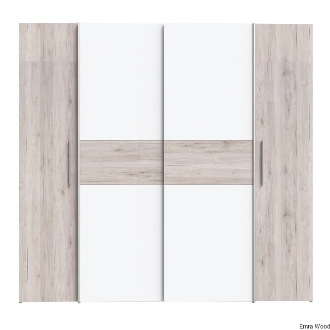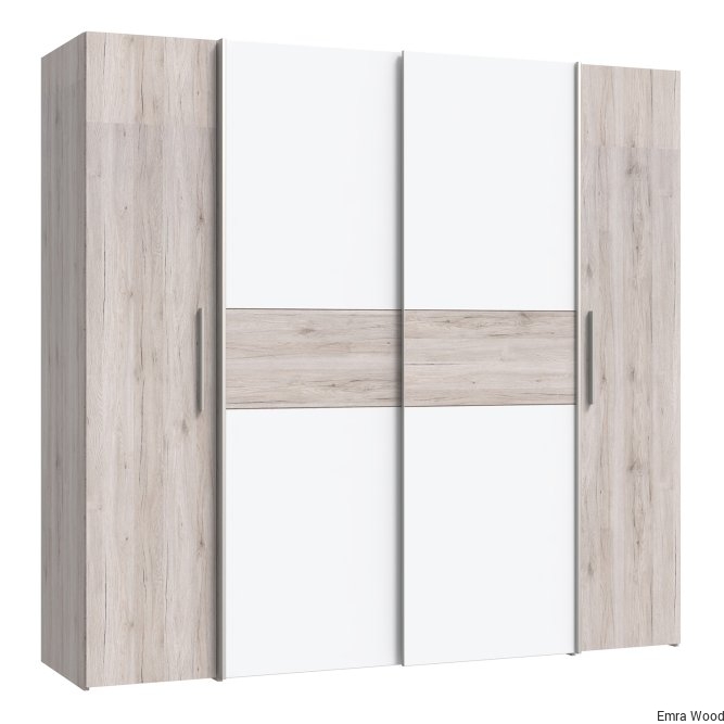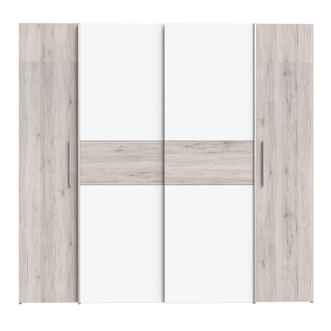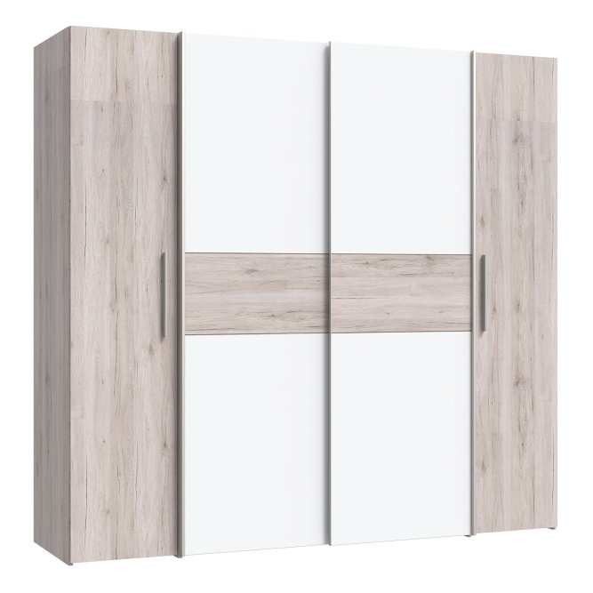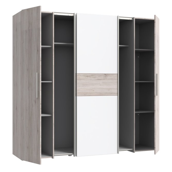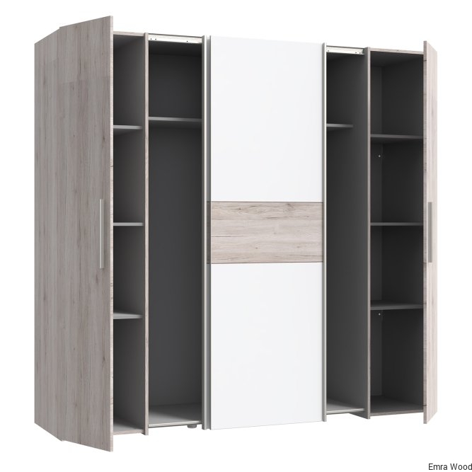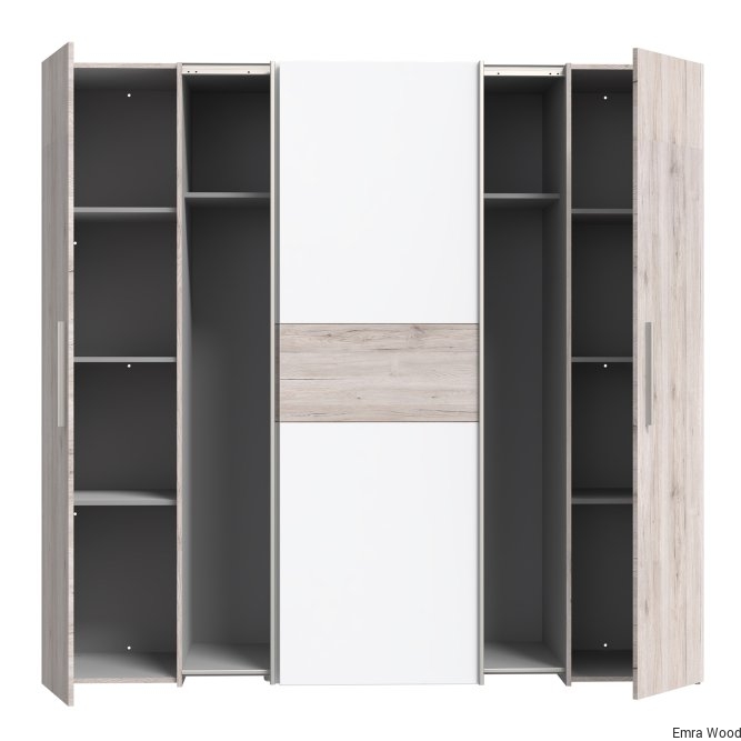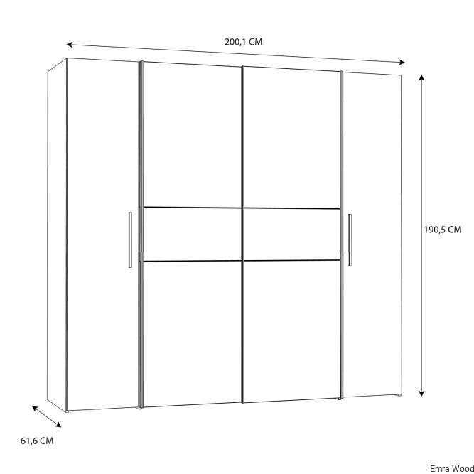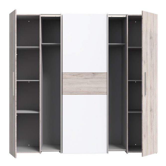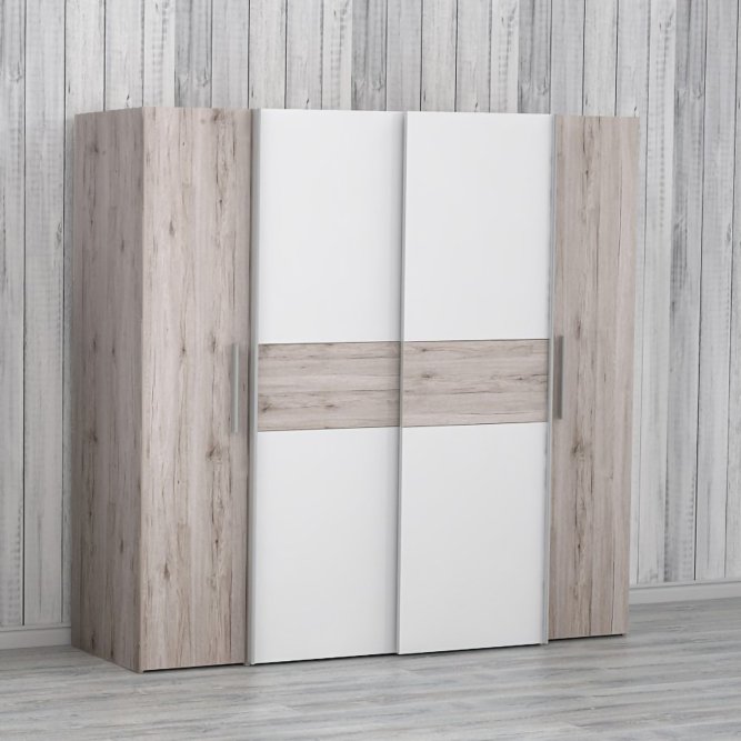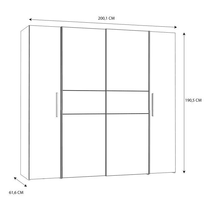 Pojemna, czterodrzwiowa szafa NARAGO idealnie pasuje do nowoczesnej sypialni, ale też świetnie prezentuje się w garderobie czy przedpokoju. Praktyczny podział wnętrza na sekcję z połkami oraz drążkami na wieszaki, zapewnia miejsce na różnego rodzaju odzież. Duża przestrzeń w dole szafy umożliwia przechowywanie obuwia.