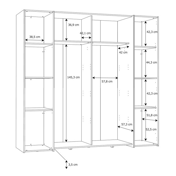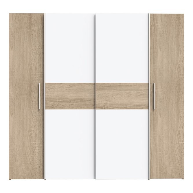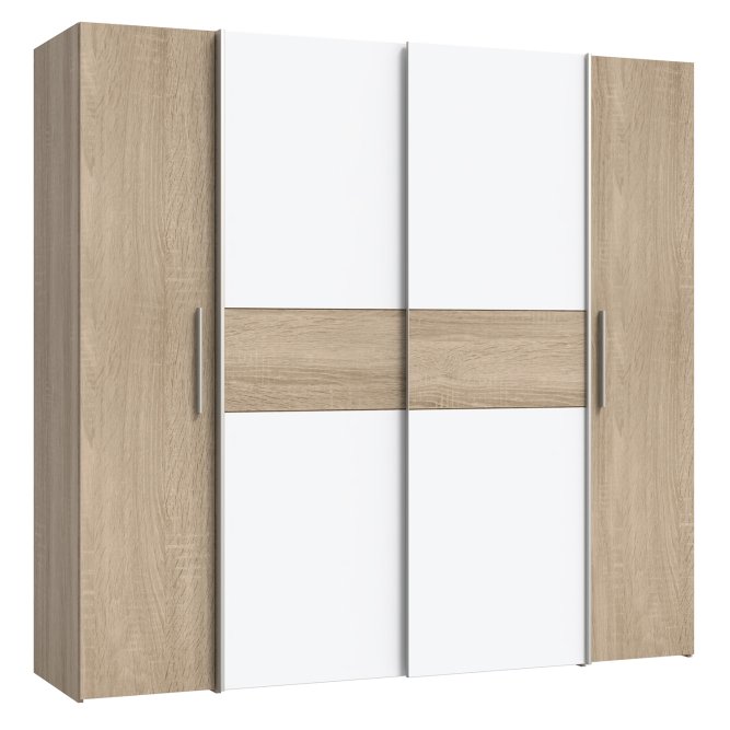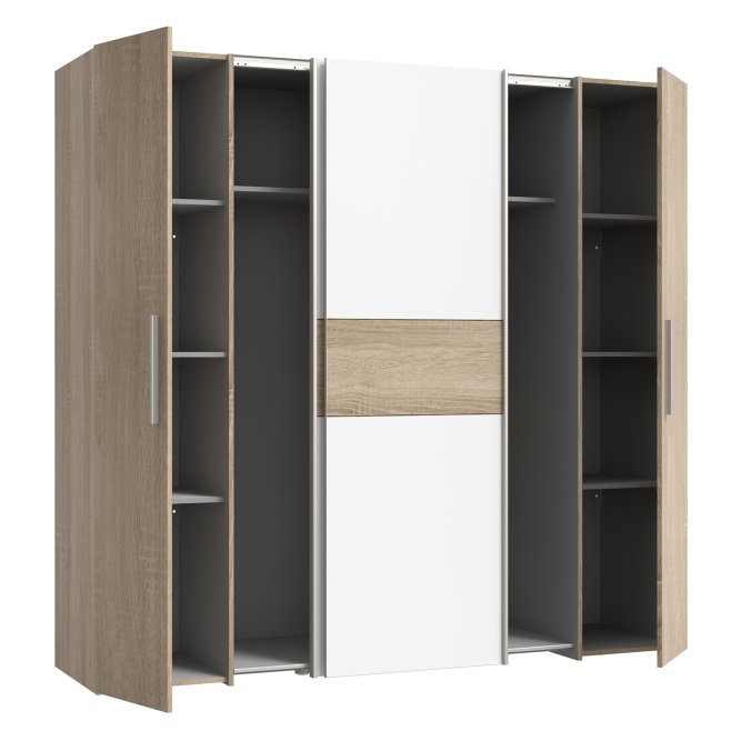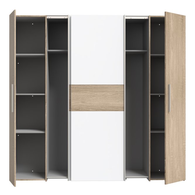 Duża, pojemna, trzykomorowa szafa w połączeniu dekorów Dębu Sonoma, który idealnie odwzorowuje naturalne usłojenie drewna, oraz Białego doskonale wkomponuje się aranżację sypialni, garderobie czy przedpokoju. W standardowym wyposażeniu szafki znajdują się dwa drążki i osiem półek z płyty.