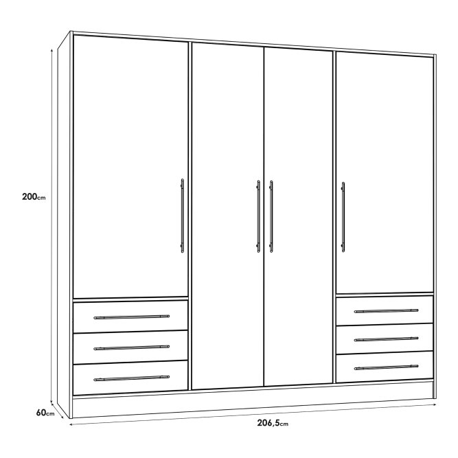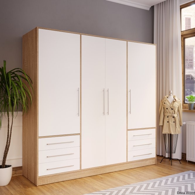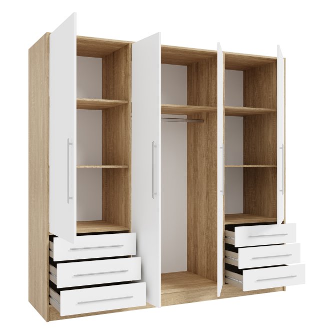 Uniwersalna kolorystyka pozwoli na dopasowanie tej czterodrzwiowej szafy zarówno do sypialni, garderoby, przedpokoju, jak i pokoju młodzieżowego. Uwagę zwracają odkryte elementy korpusu w dekorze Dębu Sonoma, tworzące efektywną ramkę wokół białych frontów mebla. Całości dopełniają smukłe uchwyty w srebrnym wybarwieniu.