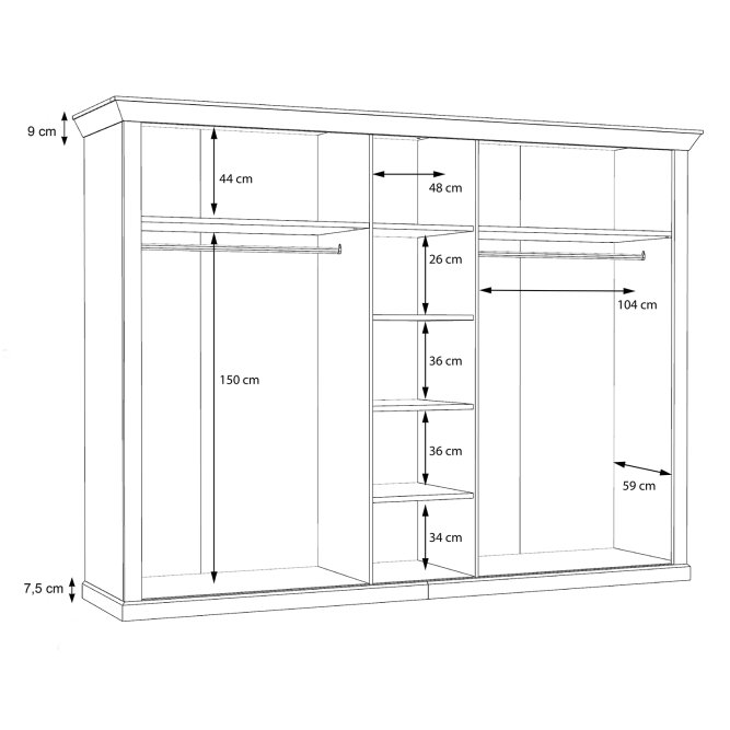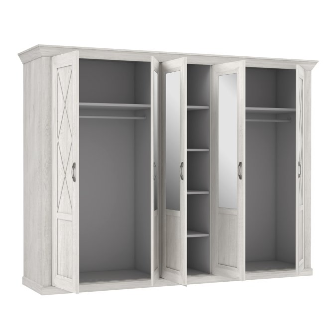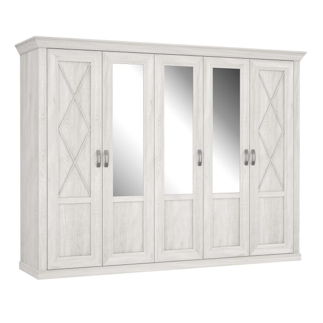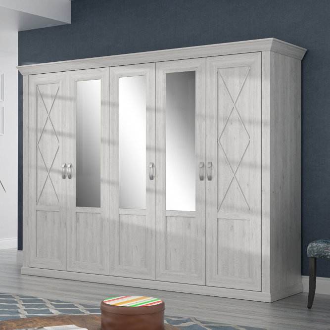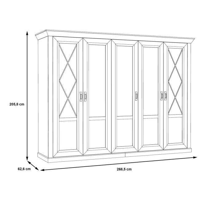 Pięciodrzwiowa, stylizowana szafa spełni funkcję sypialnianej garderoby. Bogate zdobienia, ramkowe fronty i szprosy przywodzą na myśl meble z poprzednich epok. Szafa została podzielona na trzy części - dwie zewnętrzne są wyposażone w drążek na ubrania i górną półkę, natomiast wąska, środkowa pełni funkcję bieliźniarki.