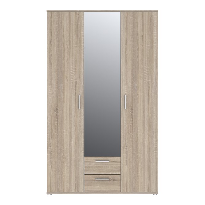 Ekskluzywna trzydrzwiowa szafa ubraniowa w dekorze Dąb Sonoma dzięki swej prostocie i funkcjonalności z łatwością dopasowuje się do większości pomieszczeń i aranżacji. Wewnątrz szafy znajdują się praktyczne półki na ułożenie złożonych rzeczy oraz drążek na wiszącą odzież. W dolnej części mebla znajdują się dwie szuflady, w których można przechowywać np. bieliznę.