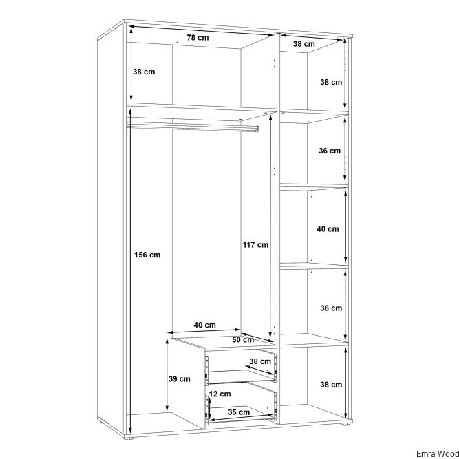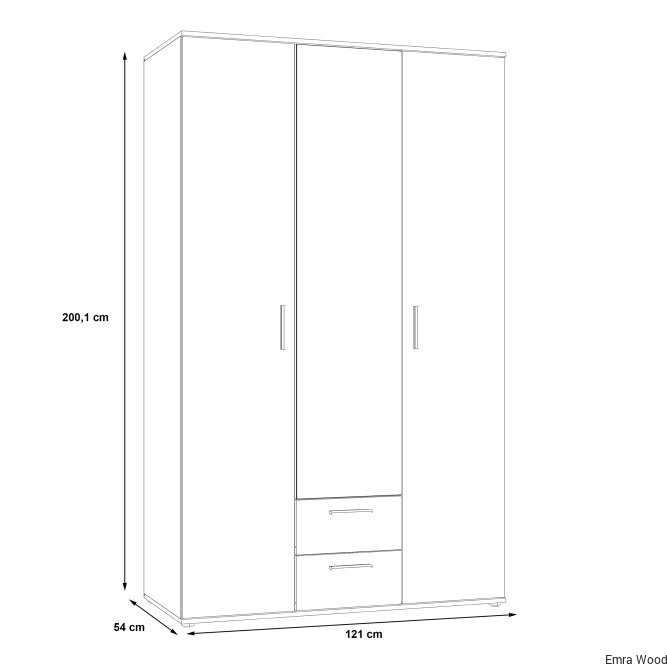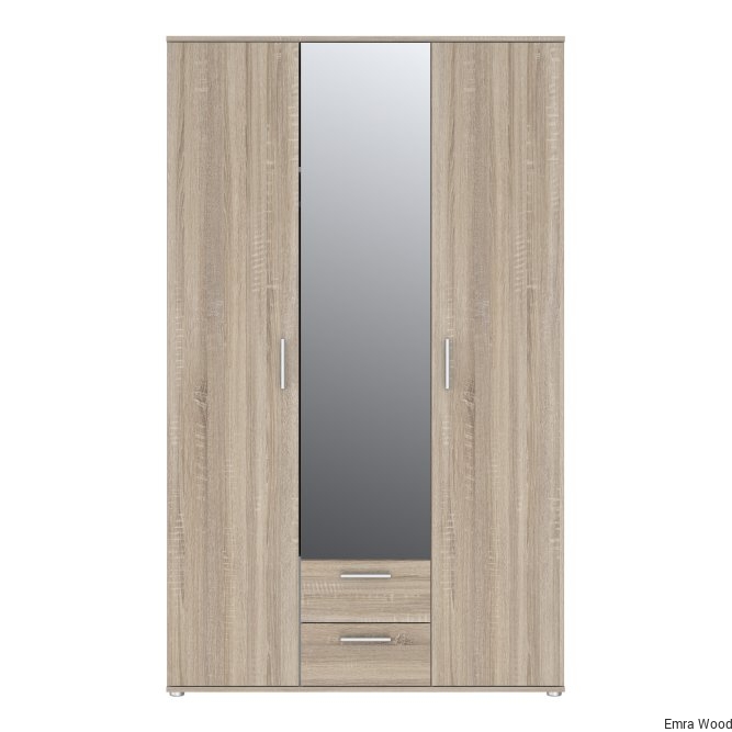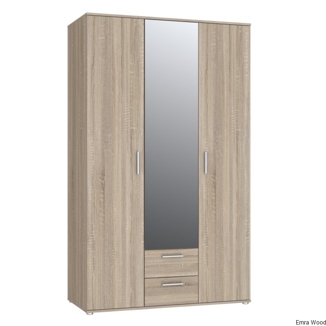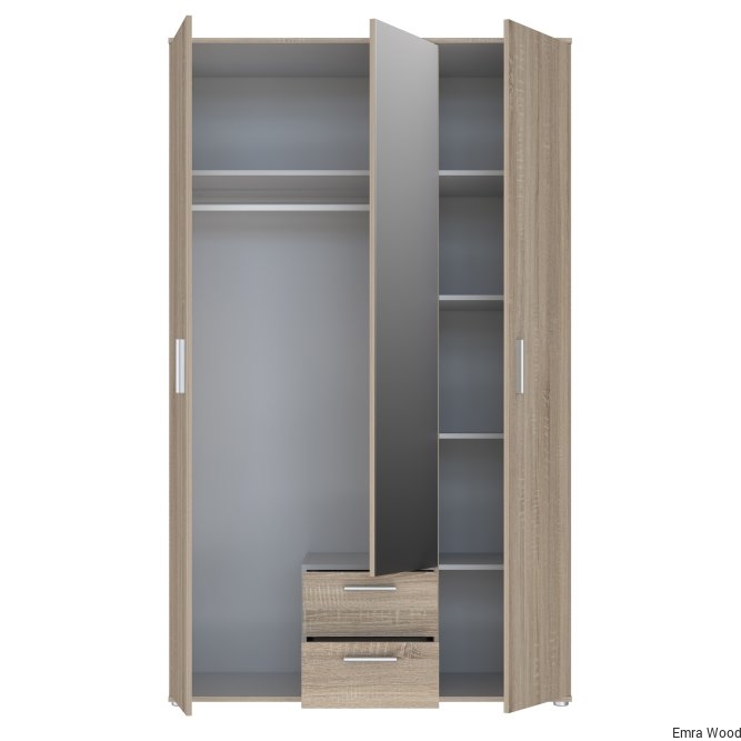 Ekskluzywna trzydrzwiowa szafa ubraniowa w dekorze Dąb Sonoma dzięki swej prostocie i funkcjonalności z łatwością dopasowuje się do większości pomieszczeń i aranżacji. Wewnątrz szafy znajdują się praktyczne półki na ułożenie złożonych rzeczy oraz drążek na wiszącą odzież. W dolnej części mebla znajdują się dwie szuflady, w których można przechowywać np. bieliznę.