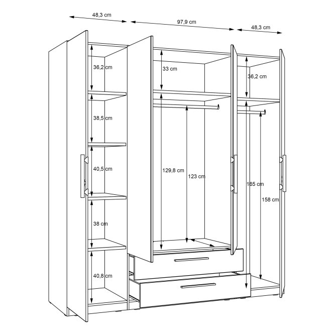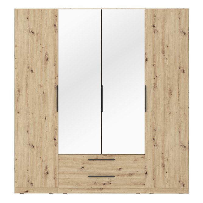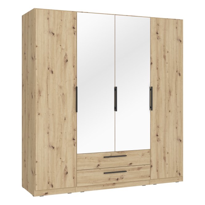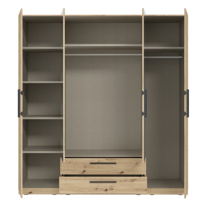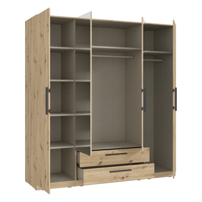 4-drzwiowa szafa z kolekcji CADIXO doskonale sprawdzi się we wnętrzach urządzonych w stylu nowoczesnym, w szczególności w takich pomieszczeniach, jak sypialnia. Ma dobrze zorganizowaną przestrzeń: 2 szuflady, drążek ubraniowy i 7 półek. Dzięki takiemu układowi, w szafie możesz przechowywać różnorodne rzeczy - nie tylko odzież, lecz także sprzęt sportowy i hobbistyczny, walizki i torby treningowe.