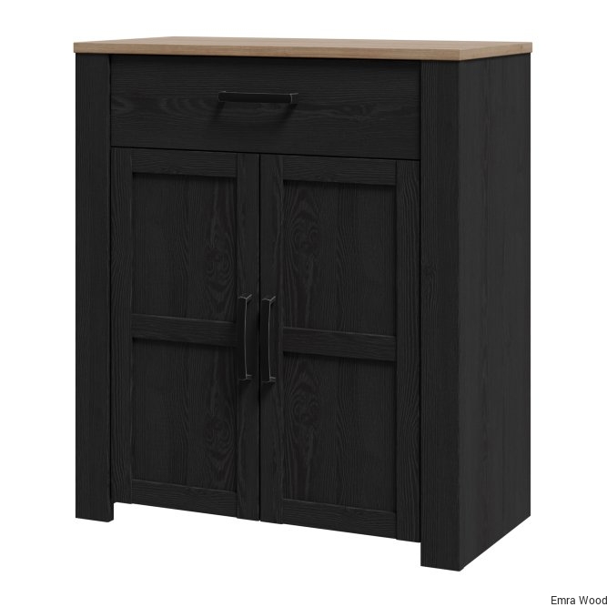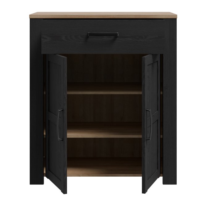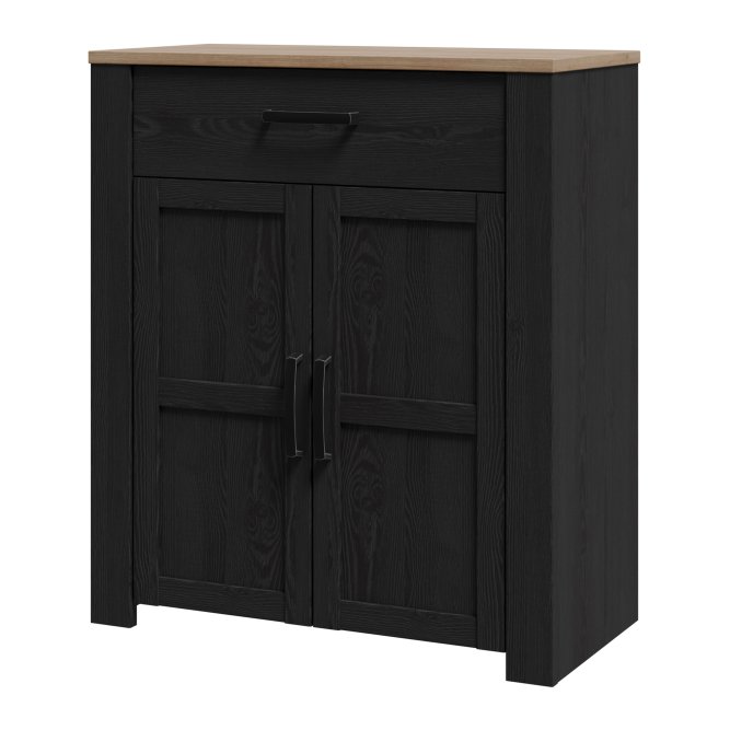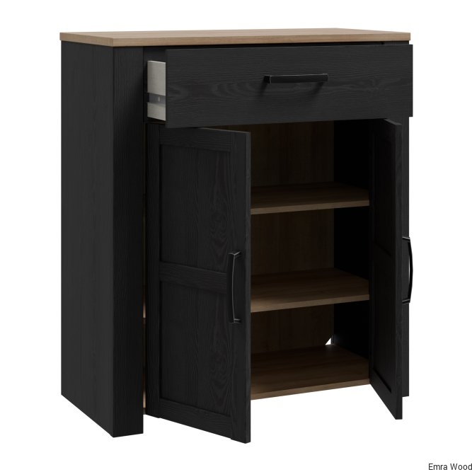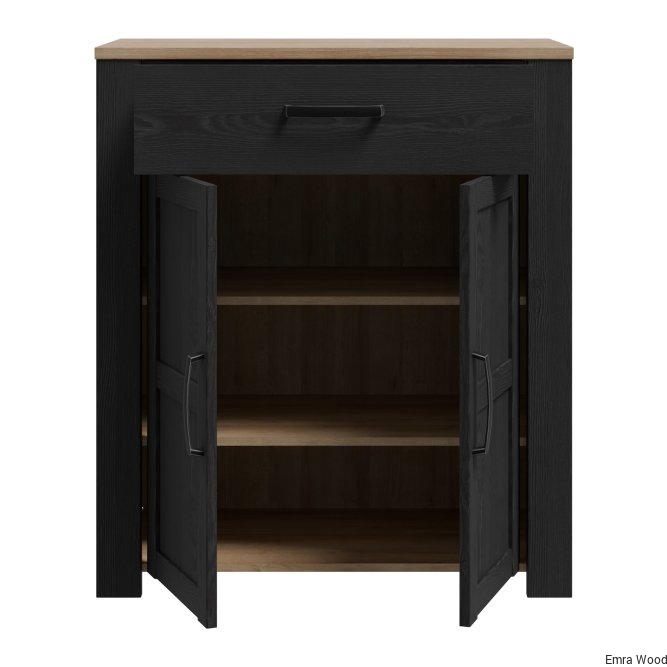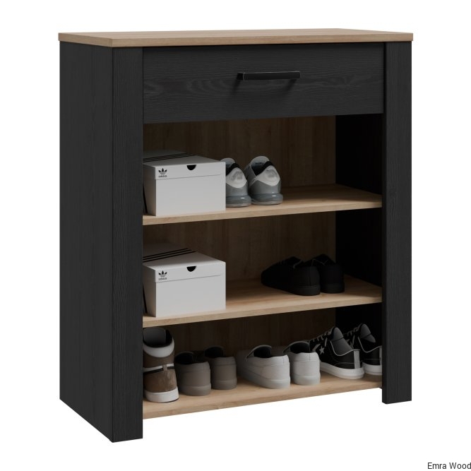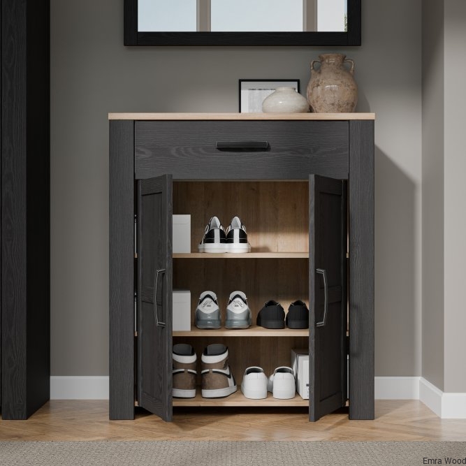 Szafka na buty to nieodłączny element wyposażenia przedpokoju. Posiada podręczną szufladkę oraz szafkę, w której zmieścisz do 12 par butów. Wysoka szafka zachwyca listwami na frontach, mocnymi uchwytami oraz ciemną kolorystyką, idealnie wpisuje się w klasyczny