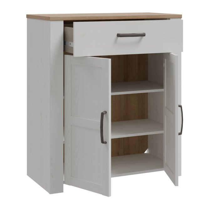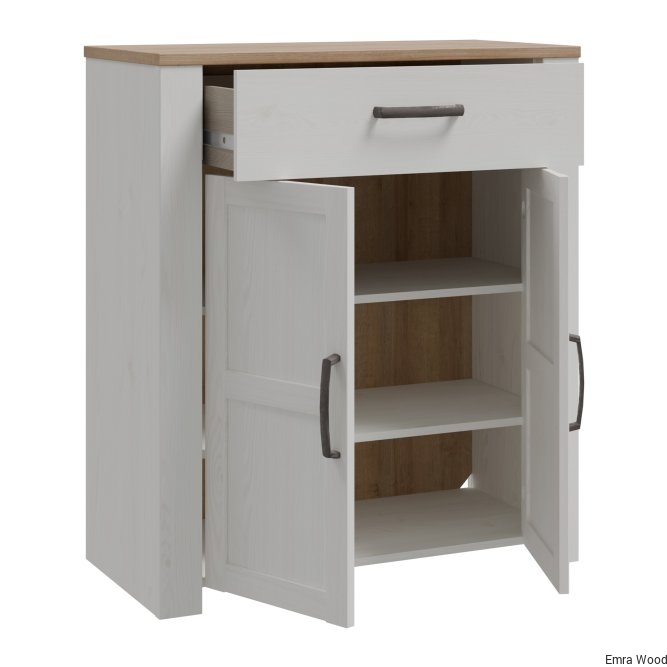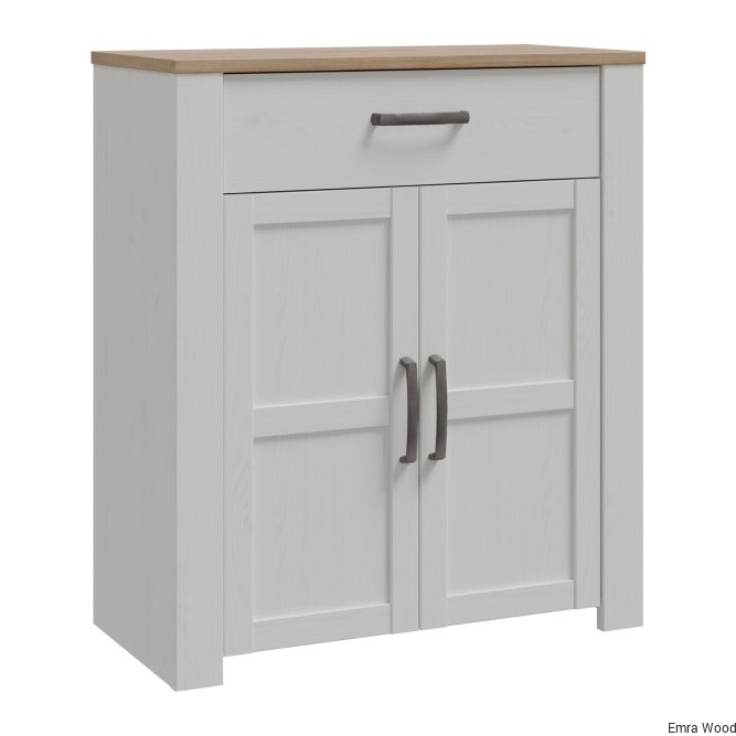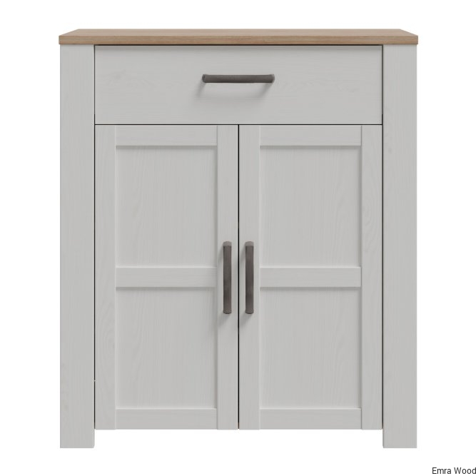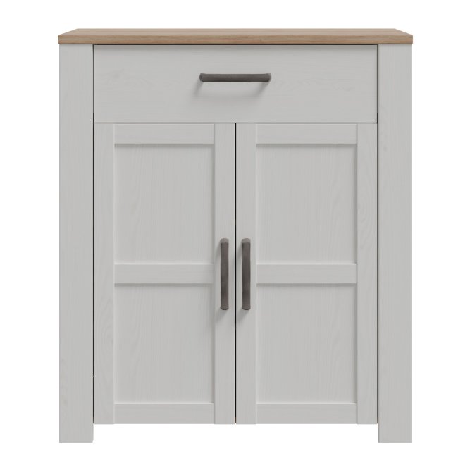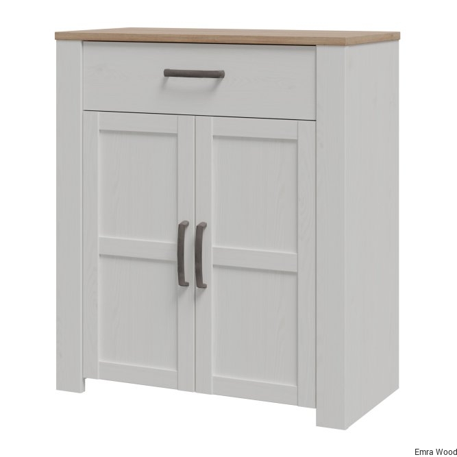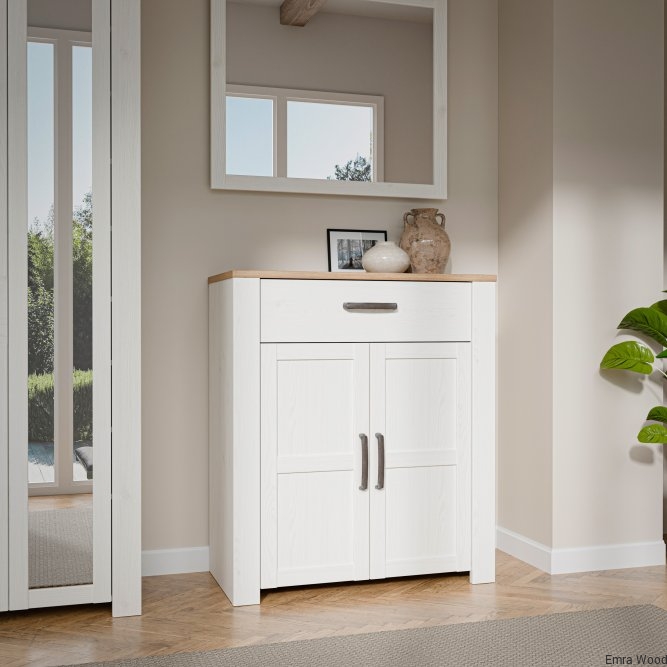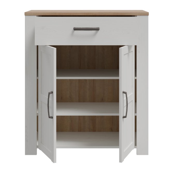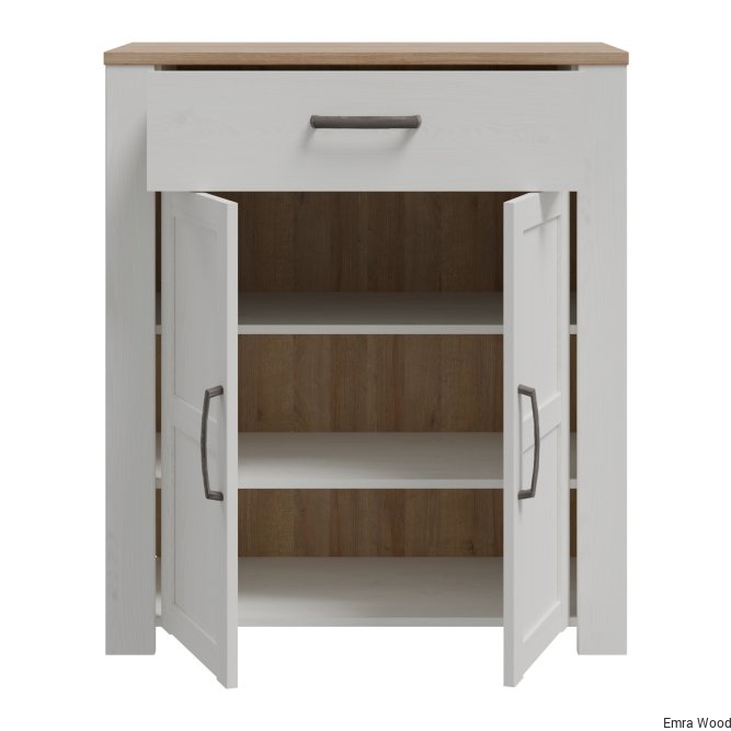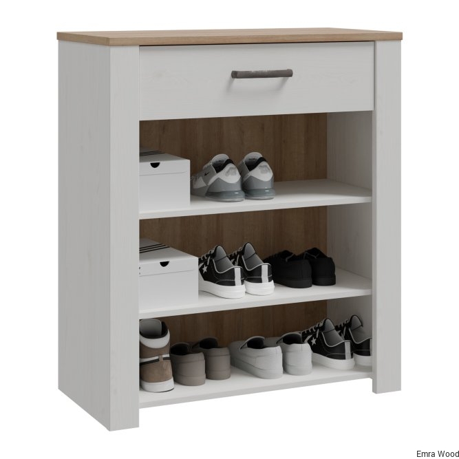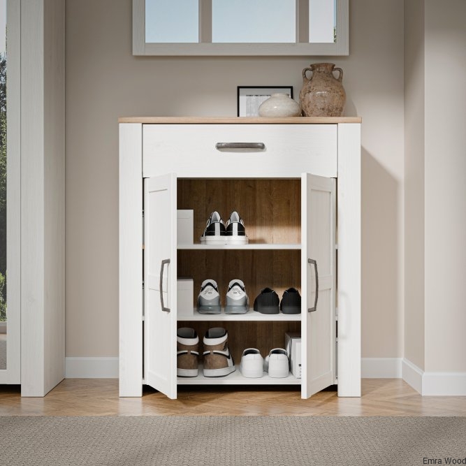 Szafka na buty to nieodłączny element wyposażenia przedpokoju. Posiada podręczną szufladkę oraz szafkę, w której zmieścisz do 12 par butów. Wysoka szafka zachwyca listwami na frontach, mocnymi uchwytami oraz jasną kolorystyką, idealnie wpisuje się w prowansalski i skandynawski styl wnętrza.