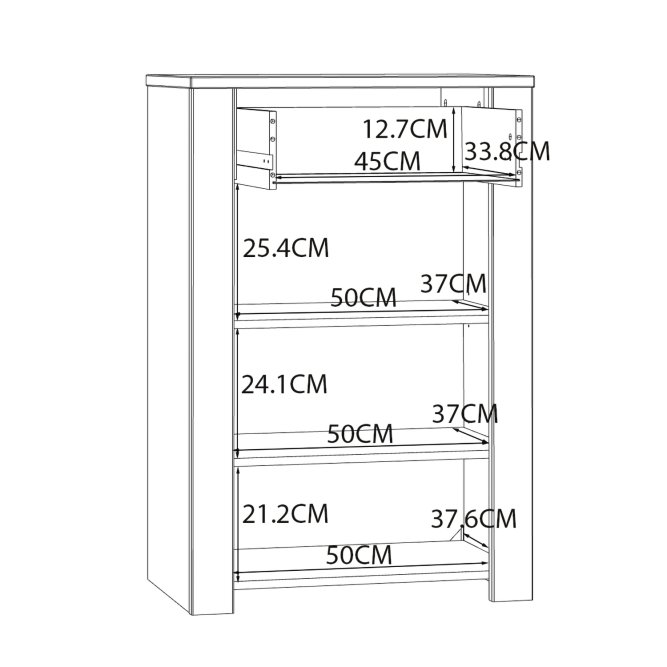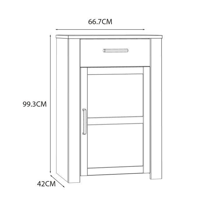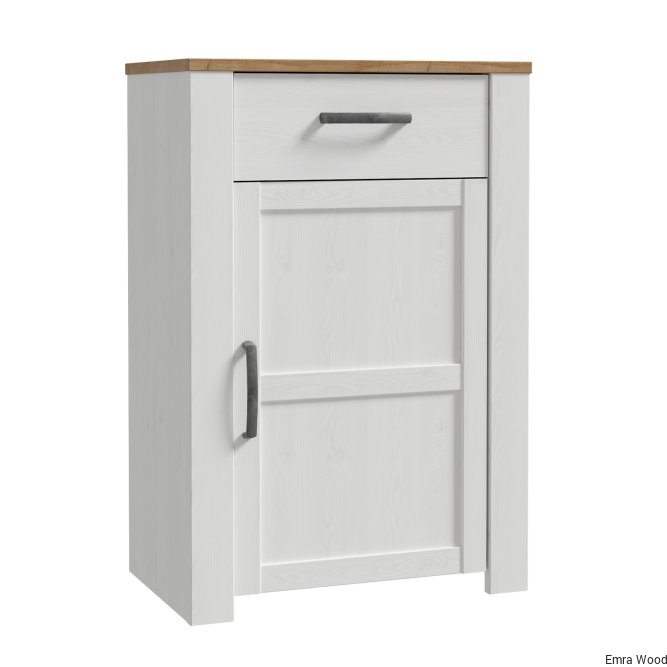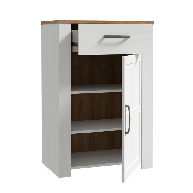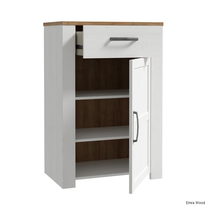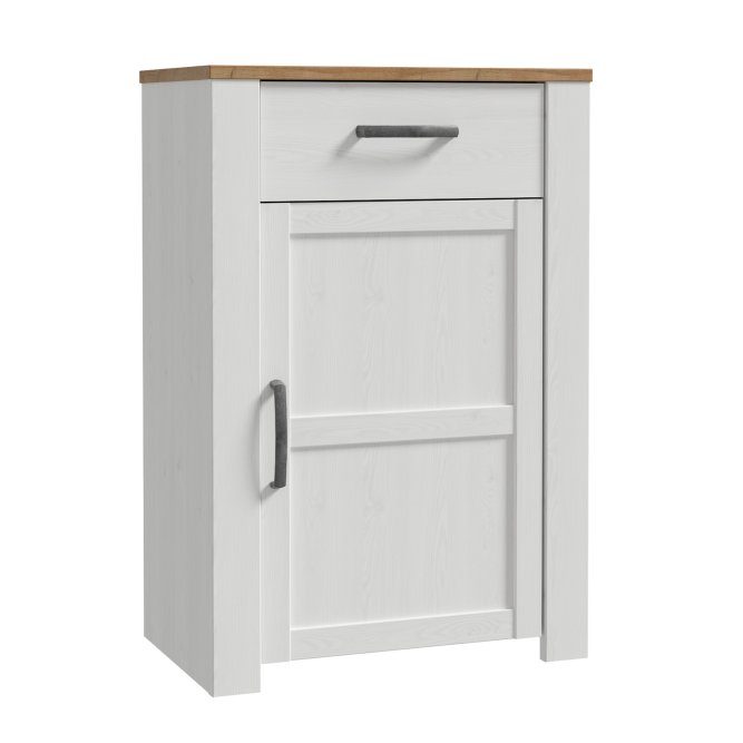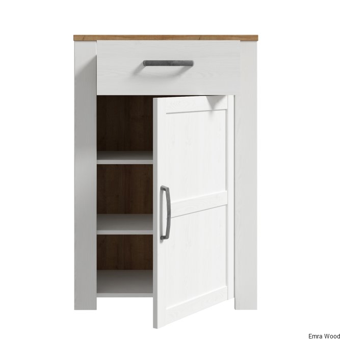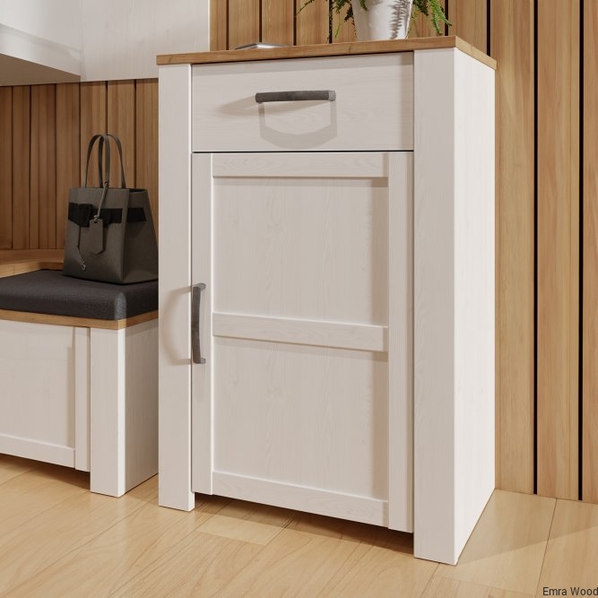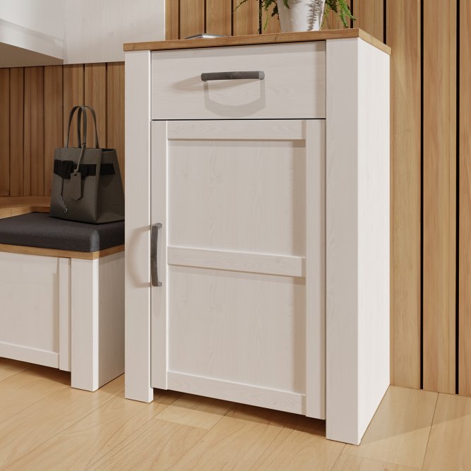 Szafka na buty to nieodłączny element wyposażenia przedpokoju. Posiada podręczną szufladkę oraz szafkę, w której zmieścisz do 6 par butów. Wysoka szafka zachwyca listwami na frontach, mocnymi uchwytami oraz jasną kolorystyką, idealnie wpisuje się w prowansalski styl wnętrza.