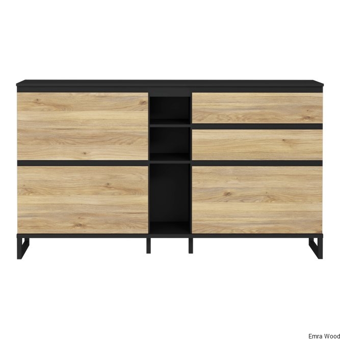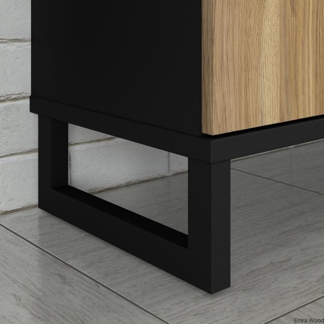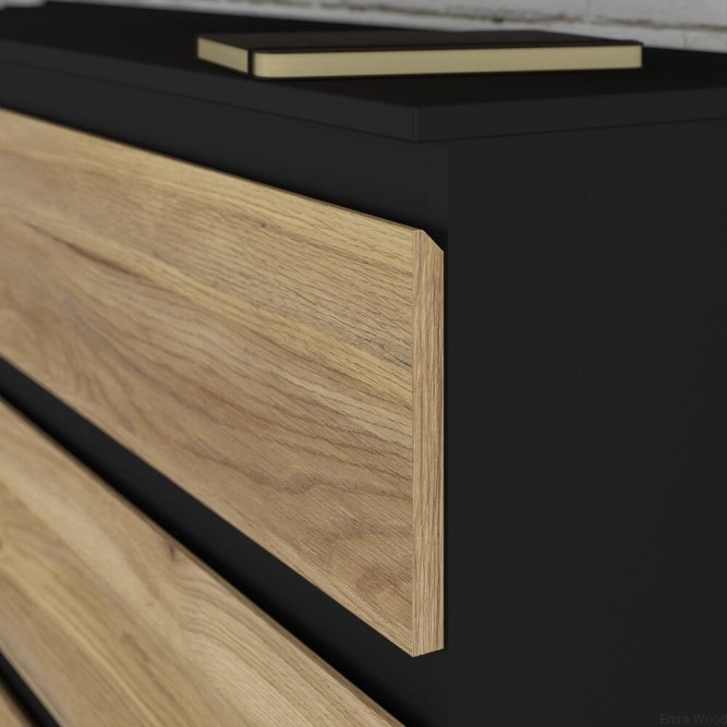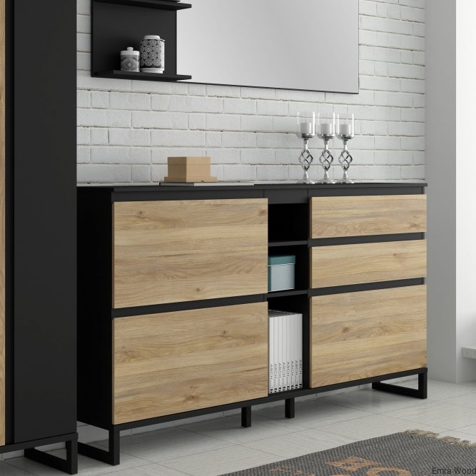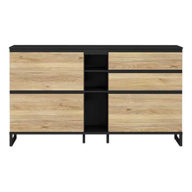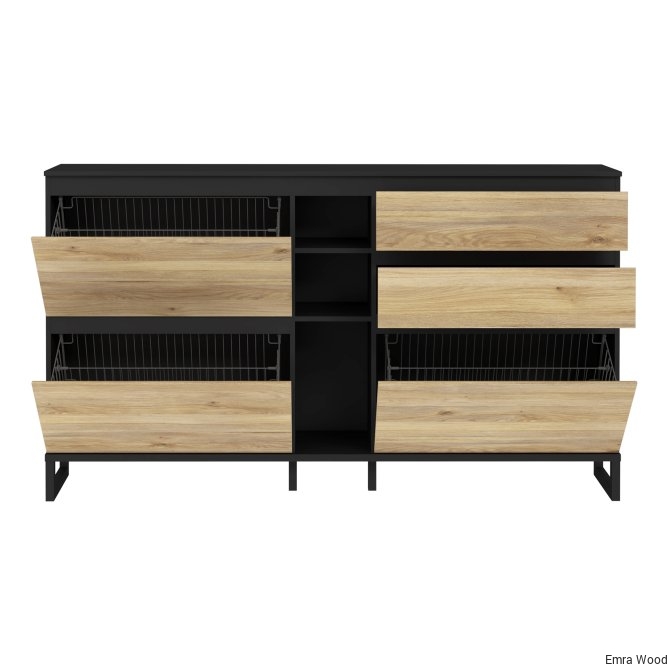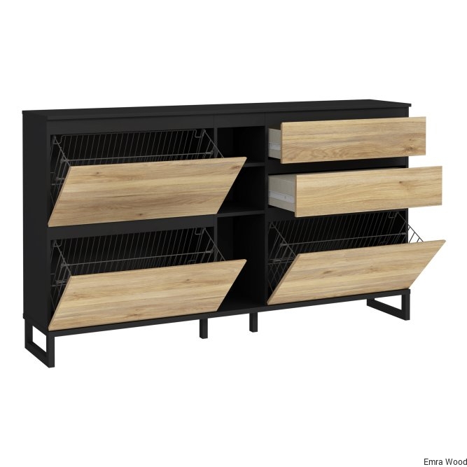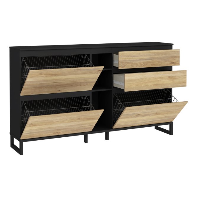 Szafka na buty QUAYLE to rozwiązanie dla tych, którzy oczekują od szafki czegoś więcej. Pojemny mebel zachwyci podziałem wnętrza, który umożliwi przechowywanie butów, dodatków, kluczy i parasolek. Pomogą w tym 3 uchylane szafki z przegrodami na buty, 2 szerokie szuflady oraz 3 otwarte przestrzenie. Przestronny blat to idealne miejsce na lampion, roślinę doniczkową i lustro. Całość zamyka duet kolorystyczny czerni i dekoru dębu.