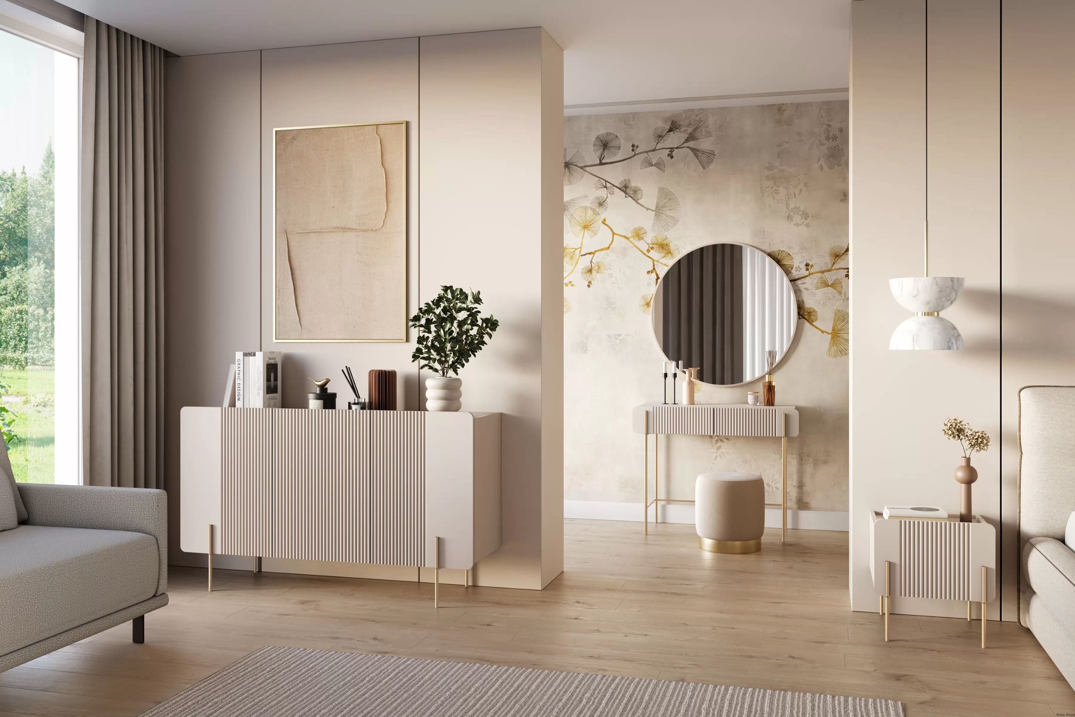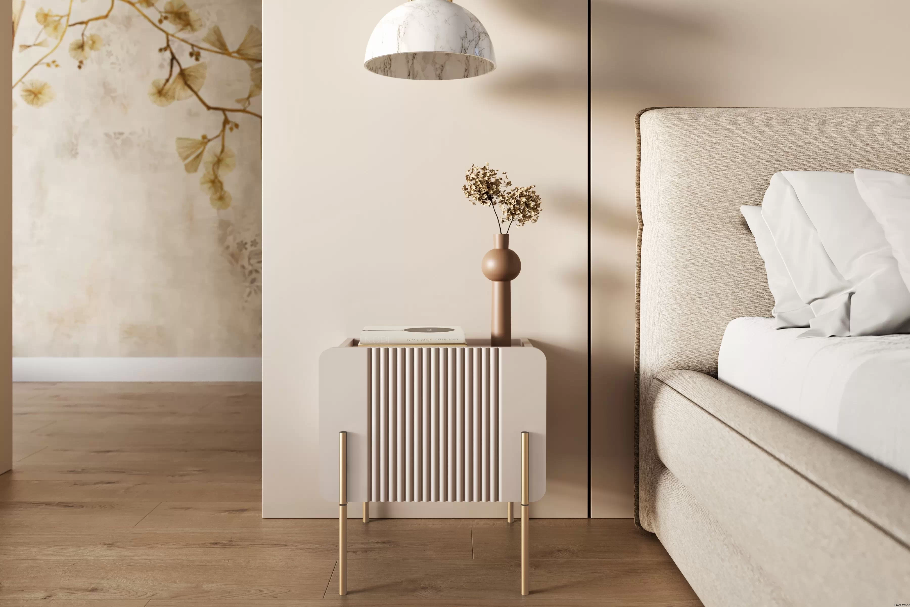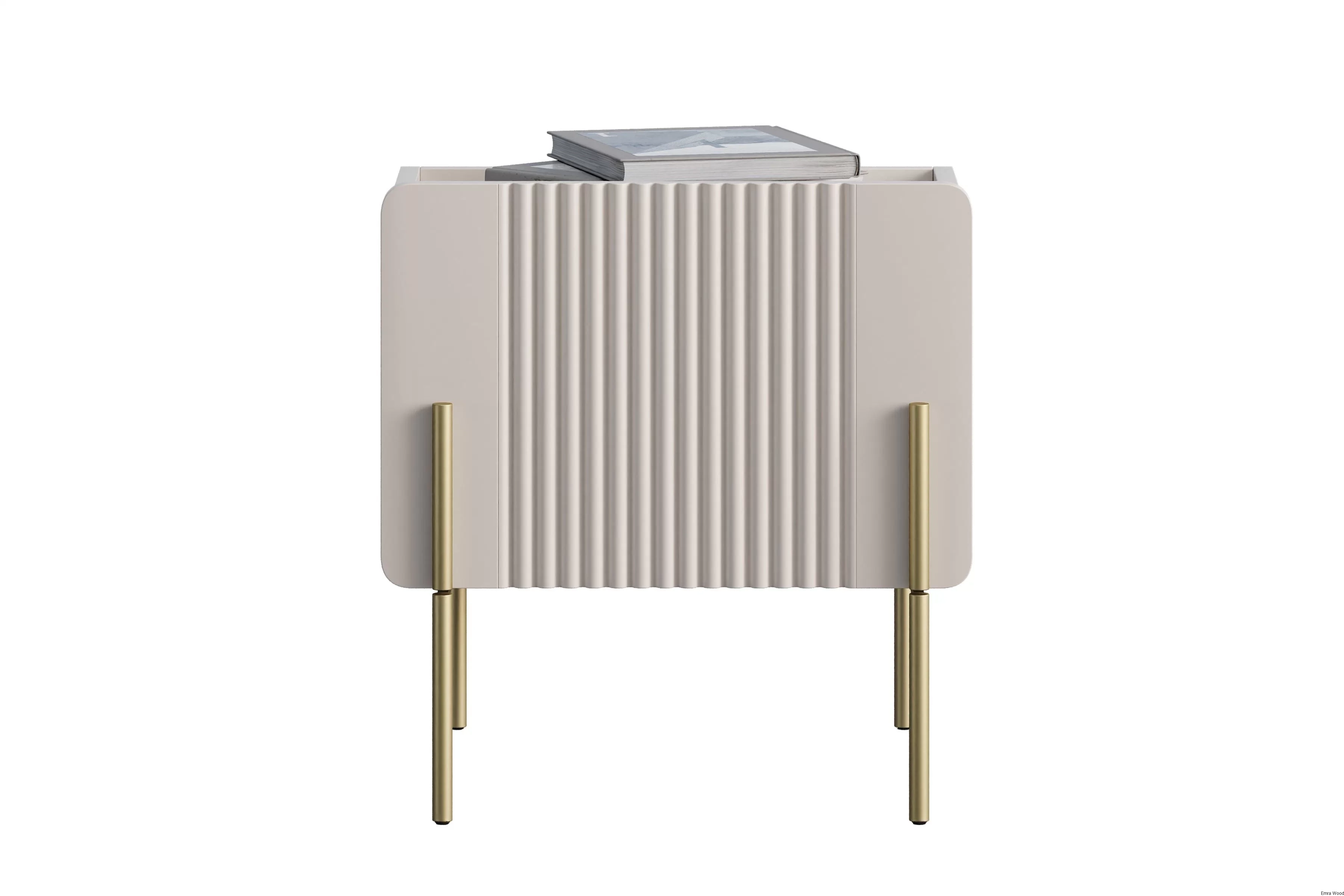 Wyjątkowy design tej szafki nocnej od razu przyciąga wzrok. Subtelna kolorystyka w odcieniu kaszmiru nadaje jej eleganckiego i stylowego charakteru. Złote nóżki dodają meblowi szczypty blasku i prestiżu.