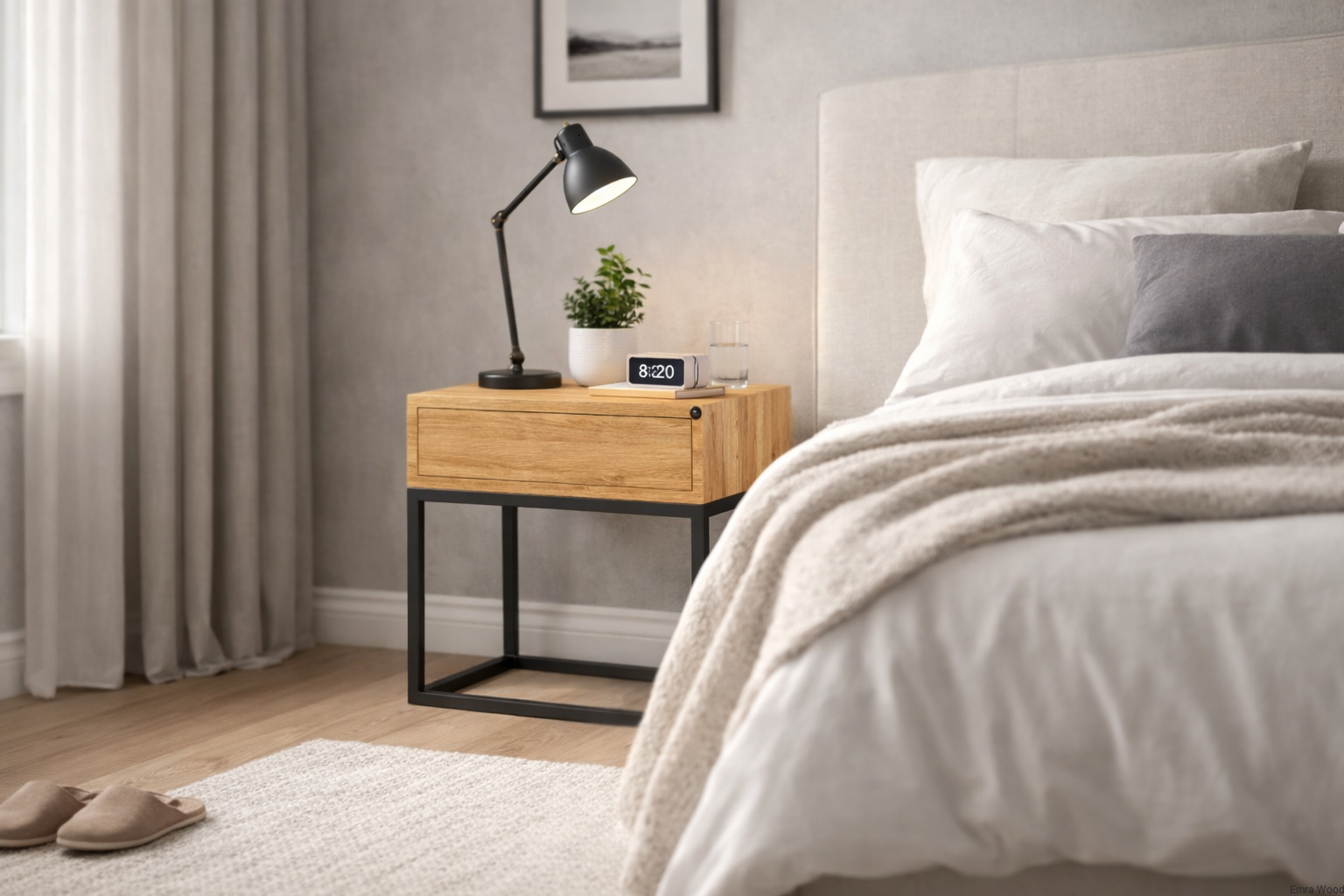 Dębowa szafka nocna to idealne połączenie nowoczesnego wzornictwa z tradycyjnym rzemiosłem. Wykonana z litego drewna dębowego i metalu.Prosta, geometryczna forma, precyzyjne linie i proporcje sprawiają, że dębowa szafka nocna doskonale pasuje do różnych stylów wnętrzarskich. Bez względu na to, czy urządzasz nowoczesną sypialnię, industrialny loft czy elegancką przestrzeń, szafka nocna stanie się doskonałym uzupełnieniem każdego wnętrza.