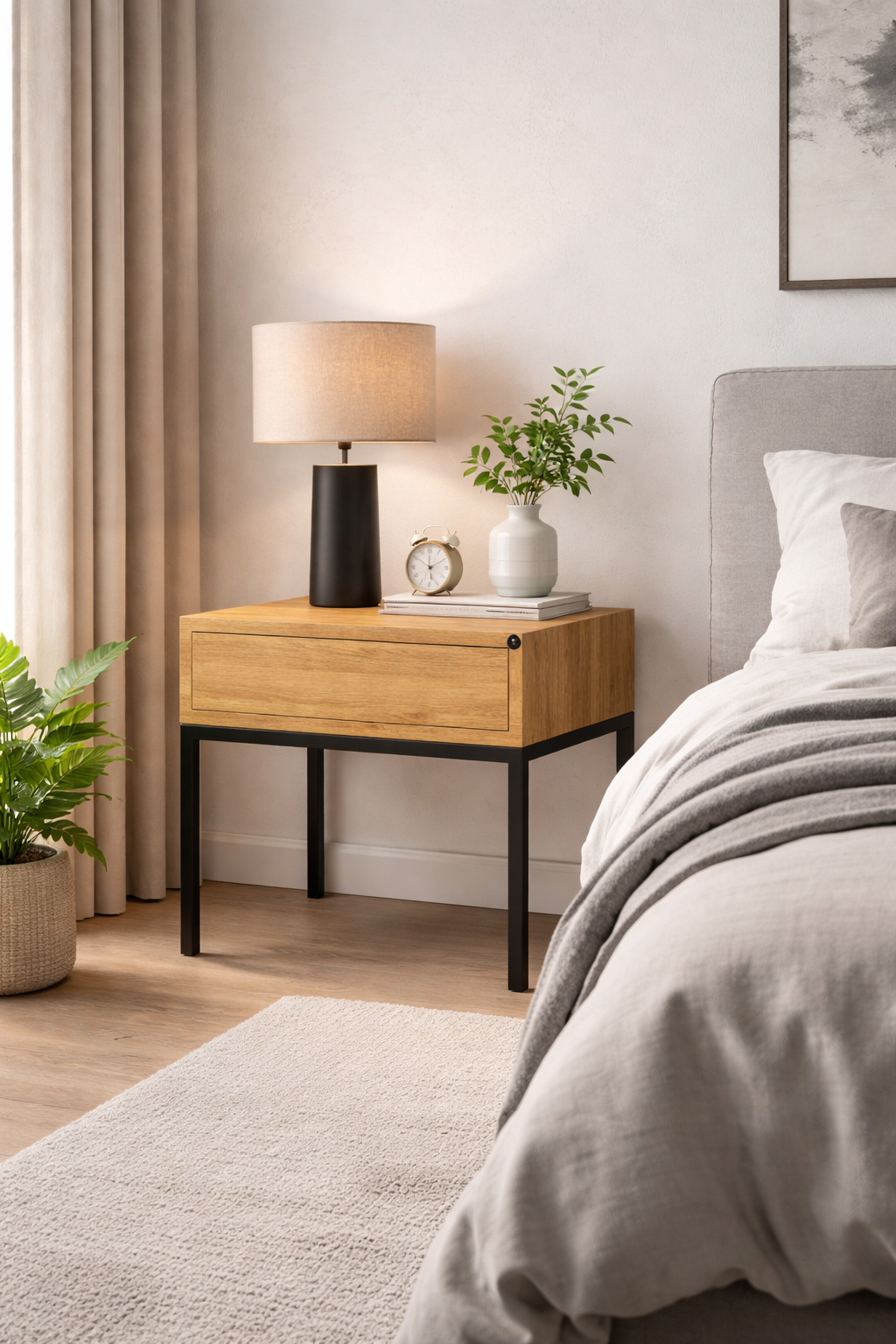 Dębowa szafka nocna to idealne połączenie nowoczesnego wzornictwa z tradycyjnym rzemiosłem. Wykonana z litego drewna dębowego i metalu.Prosta, geometryczna forma, precyzyjne linie i proporcje sprawiają, że dębowa szafka nocna doskonale pasuje do różnych stylów wnętrzarskich. Bez względu na to, czy urządzasz nowoczesną sypialnię, industrialny loft czy elegancką przestrzeń, szafka nocna stanie się doskonałym uzupełnieniem każdego wnętrza.