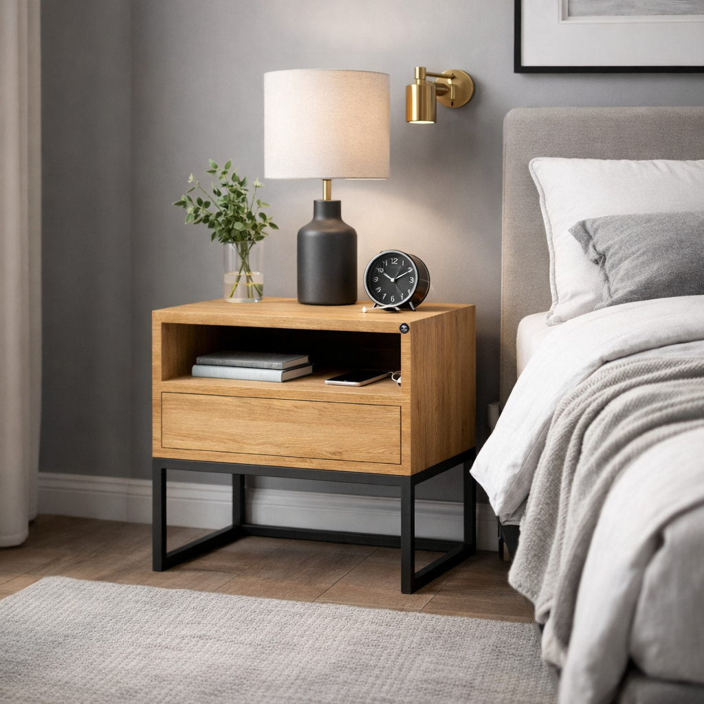 Dębowa szafka nocna to idealne połączenie nowoczesnego wzornictwa z tradycyjnym rzemiosłem. Wykonana z litego drewna dębowego i metalu.Prosta, geometryczna forma, precyzyjne linie i proporcje sprawiają, że dębowa szafka nocna doskonale pasuje do różnych stylów wnętrzarskich. Bez względu na to, czy urządzasz nowoczesną sypialnię, industrialny loft czy elegancką przestrzeń, szafka nocna stanie się doskonałym uzupełnieniem każdego wnętrza.