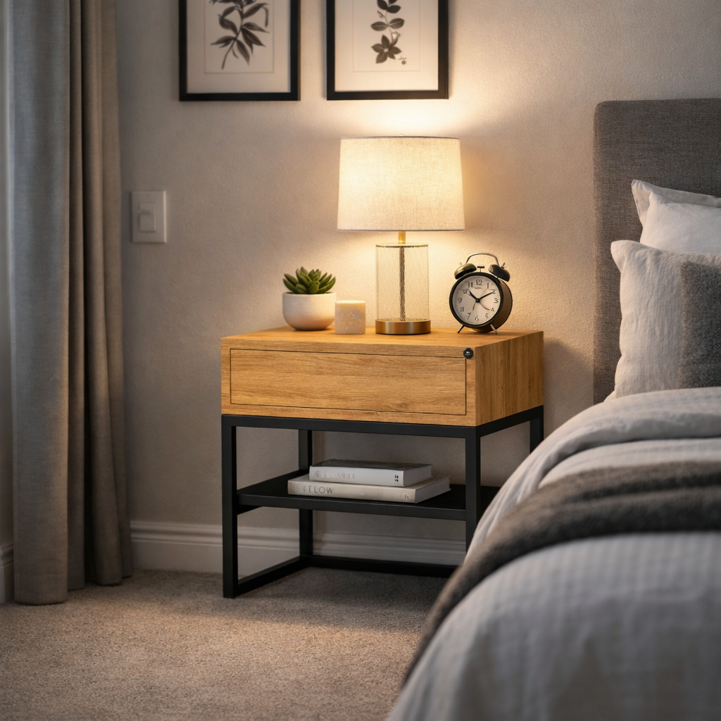 Dębowa szafka nocna to idealne połączenie nowoczesnego wzornictwa z tradycyjnym rzemiosłem. Wykonana z litego drewna dębowego i metalu.Prosta, geometryczna forma, precyzyjne linie i proporcje sprawiają, że dębowa szafka nocna doskonale pasuje do różnych stylów wnętrzarskich. Bez względu na to, czy urządzasz nowoczesną sypialnię, industrialny loft czy elegancką przestrzeń, szafka nocna stanie się doskonałym uzupełnieniem każdego wnętrza.