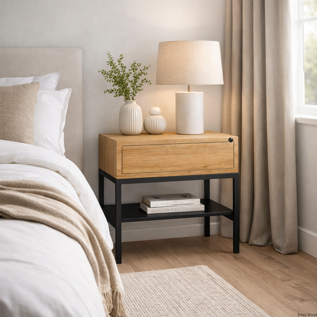 Dębowa szafka nocna to idealne połączenie nowoczesnego wzornictwa z tradycyjnym rzemiosłem. Wykonana z litego drewna dębowego i metalu.Prosta, geometryczna forma, precyzyjne linie i proporcje sprawiają, że dębowa szafka nocna doskonale pasuje do różnych stylów wnętrzarskich. Bez względu na to, czy urządzasz nowoczesną sypialnię, industrialny loft czy elegancką przestrzeń, szafka nocna stanie się doskonałym uzupełnieniem każdego wnętrza.