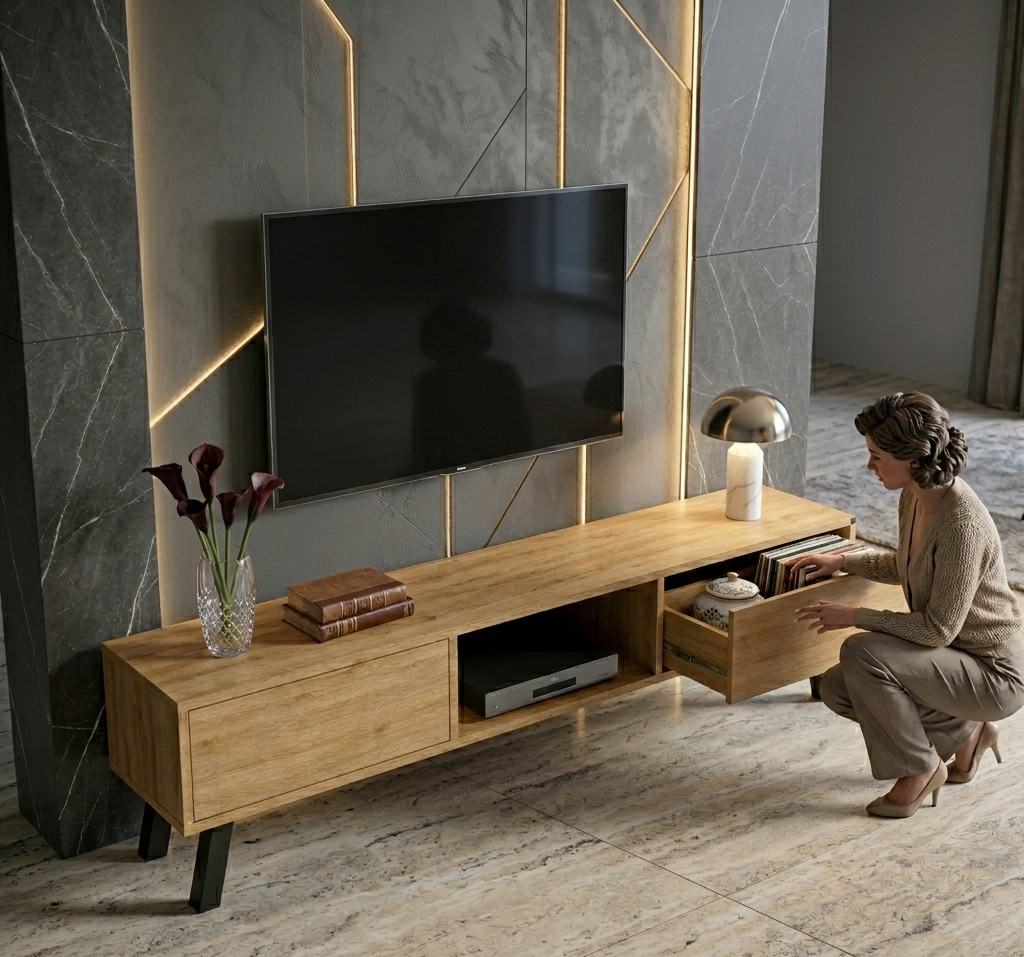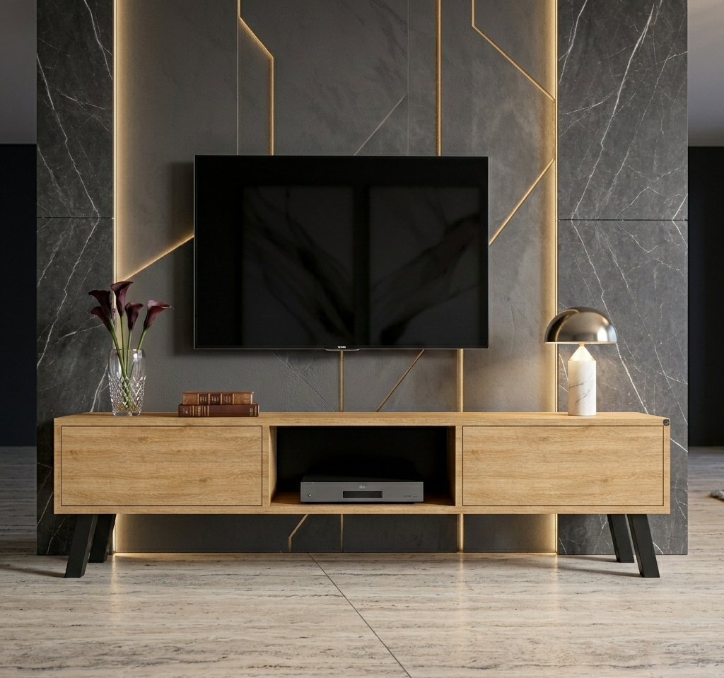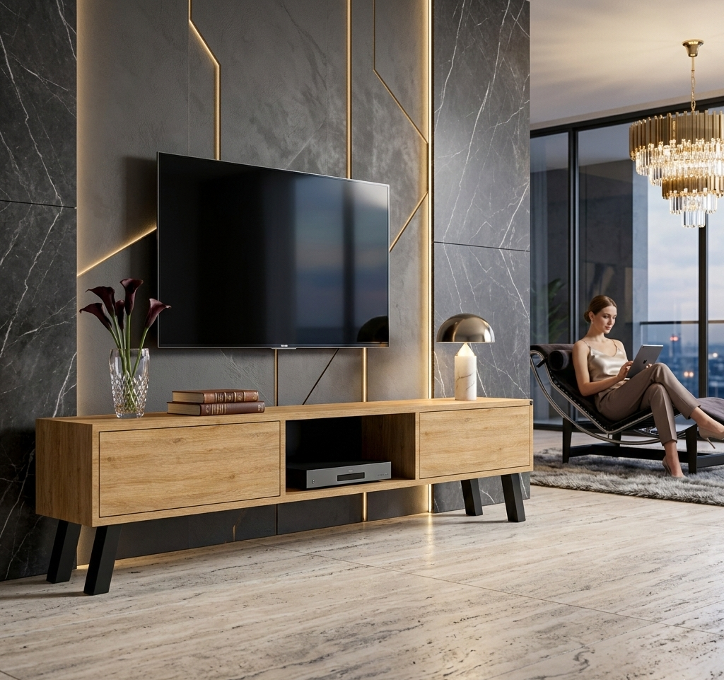 SZAFKA RTV / Gatunek Drewna DĄB LOFT / / Stelaż Naturalny Lakier / noga metalowa czarna / model RTV-19