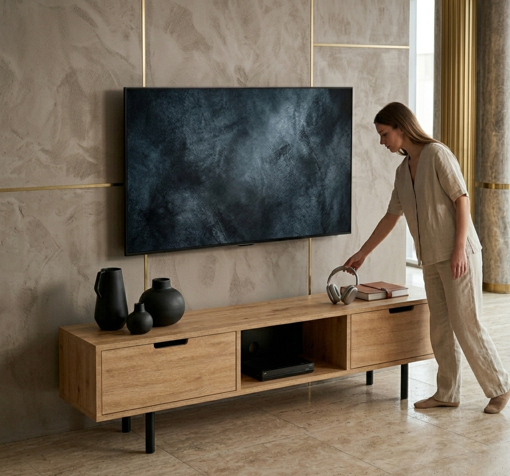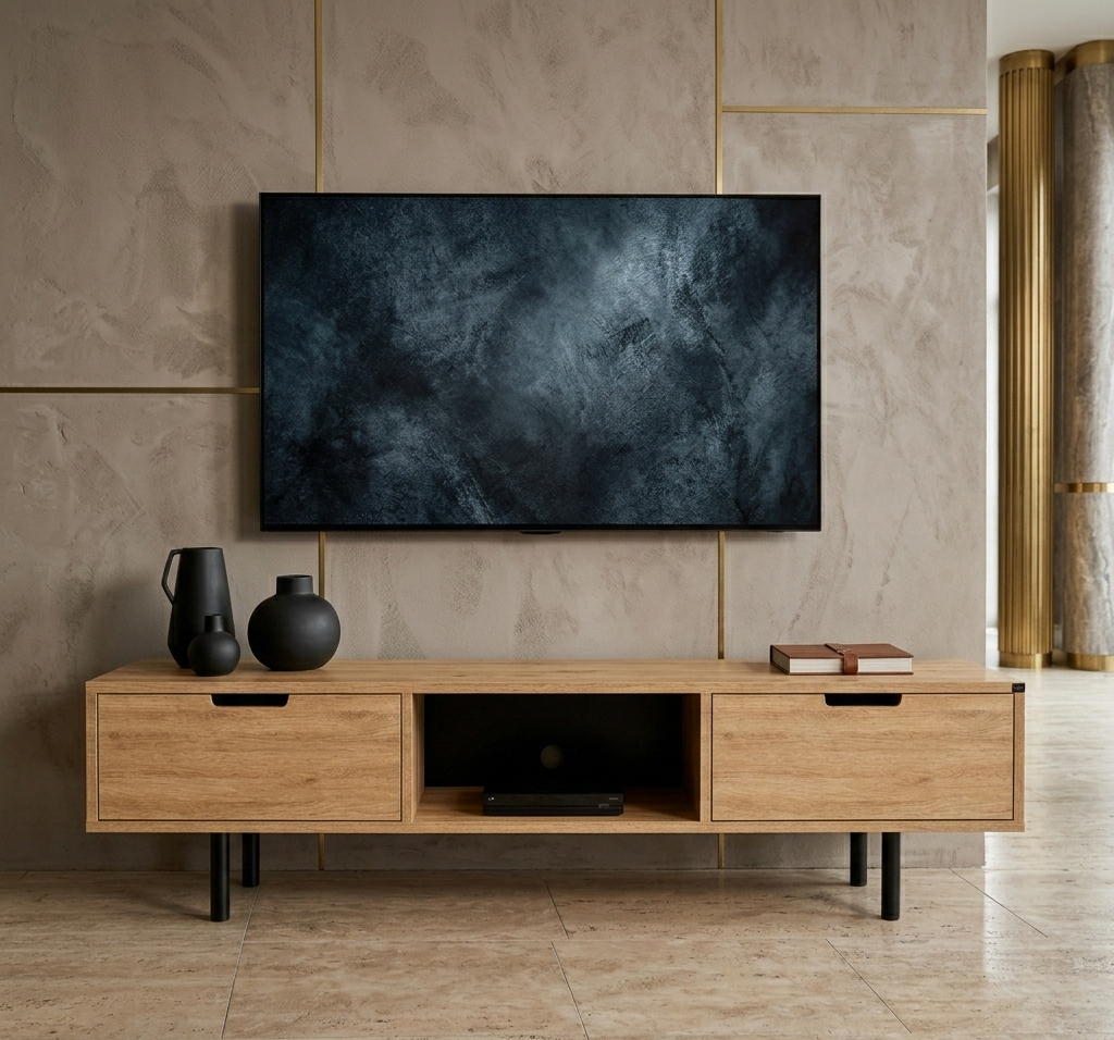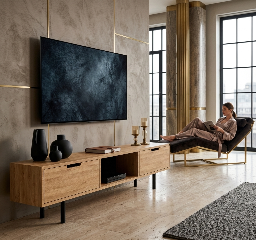 SZAFKA RTV / Gatunek Drewna DĄB LOFT / / Stelaż Naturalny Lakier / noga metalowa czarna / model RTV-27