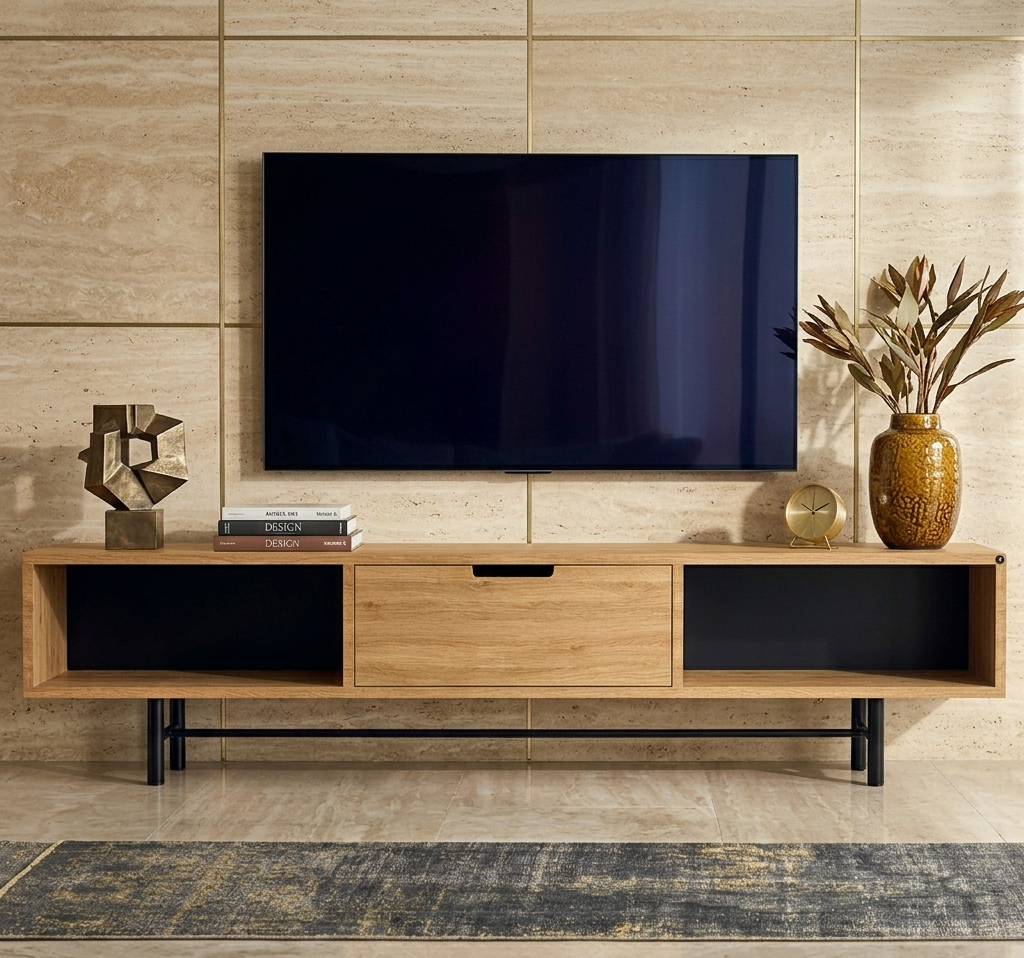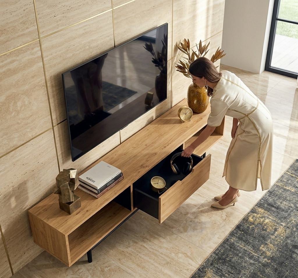 SZAFKA RTV / Gatunek Drewna DĄB LOFT / / Stelaż Naturalny Lakier / noga metalowa czarna / model RTV-69