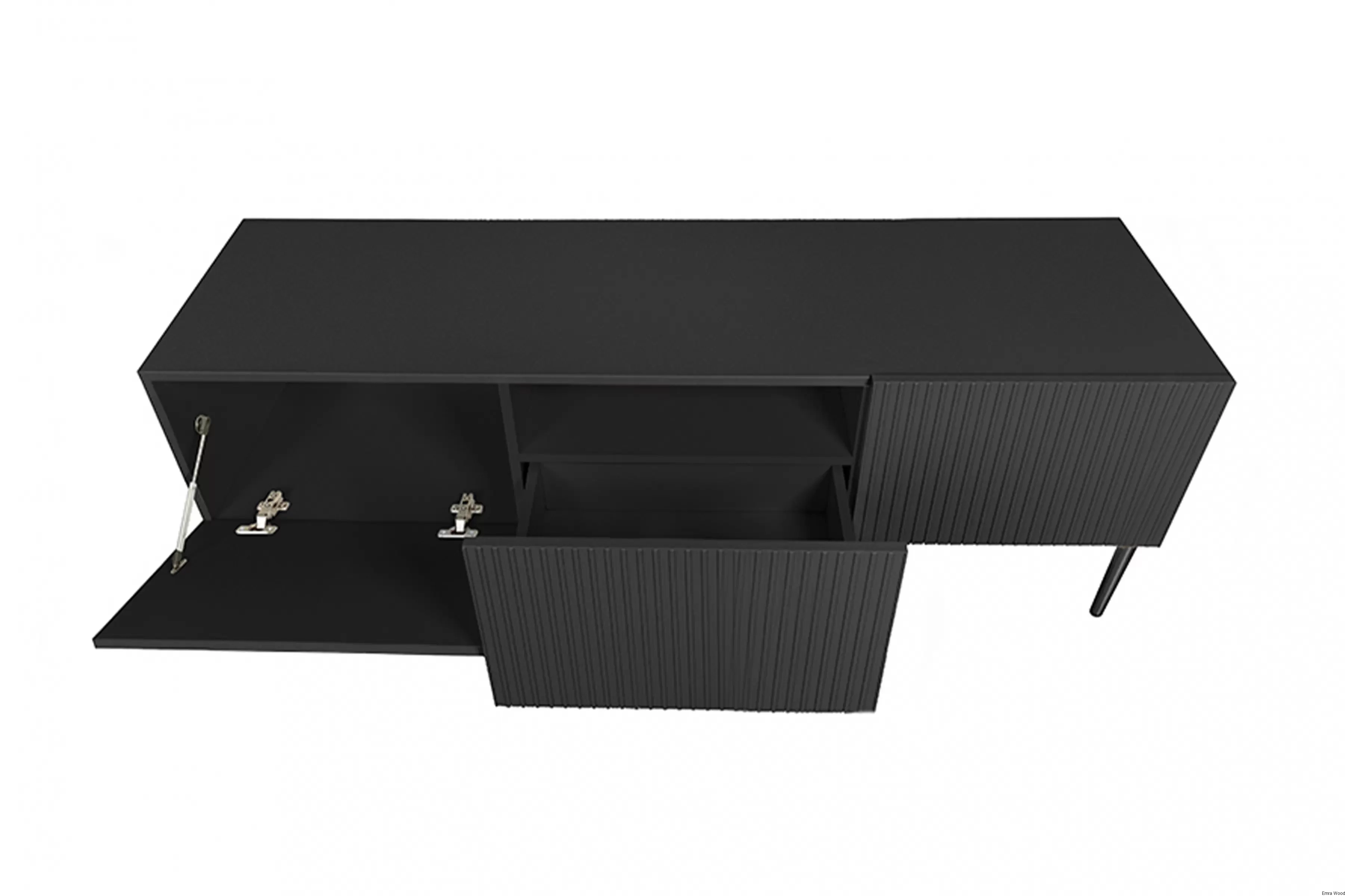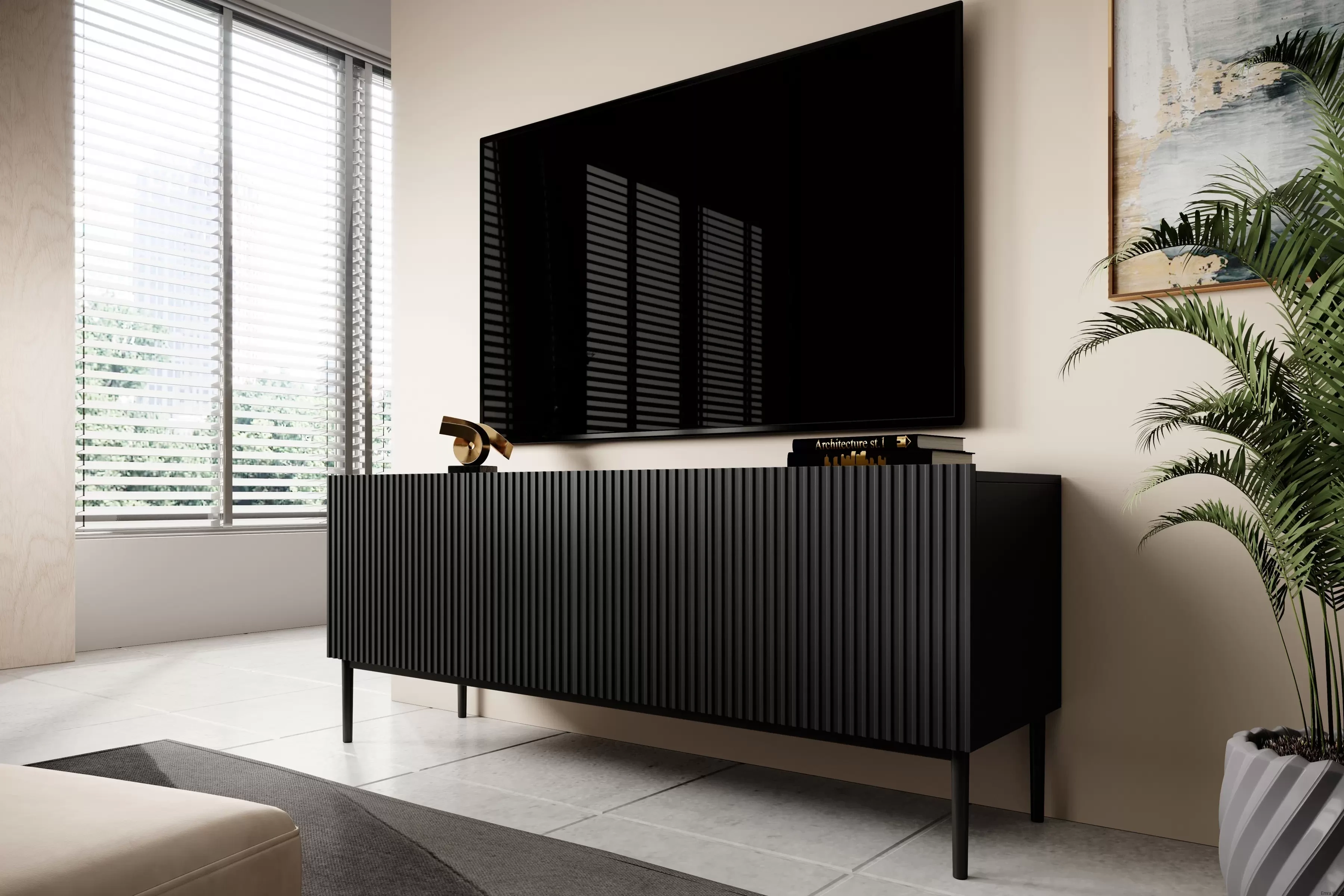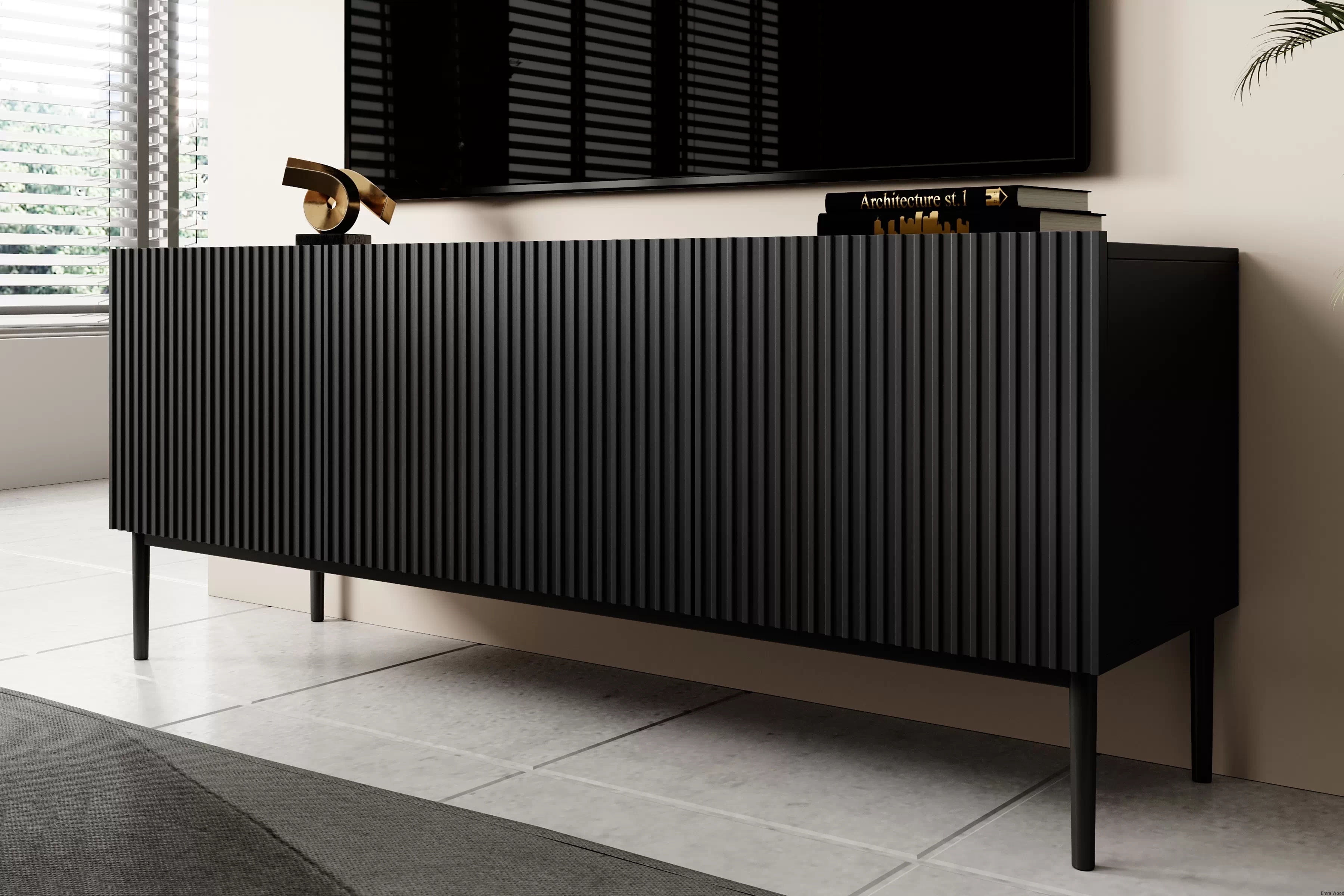 Wyróżnia się wyrafinowanym designem, który podkreśla czarne, matowe wykończenie. Metalowe nogi w tym samym odcieniu dodają jej niepowtarzalnego charakteru. To połączenie sprawia, że mebel ten stanie się nie tylko funkcjonalnym elementem wyposażenia, ale także prawdziwą ozdobą Twojego salonu.
