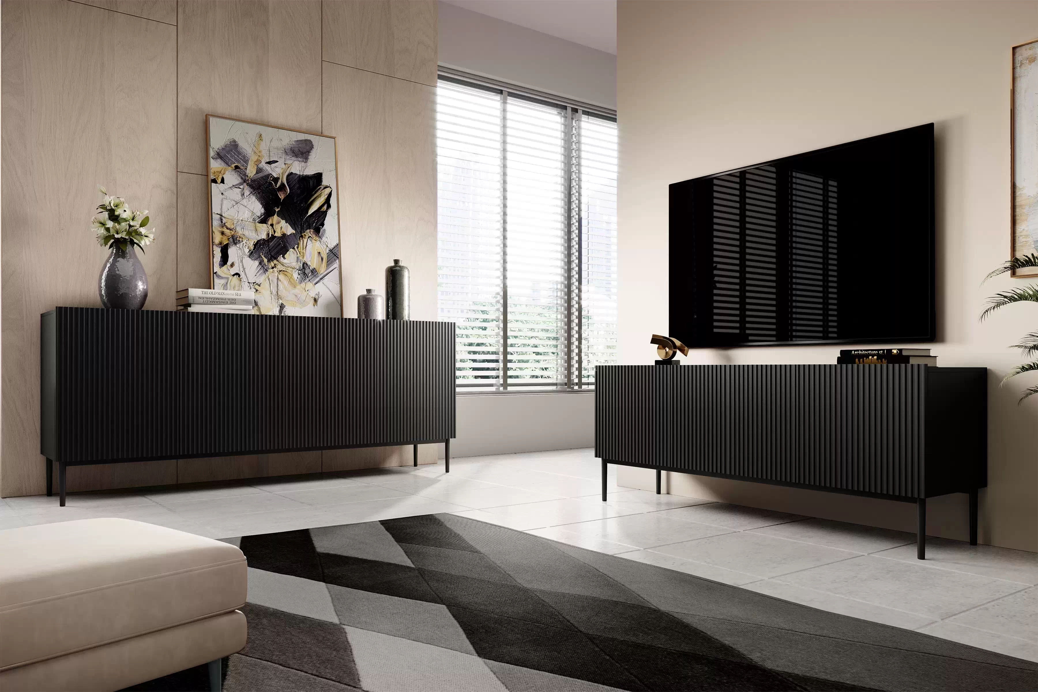 Szafka RTV Nicole idealnie wpisuje się w styl minimalistyczny, industrialny, a także nowoczesny. Świetnie komponuje się z innymi meblami w kolorze czarnym, ale także z elementami w odcieniach szarości czy bieli. To mebel, który doskonale odnajdzie się w każdym wnętrzu.