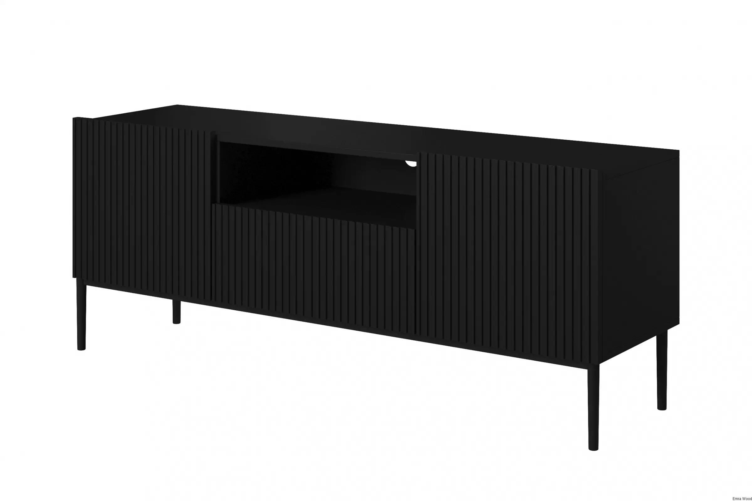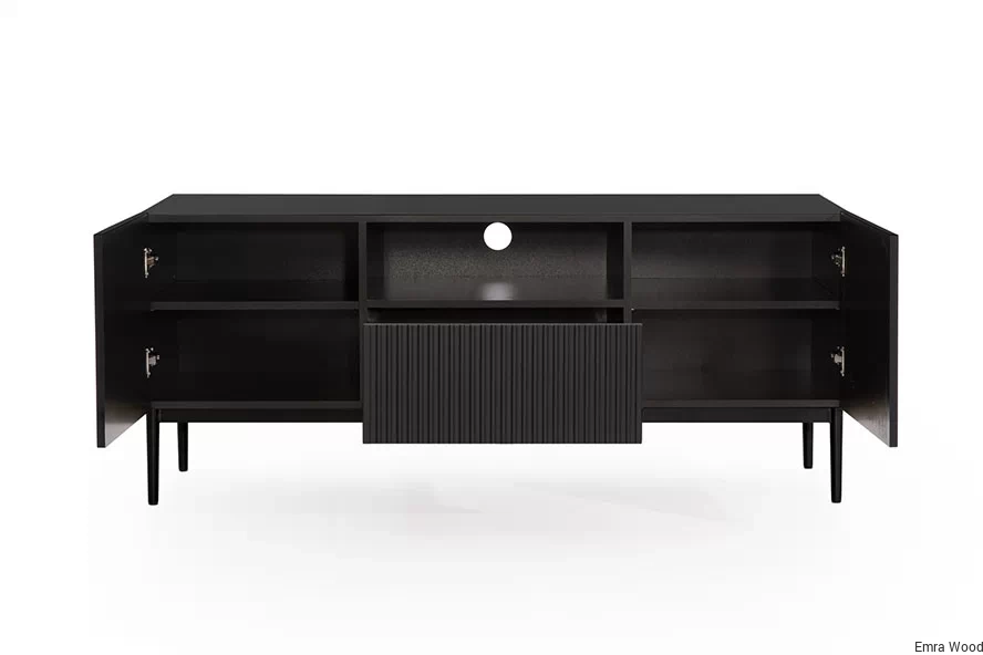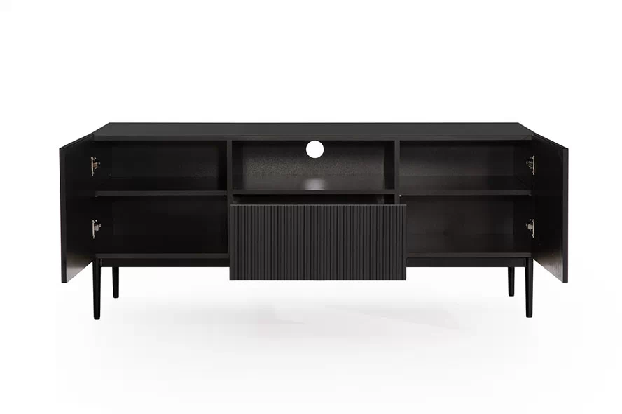 Szukasz idealnej szafki RTV do Twojego nowoczesnego salonu? Poznaj Szafkę RTV Nicole 150 cm z szufladą i wnęką - czarny mat / czarne nóżki.