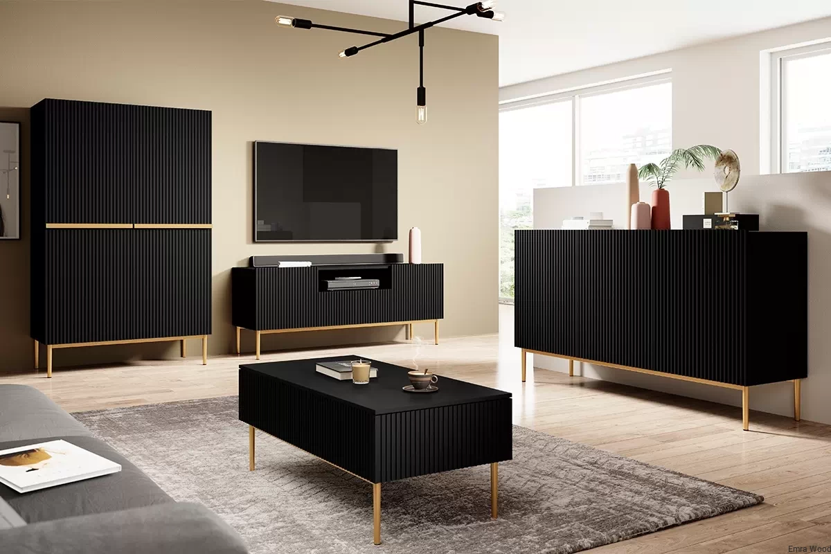 Wyobraź sobie elegancką, czarną matową powierzchnię, która dodaje klasy każdemu pomieszczeniu. Złote, metalowe nóżki dodają szafce RTV szczyptę luksusu. Wygląd tego mebla to połączenie nowoczesności z elegancją, które z pewnością przyciągnie wzrok każdego gościa.
